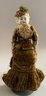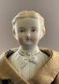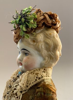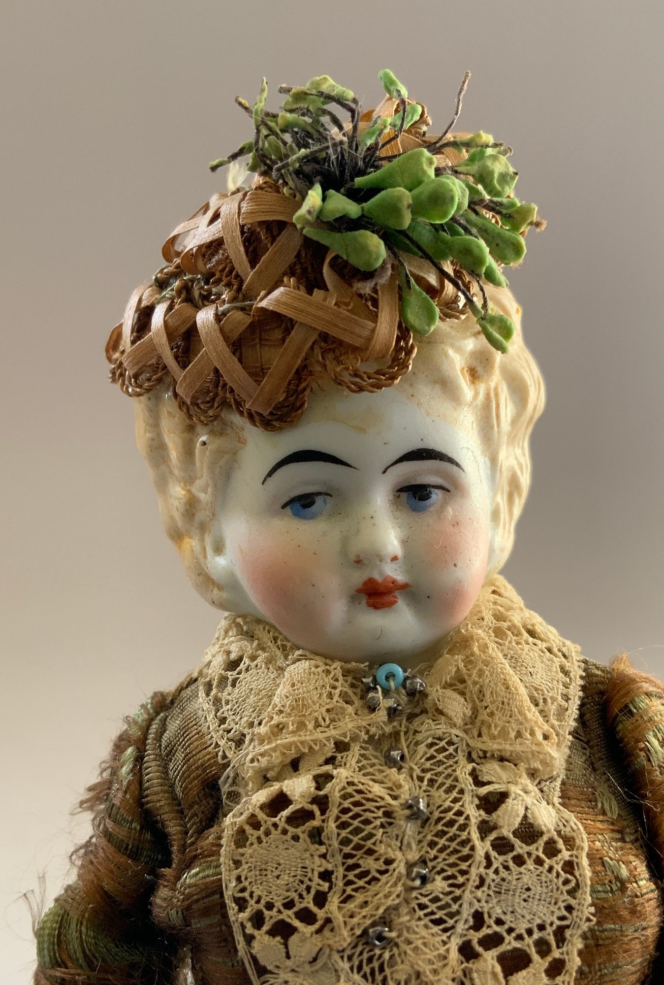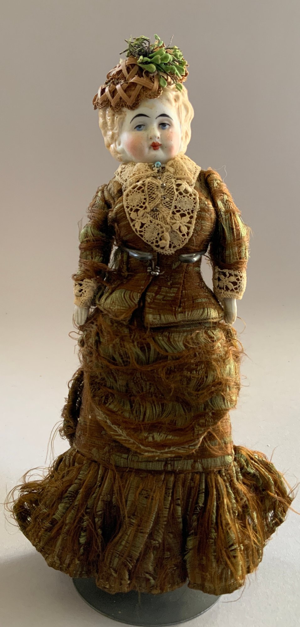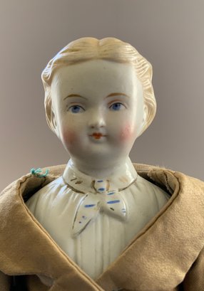 2 – Blonde hair Parian shoulder head dolls with painted features, 1 – 10 ½” molded bodice boy, cloth body, parian limbs, brown silk suit, & 1 – 8” sculpted hair, cloth body with parian limbs, silk walking suit (melting)