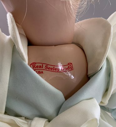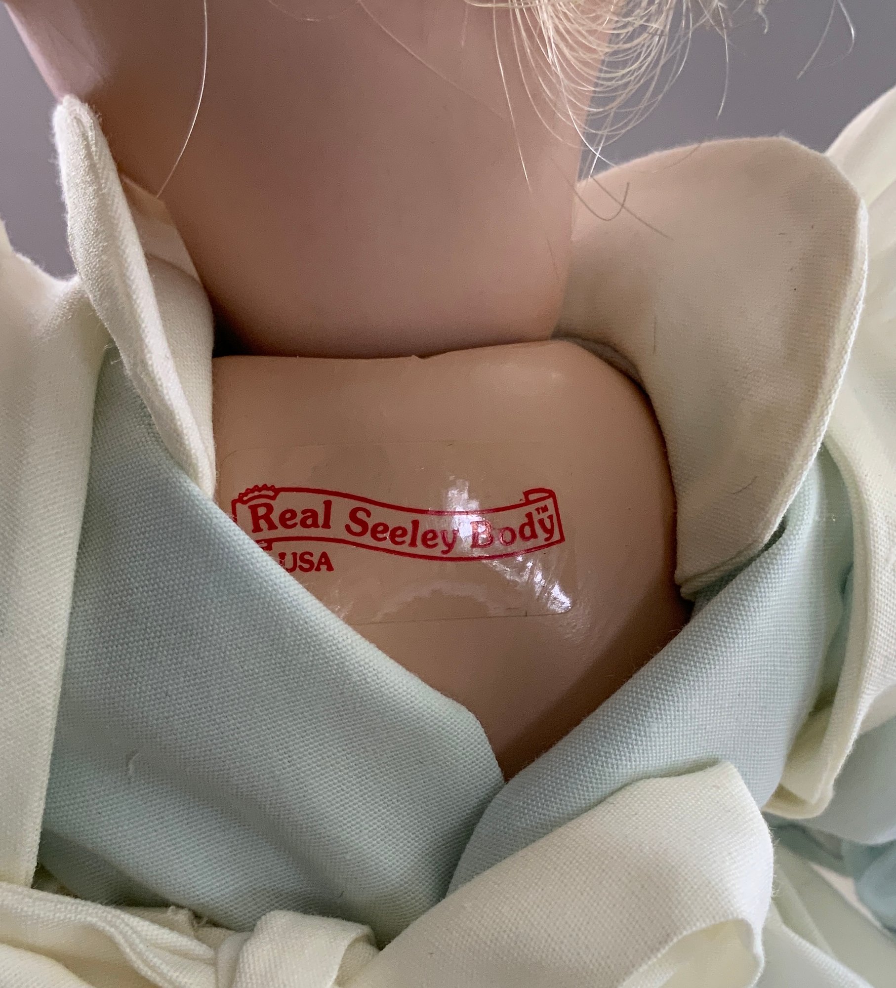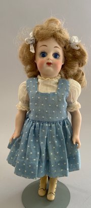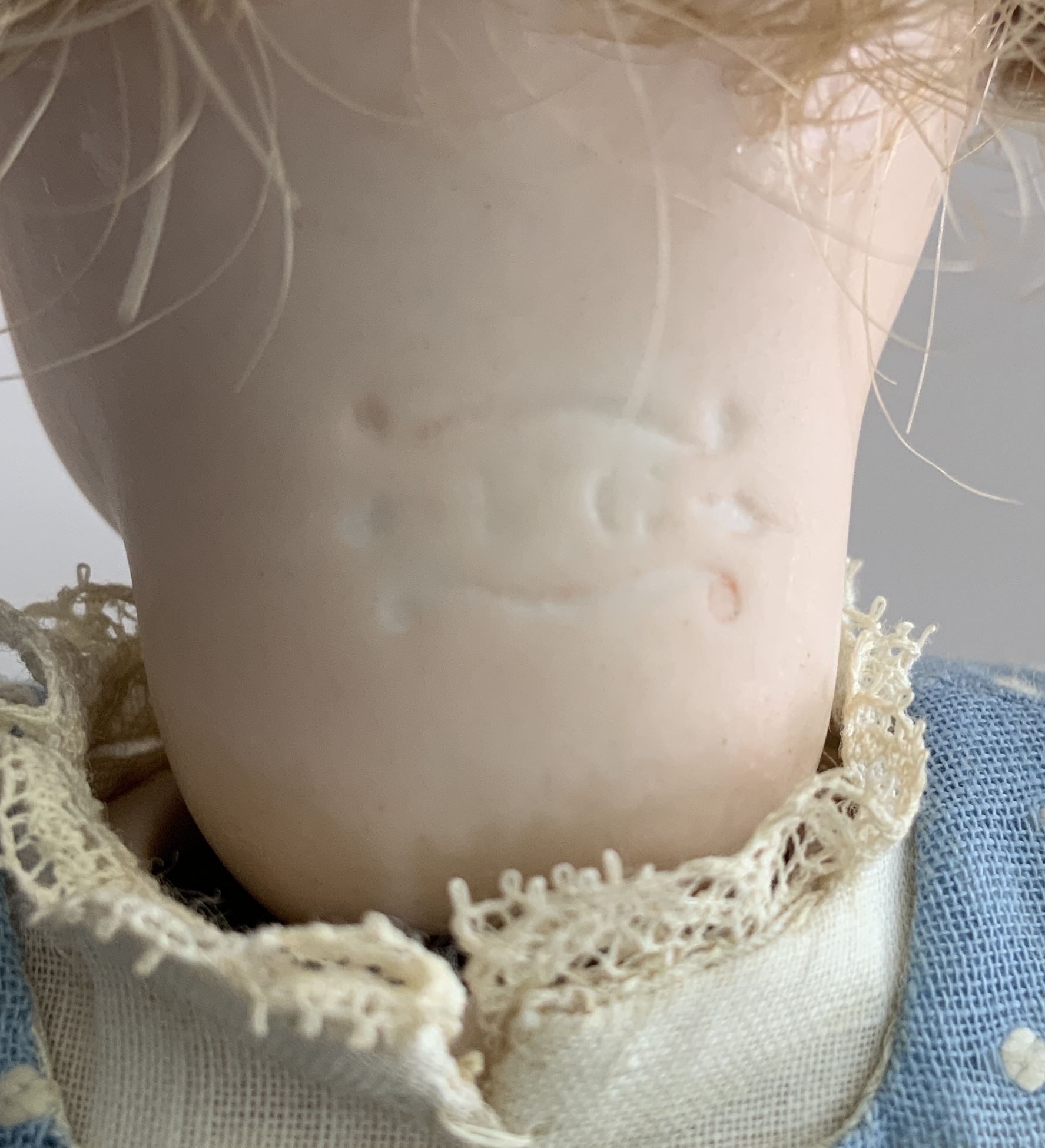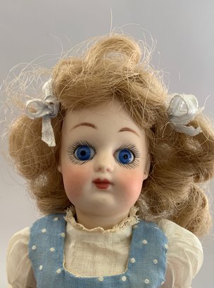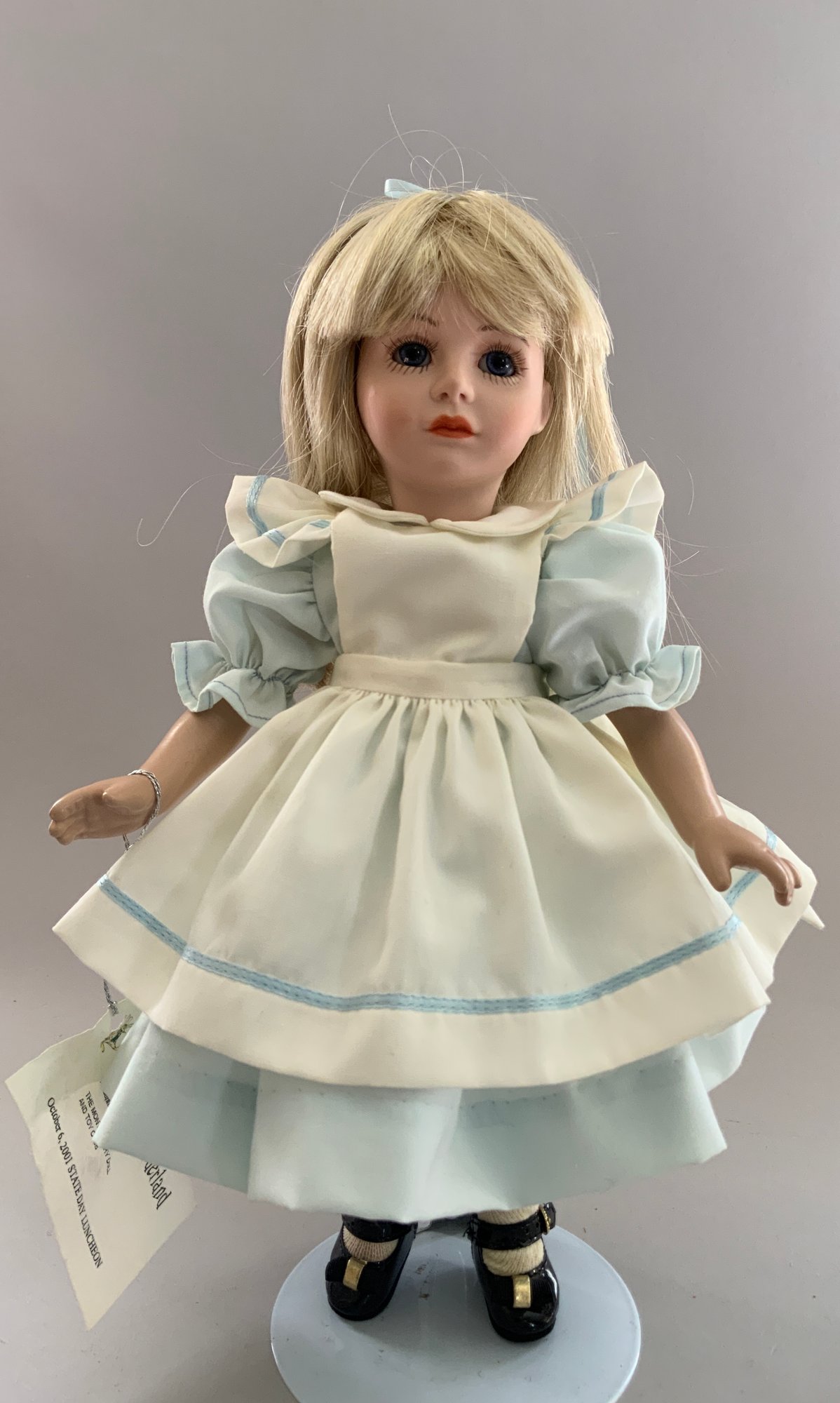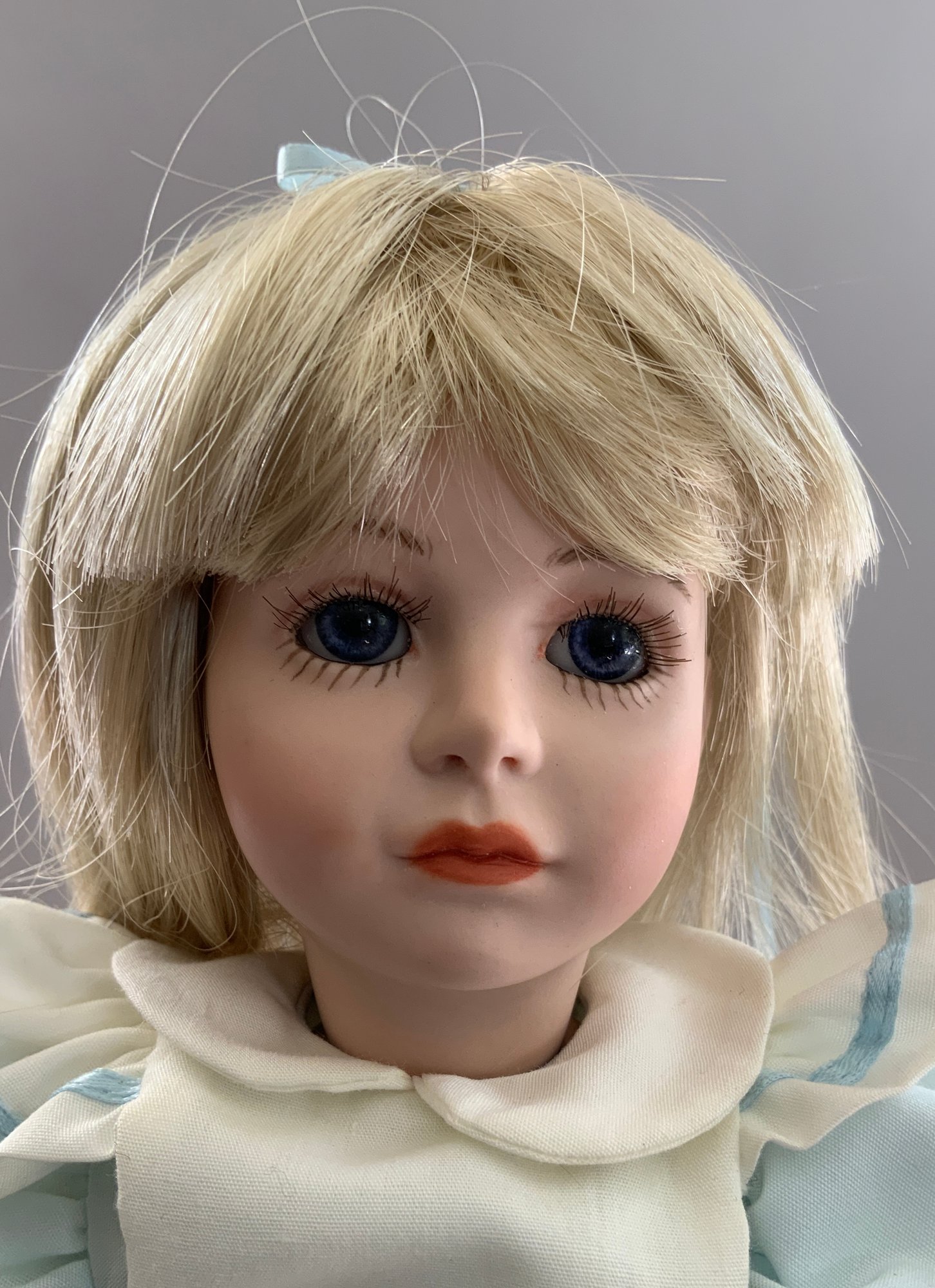 2 – Dolls, 1 – 13” Bisque artist convention doll, blue glass eyes, CM, blonde synthetic wig, Seeley compo body, & 9” all bisque artist doll, blue glass eyes, CM, blonde synthetic wig, blue dress