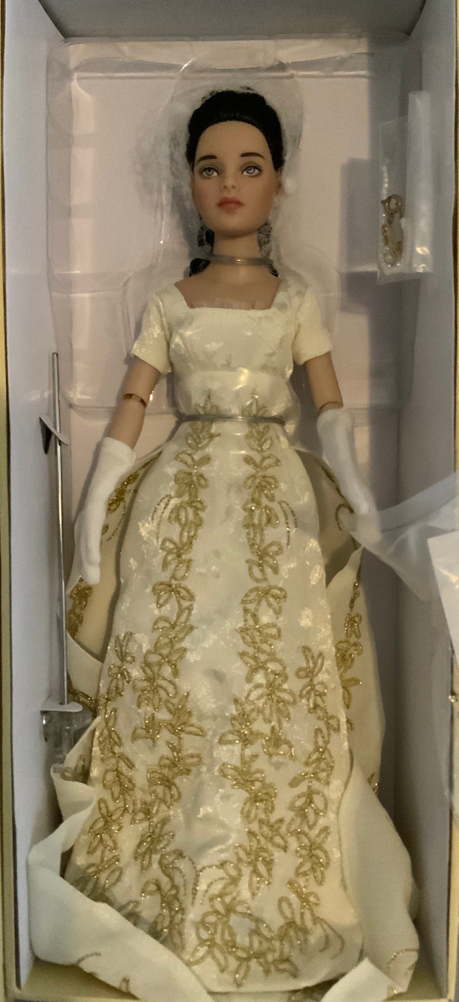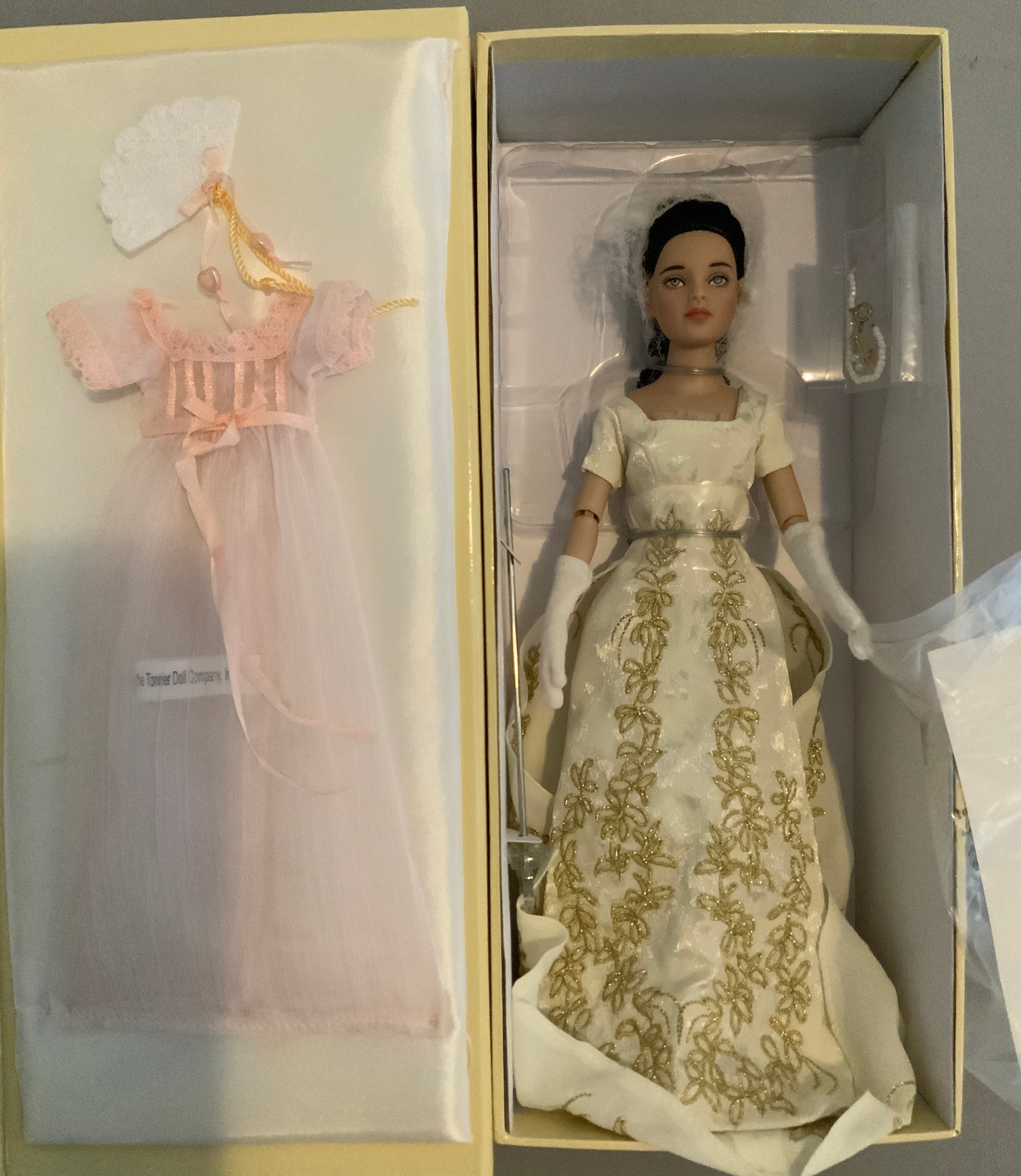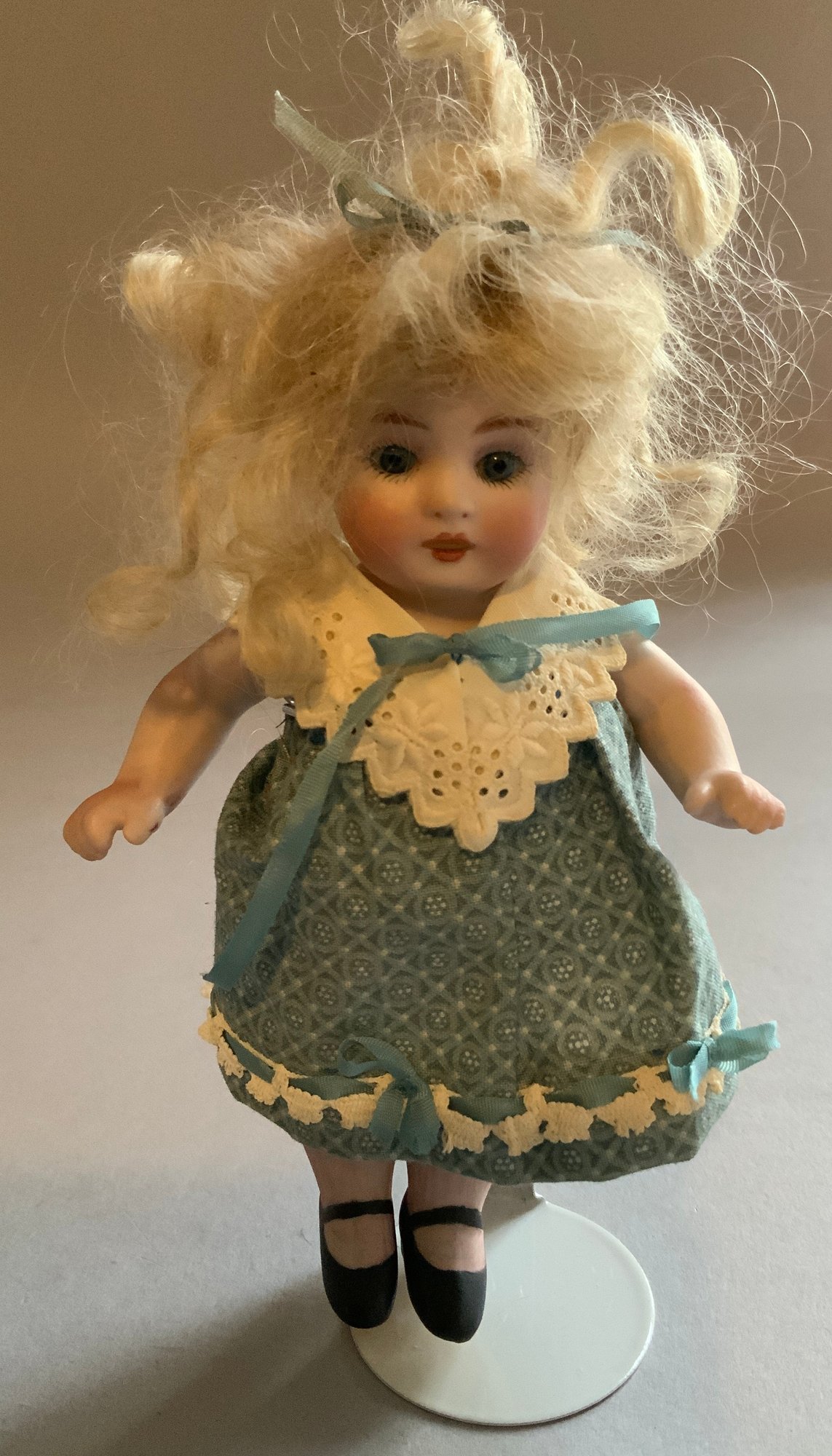 2 – Dolls, 1 – UFDC 2013 Tonner doll A Capitol Affair in original box & 1 – 6” all bisque 83/125, blue glass eyes, OM, blonde mohair wig, blue dress
