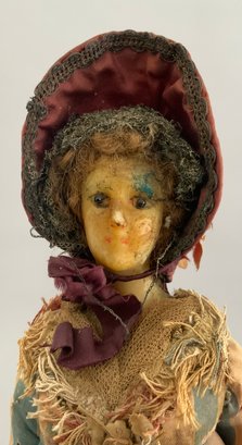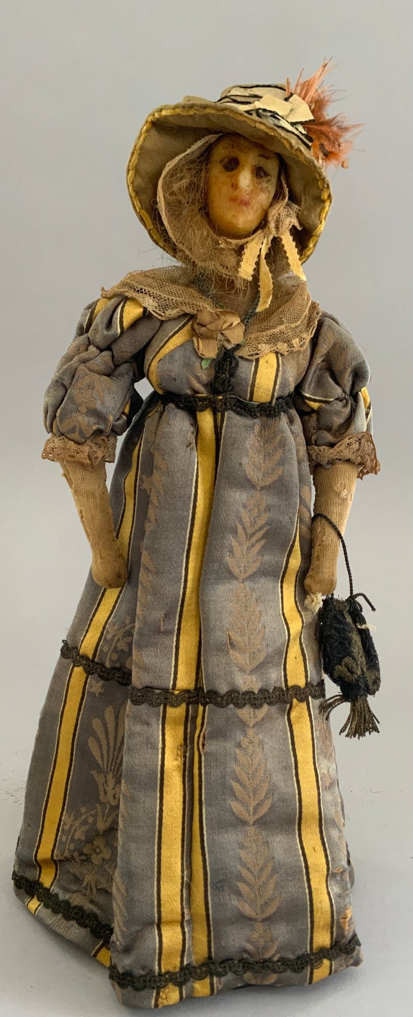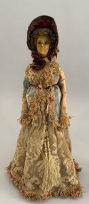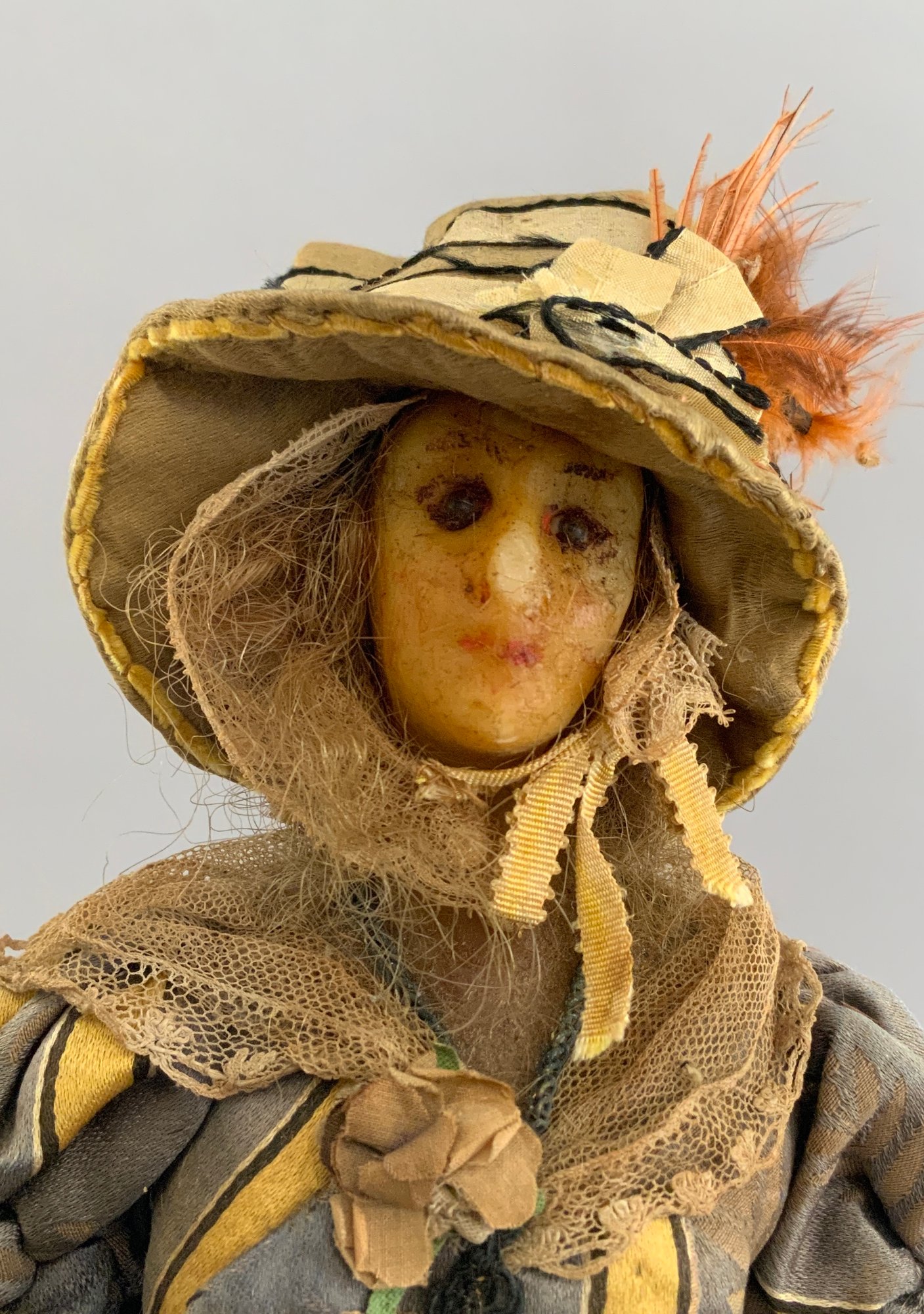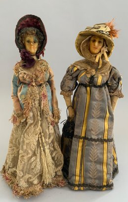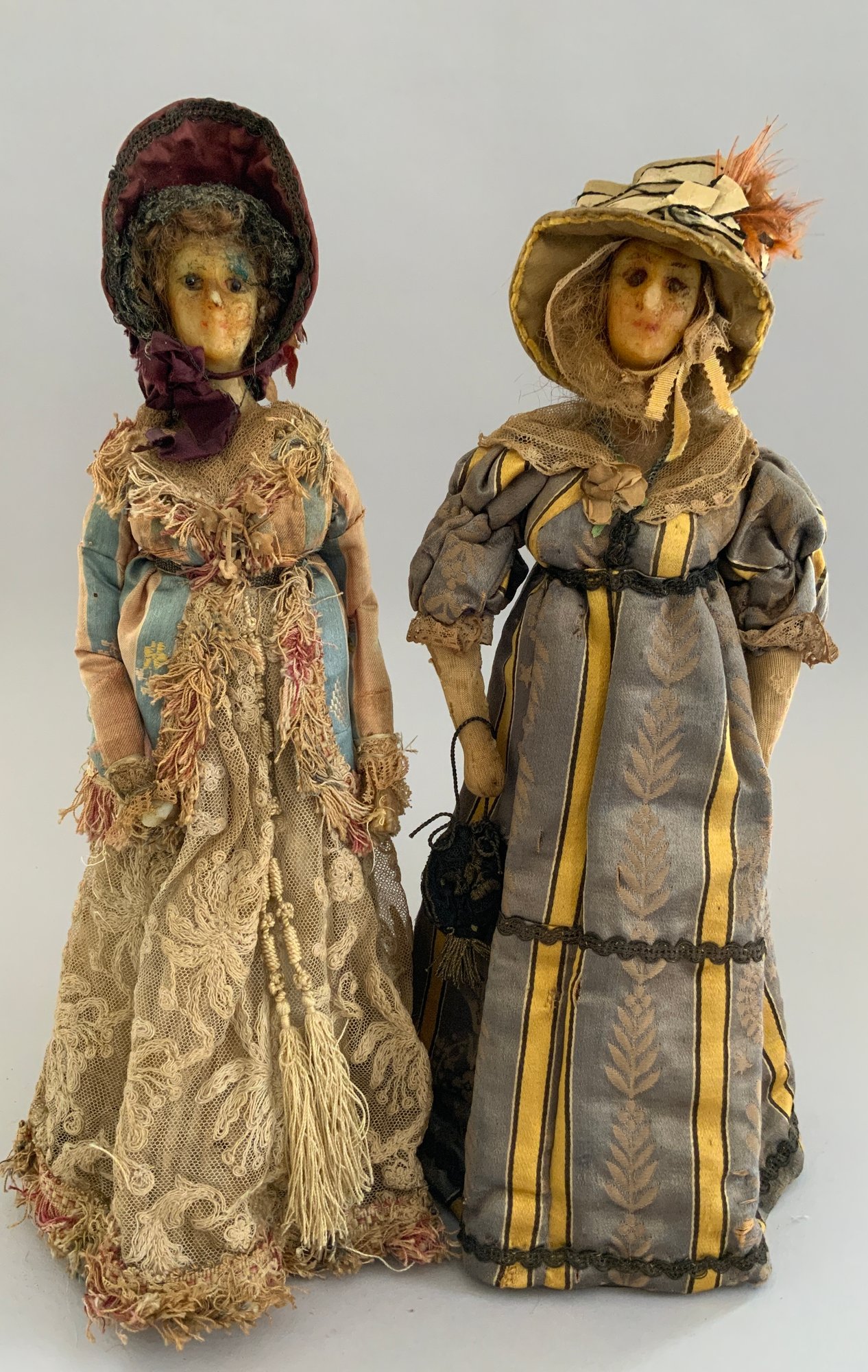 2 – Early wax shoulder head dolls, European, 1- 14” blue pupil eyes, blonde hair, cloth body with hard wax arms, yellow/gray dress (wear & stains, wax wear), & 1 – 14” blue pupil eyes, blonde hair, cloth body with wax arms, silk & crewel needlework dress, ( wear & melting, wax wear), in the style of Lafitte Desirat