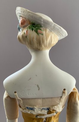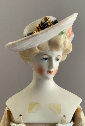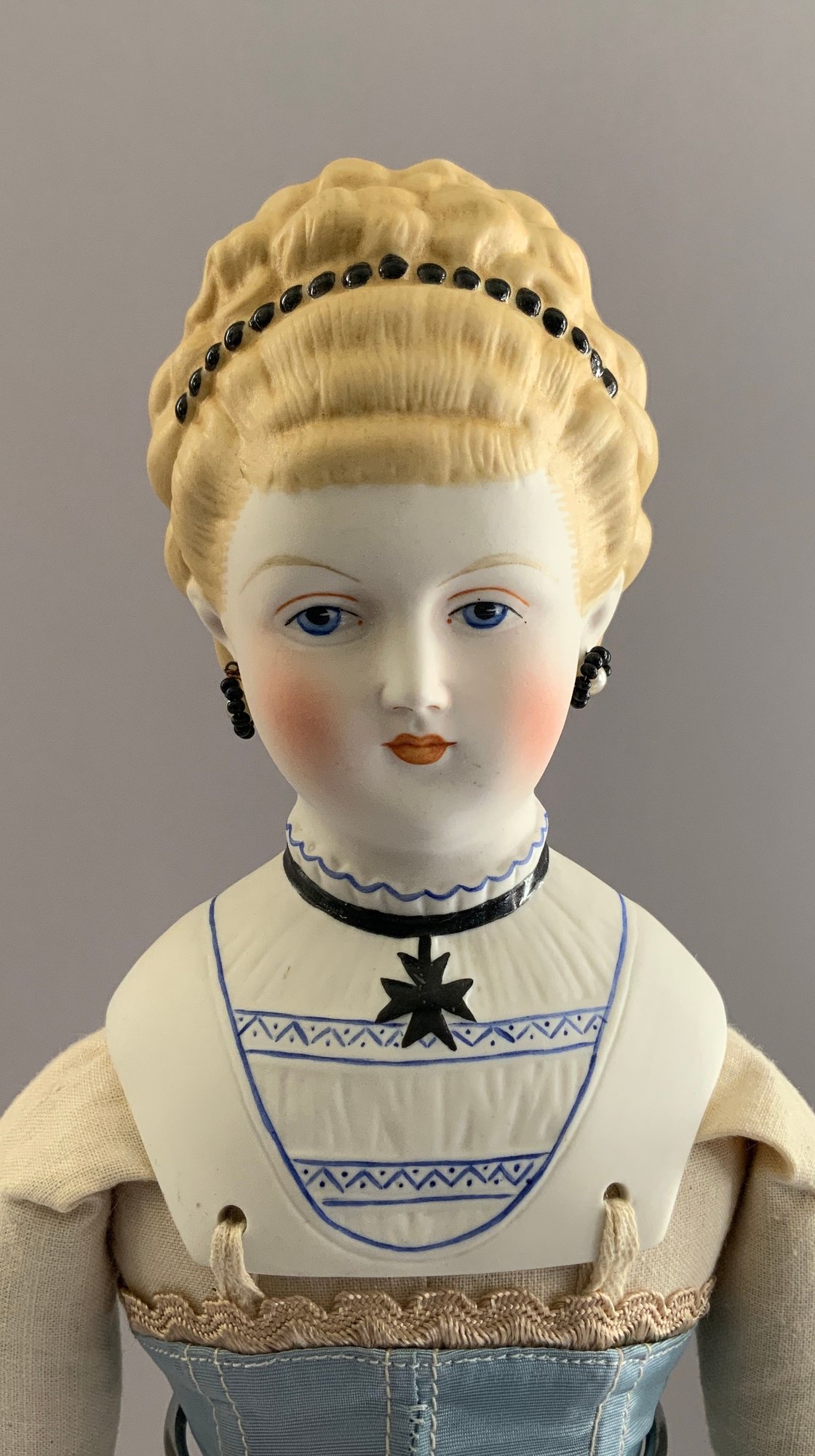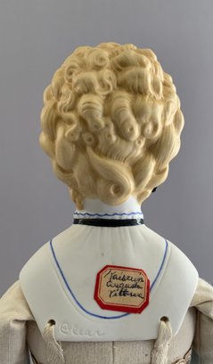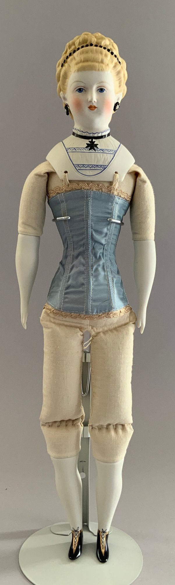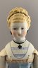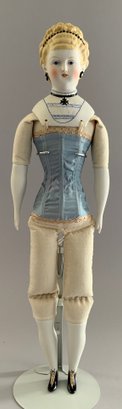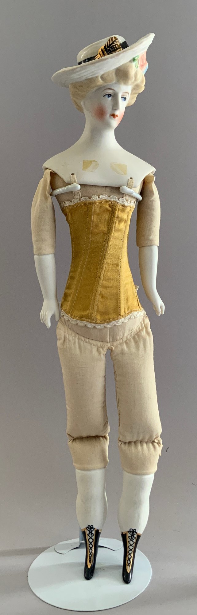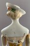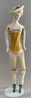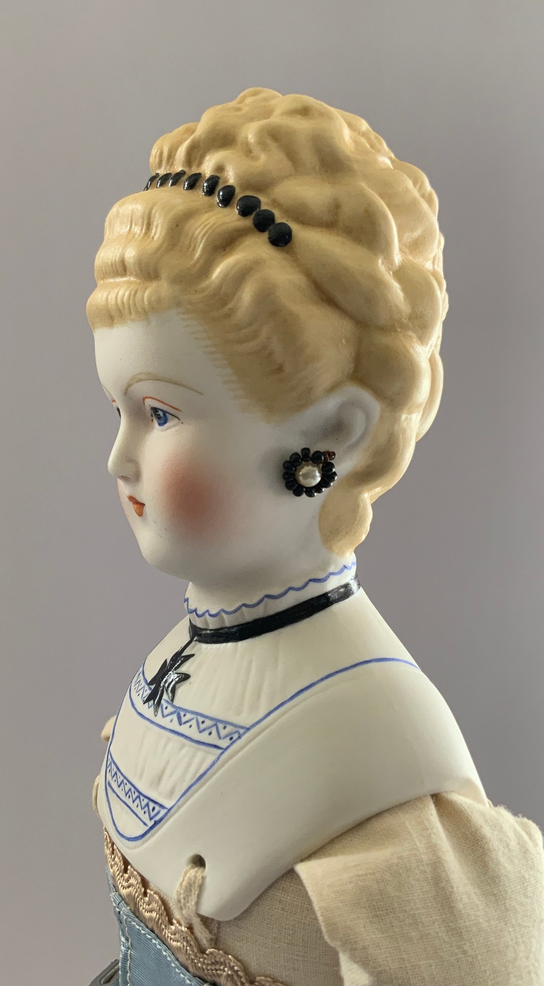 2 – Emma Clear Parian artist dolls, 1 – 18” blonde sculpted hair with black beaded band, painted features, PE, fancy bodice, cloth body with parian limbs, black/gold boots, blue corset, & 1 – 18” blonde sculpted hair with flowers & hat, painted features, cloth body with parian limbs, black/gold boots, gold corset