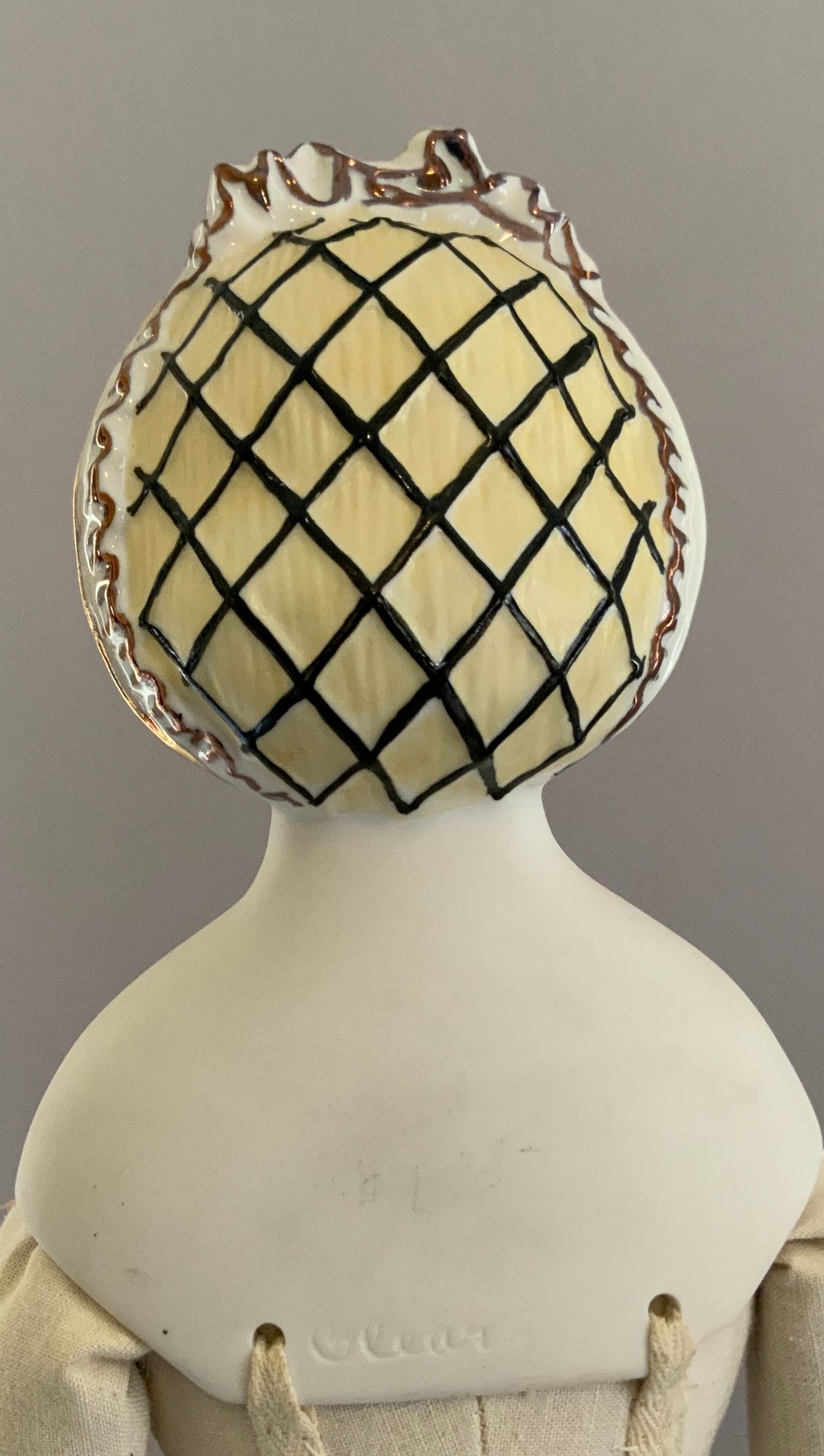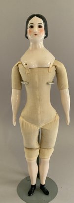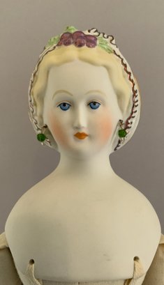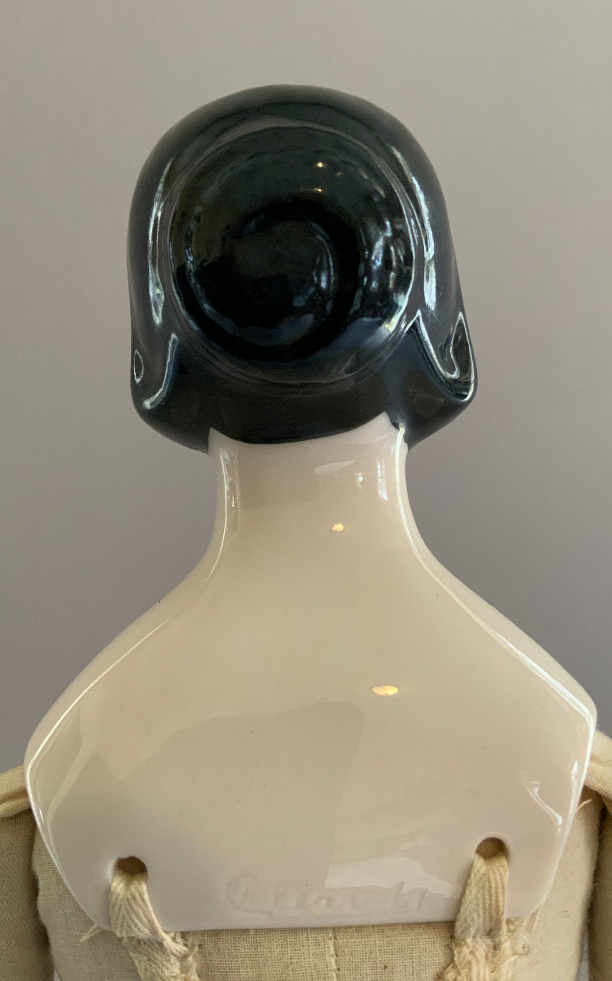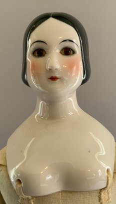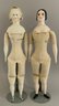 2 - Emma Clear shoulder head artist doll, painted features, cloth body with parian/china limbs, 1 – 17 ½” parian, with sculpted blonde hair & hair snood, PE, fancy hair band, no clothes, & 1 – 18” black hair china, center part with bun, brown glass eyes, no clothes