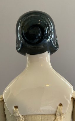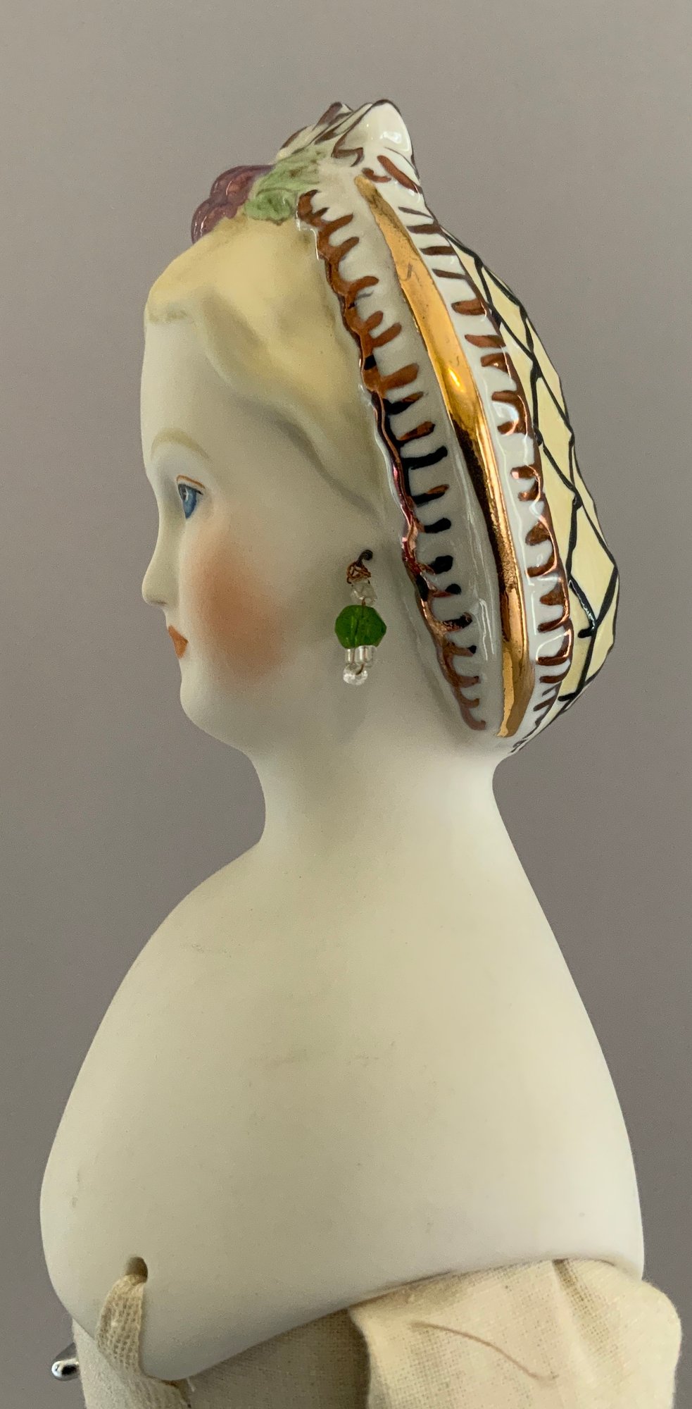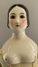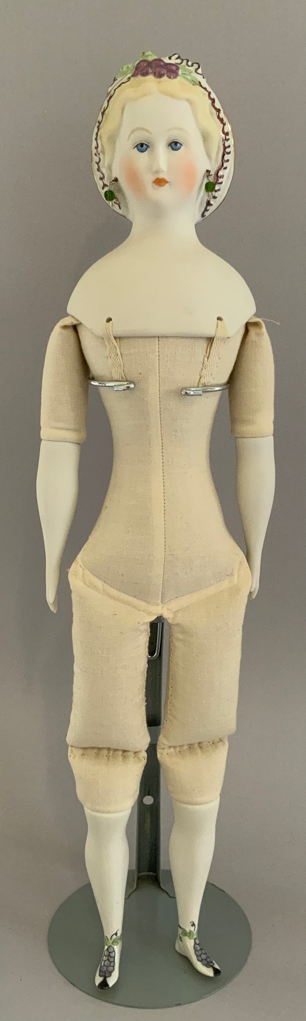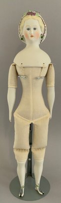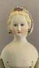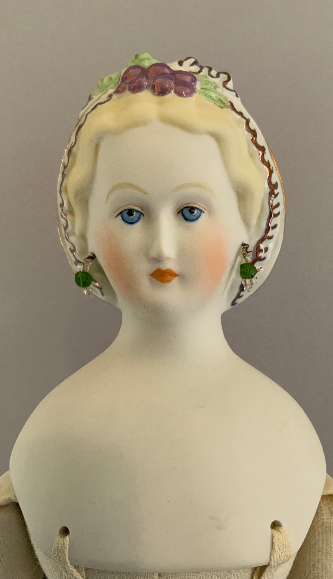 2 - Emma Clear shoulder head artist doll, painted features, cloth body with parian/china limbs, 1 – 17 ½” parian, with sculpted blonde hair & hair snood, PE, fancy hair band, no clothes, & 1 – 18” black hair china, center part with bun, brown glass eyes, no clothes