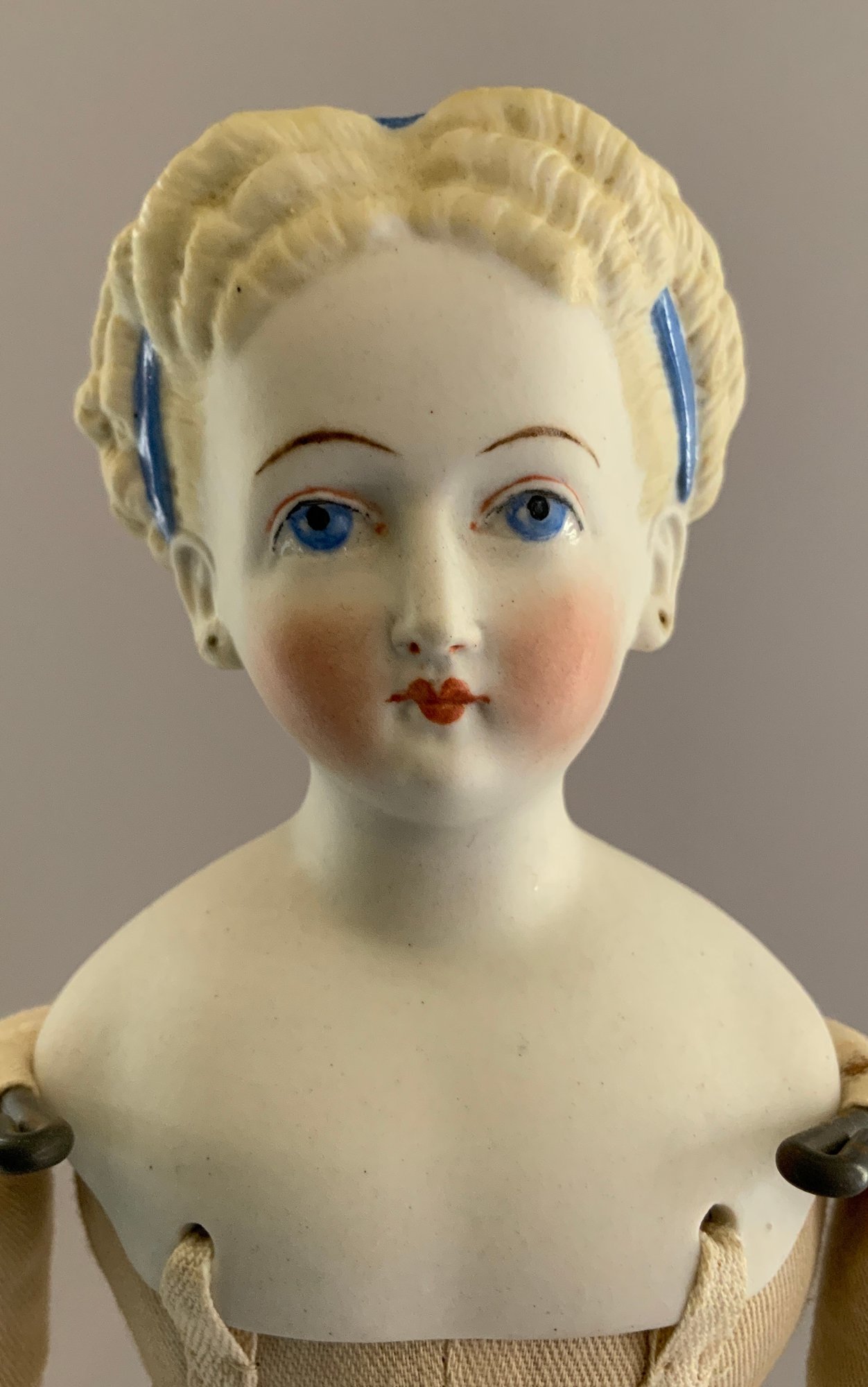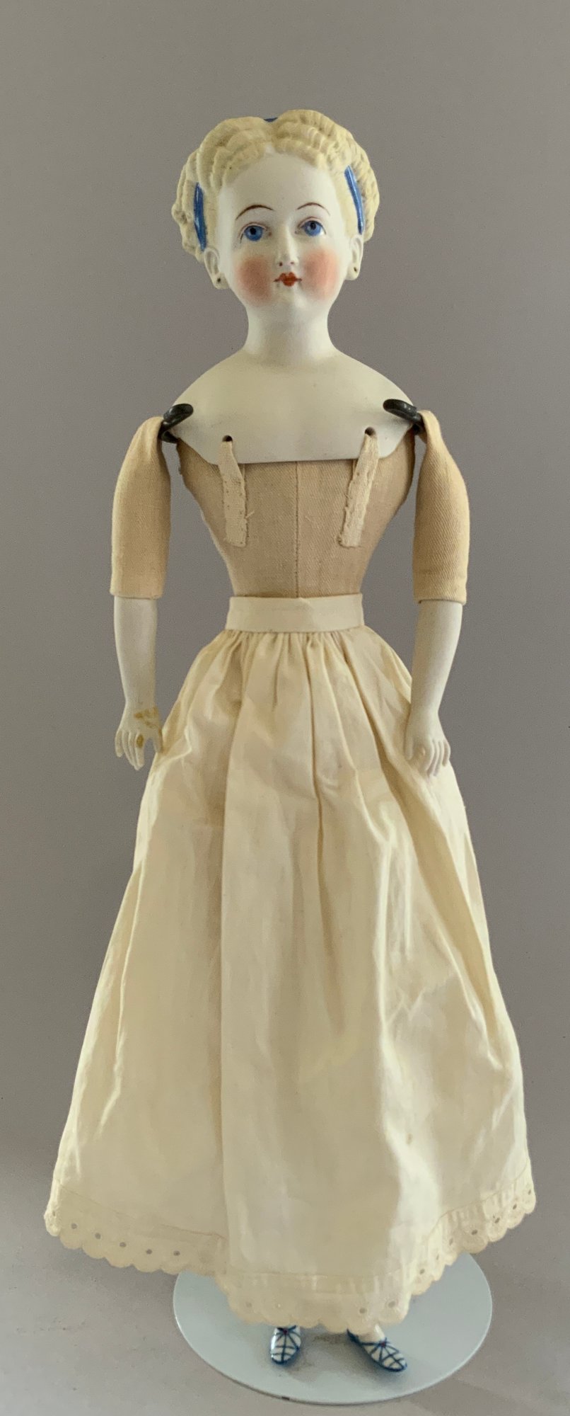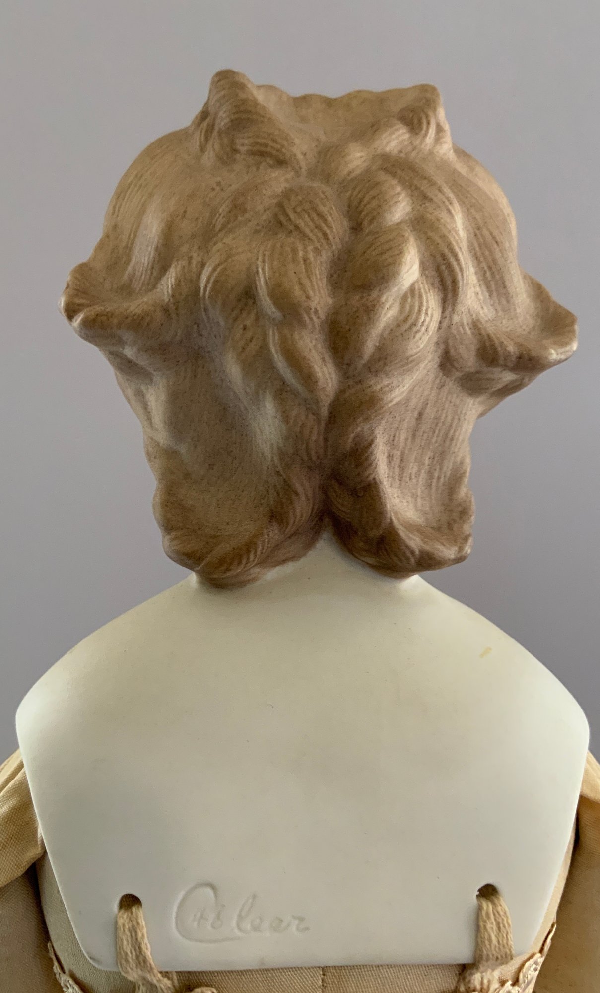 2 - Emma Clear shoulder head parian artist dolls, 1 – 18” sculpted blonde hair with braids, PE, cloth body with parian limbs, black/gold shoes, white slip & 1 – 15” sculpted blonde hair with blue ribbons, PE, cloth body with parian arms, painted blue shoes, white slip