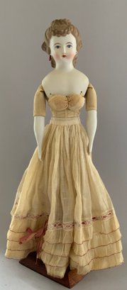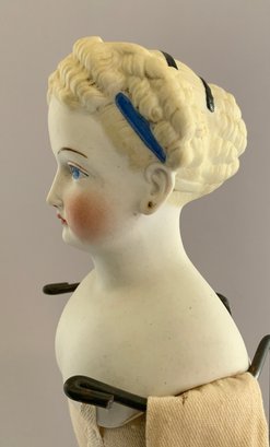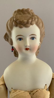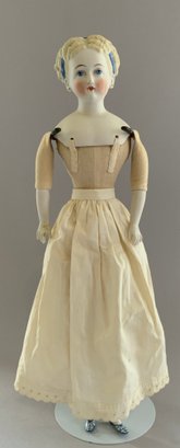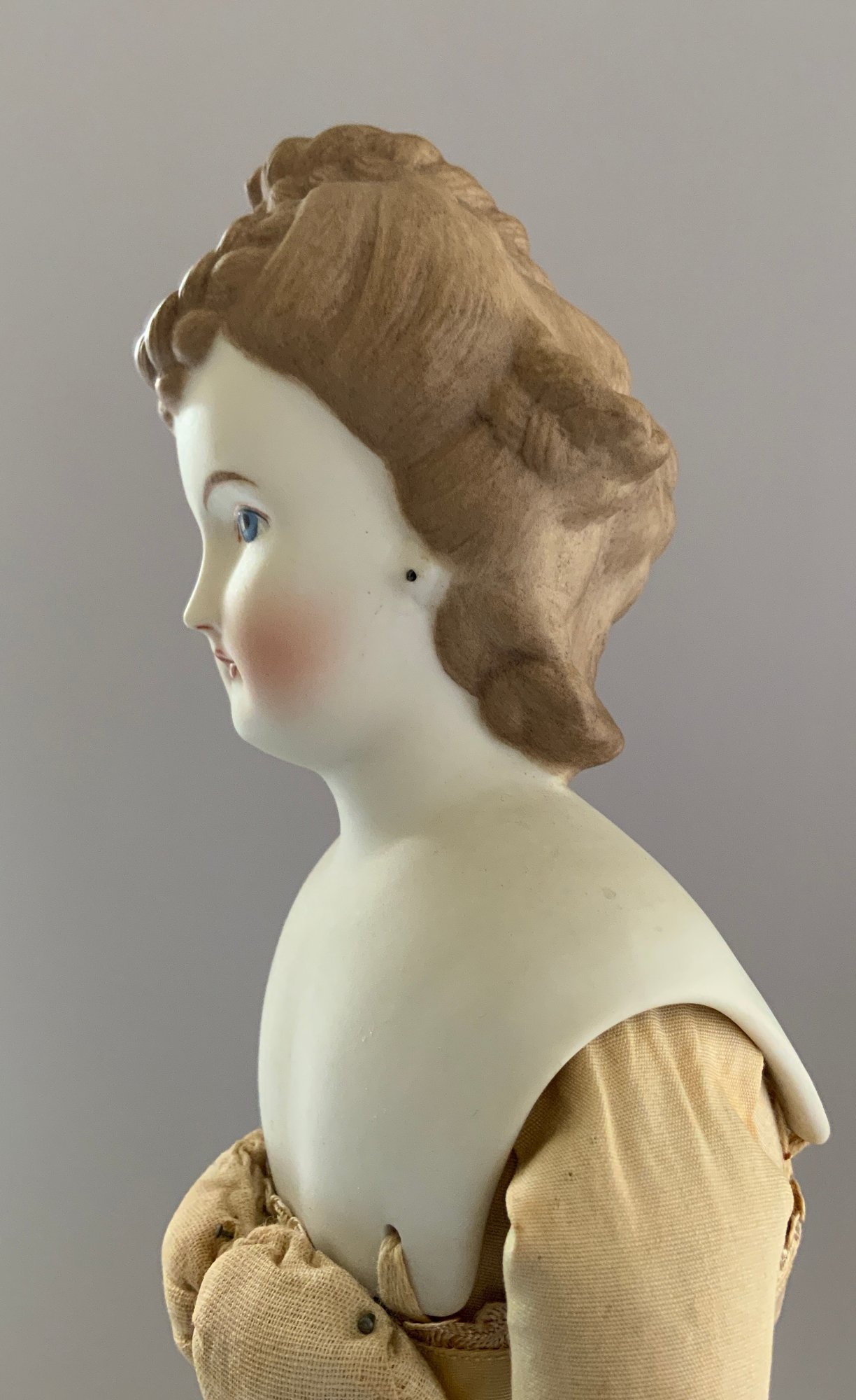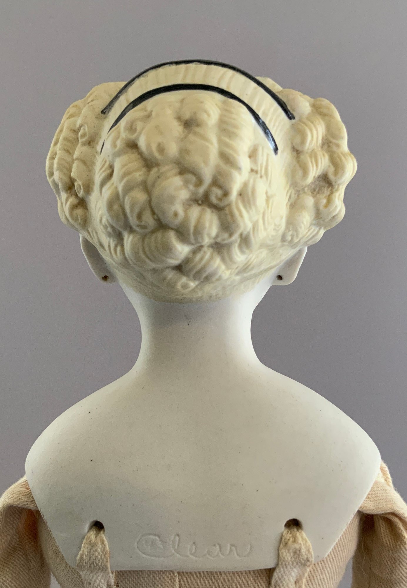 2 - Emma Clear shoulder head parian artist dolls, 1 – 18” sculpted blonde hair with braids, PE, cloth body with parian limbs, black/gold shoes, white slip & 1 – 15” sculpted blonde hair with blue ribbons, PE, cloth body with parian arms, painted blue shoes, white slip
