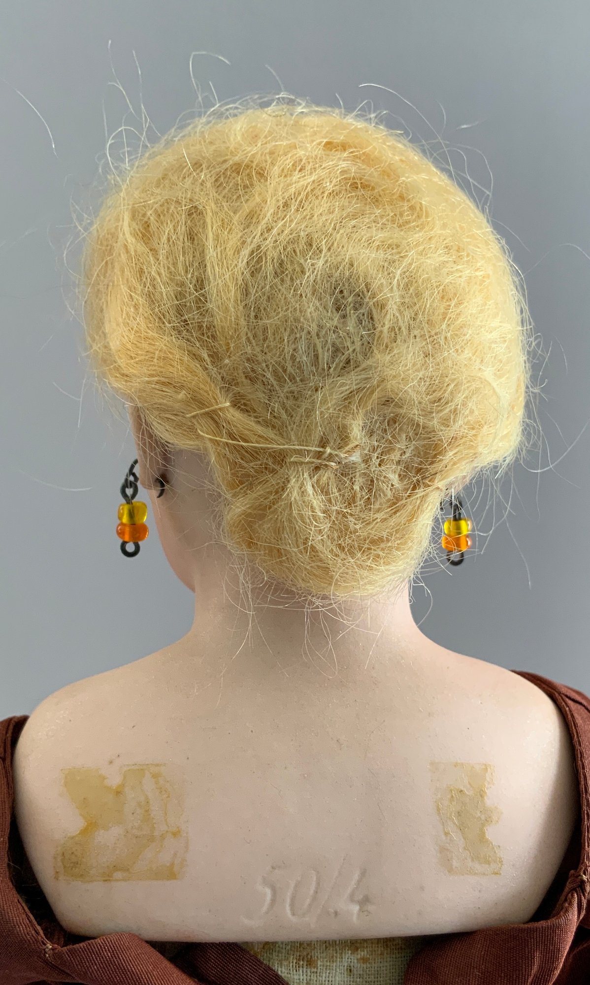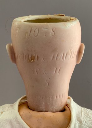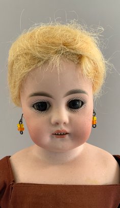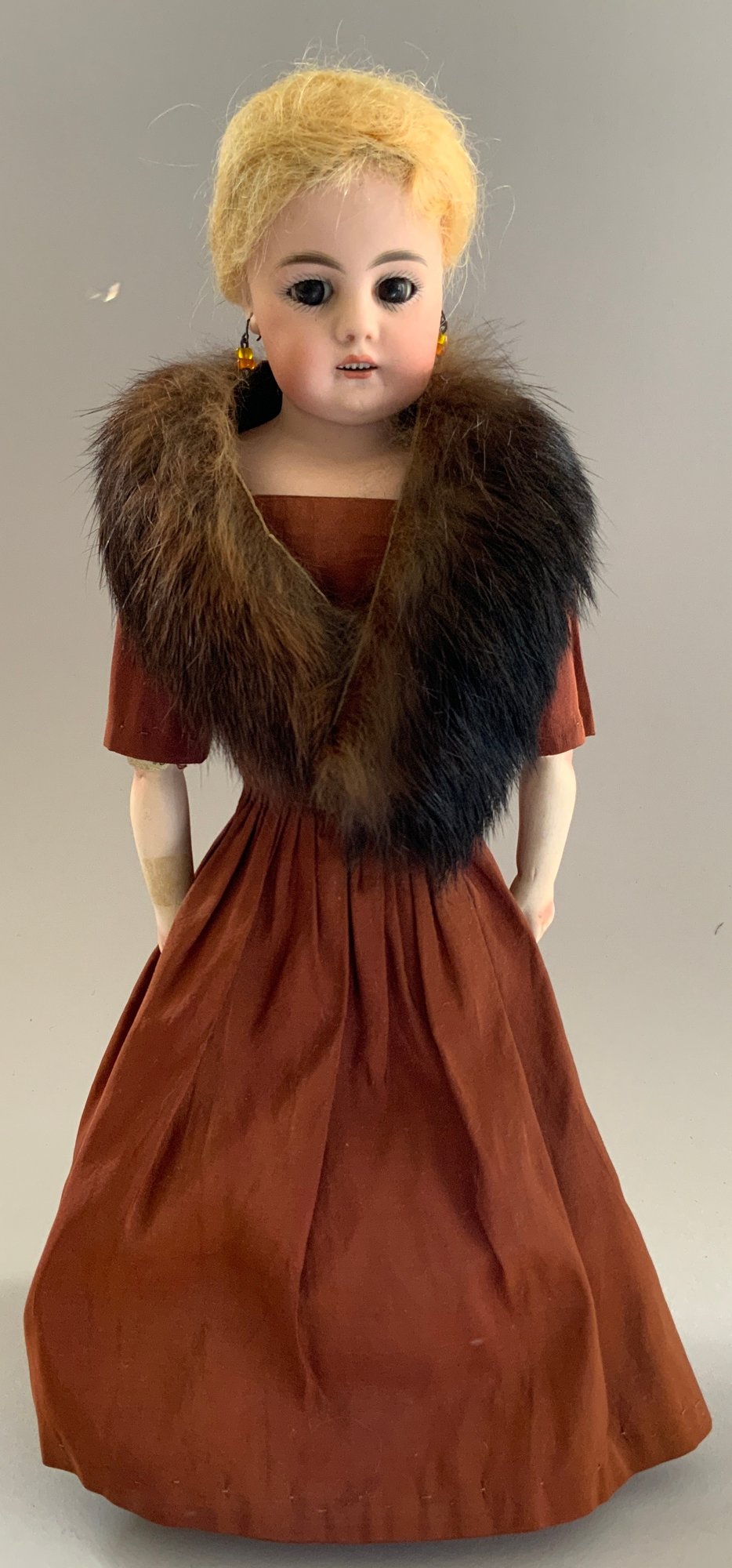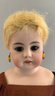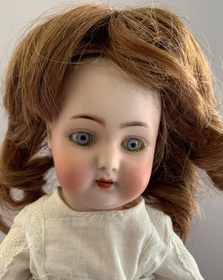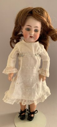2 – German bisque dolls, 1 – 14” S&H 1078 5, blue glass eyes, CM with teeth, brown mohair wig, BJCB (compo cracks in right hand), white dress, & 1 – 13” shoulder head 50.4, brown glass sleep eyes, OM with teeth, PE, sparse blonde wig (glued down), cloth/kid body with bisque arms, copper dress