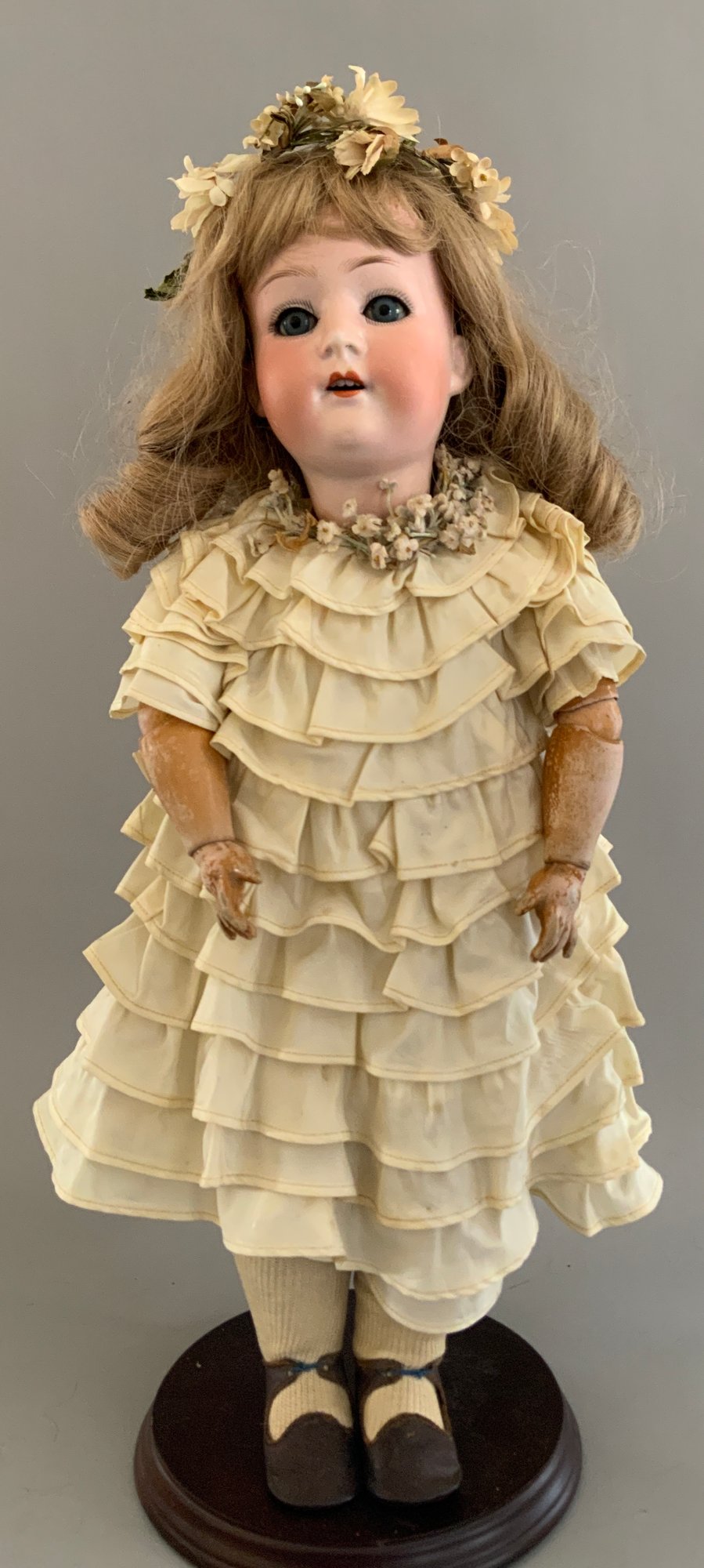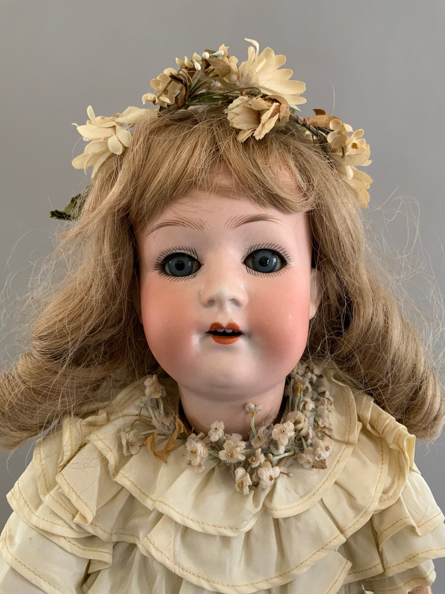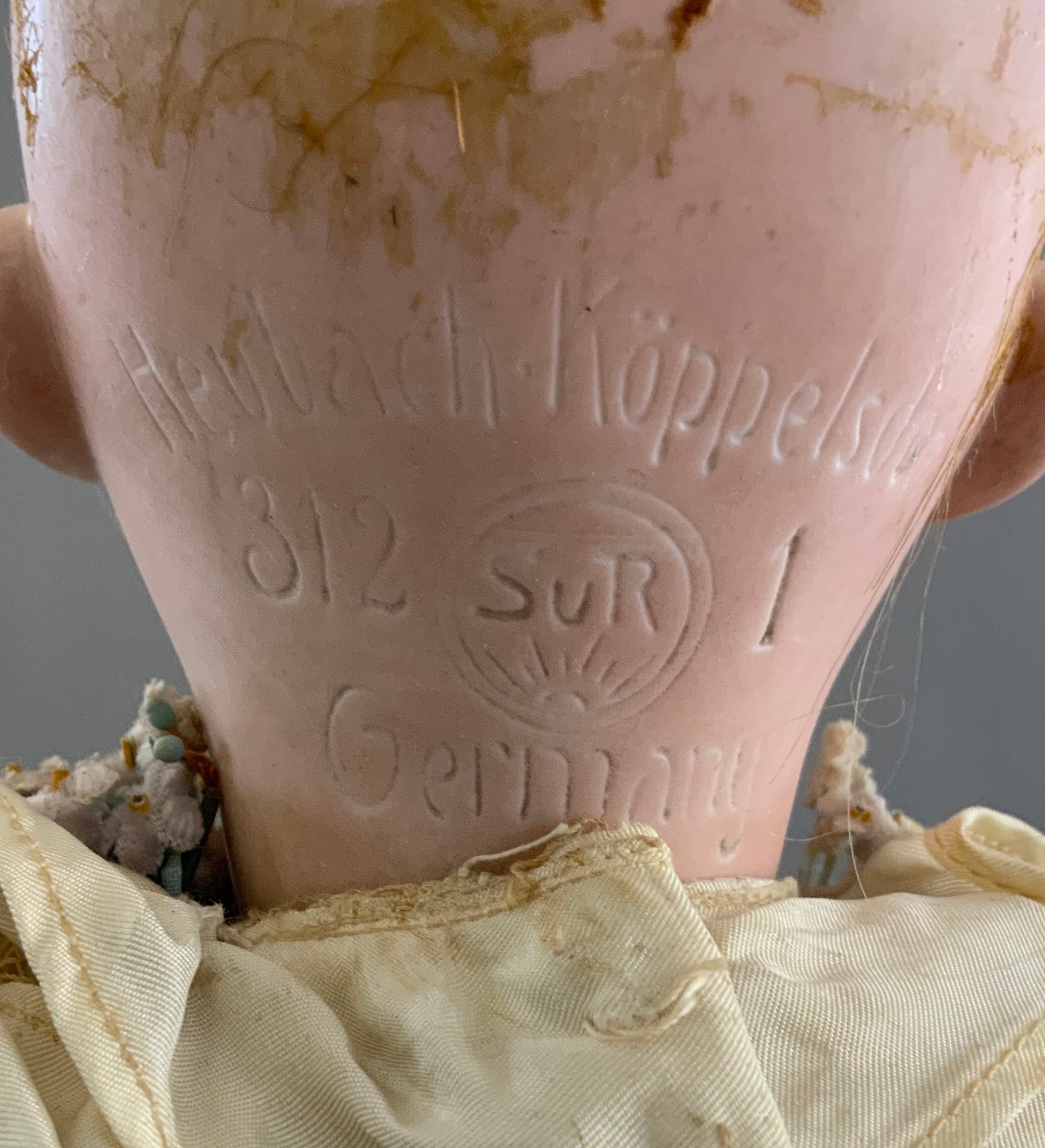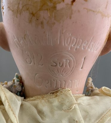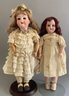 2 – German bisque dolls, 1 – 19” Heubach Koppelsdorf 312 SUR, blue glass sleep eyes, OM with teeth, blonde HH wig, BJCB, white dress (soiled), (excessive wig glue & pulls, cheek rub, hand wear), & 1 – 18” 1912 -4/0, blue glass sleep eyes, OM with teeth, brown mohair wig, BJCB, pale yellow dress