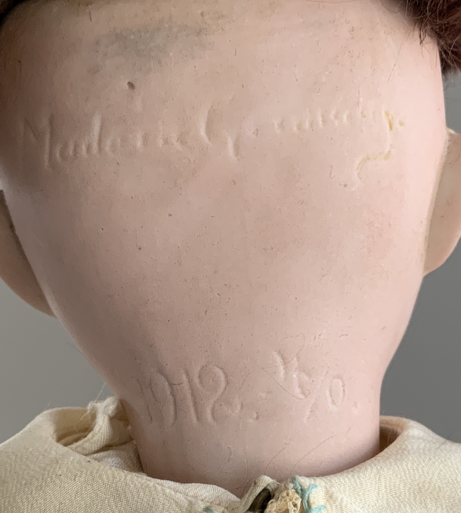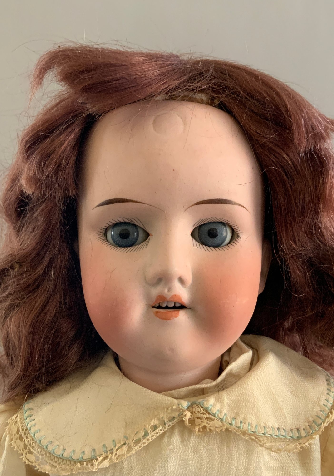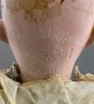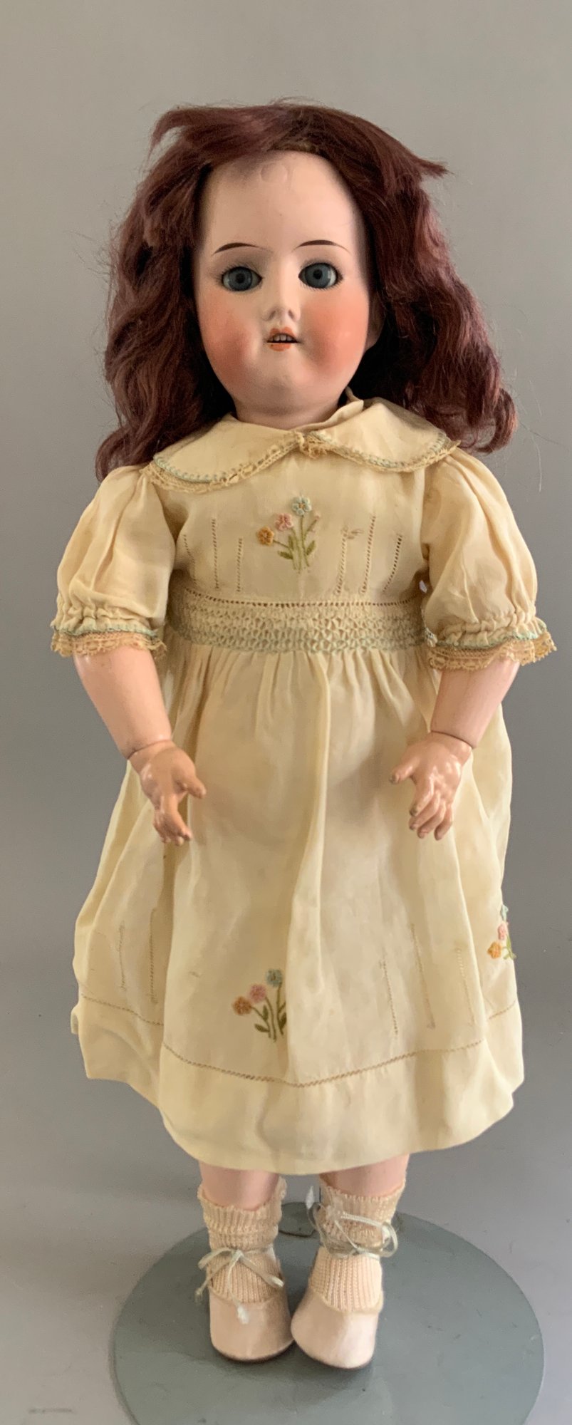 2 – German bisque dolls, 1 – 19” Heubach Koppelsdorf 312 SUR, blue glass sleep eyes, OM with teeth, blonde HH wig, BJCB, white dress (soiled), (excessive wig glue & pulls, cheek rub, hand wear), & 1 – 18” 1912 -4/0, blue glass sleep eyes, OM with teeth, brown mohair wig, BJCB, pale yellow dress