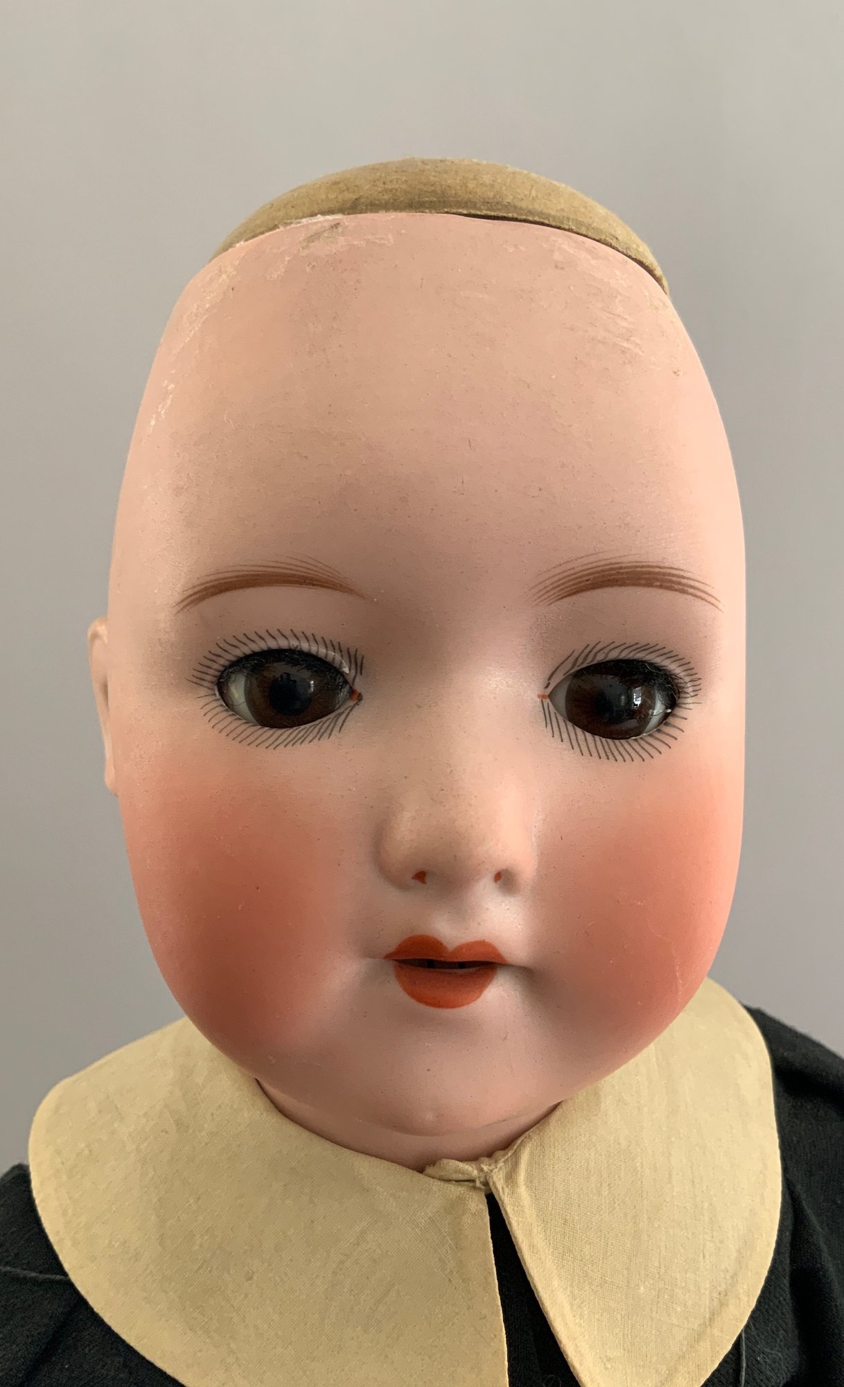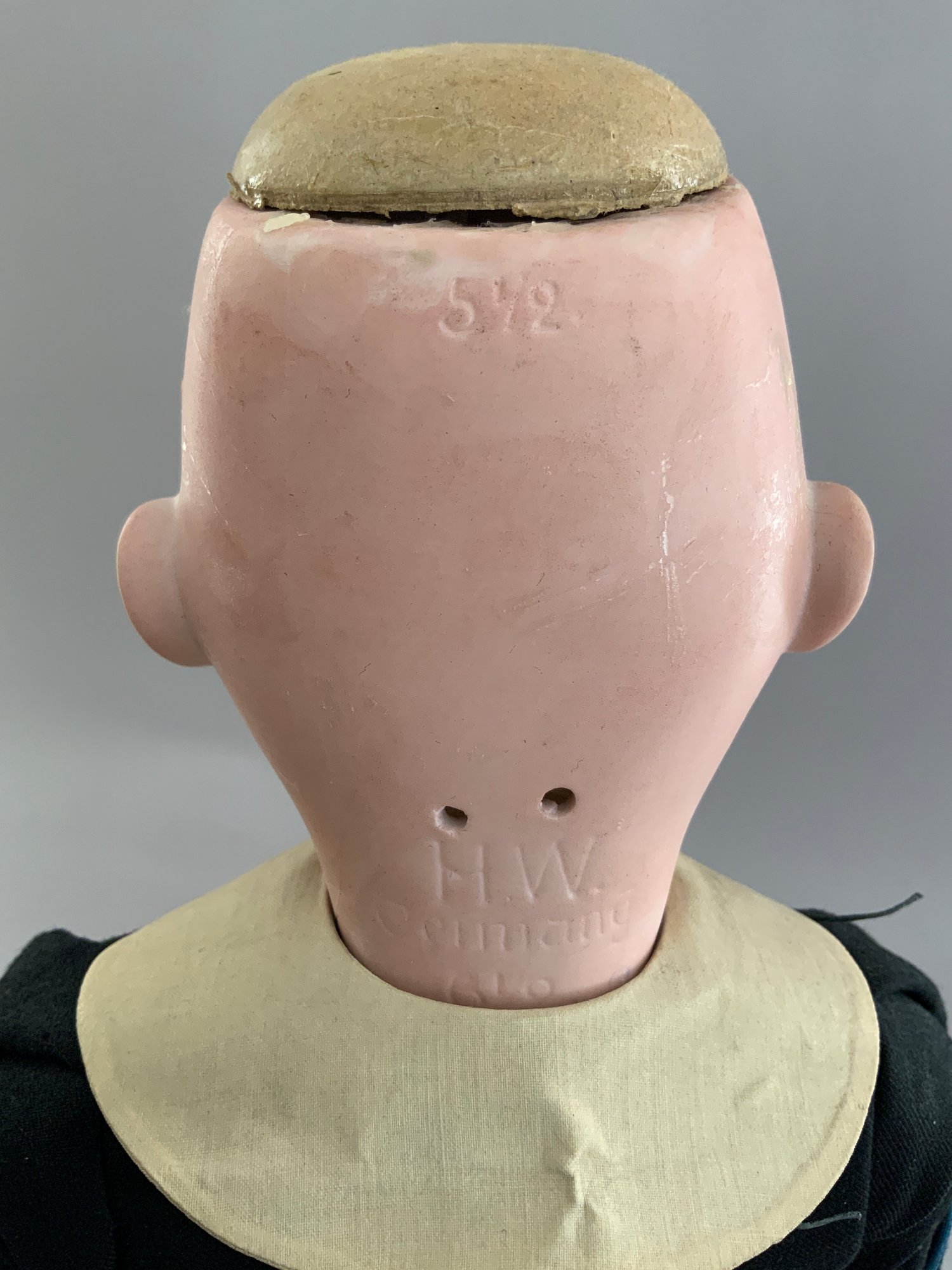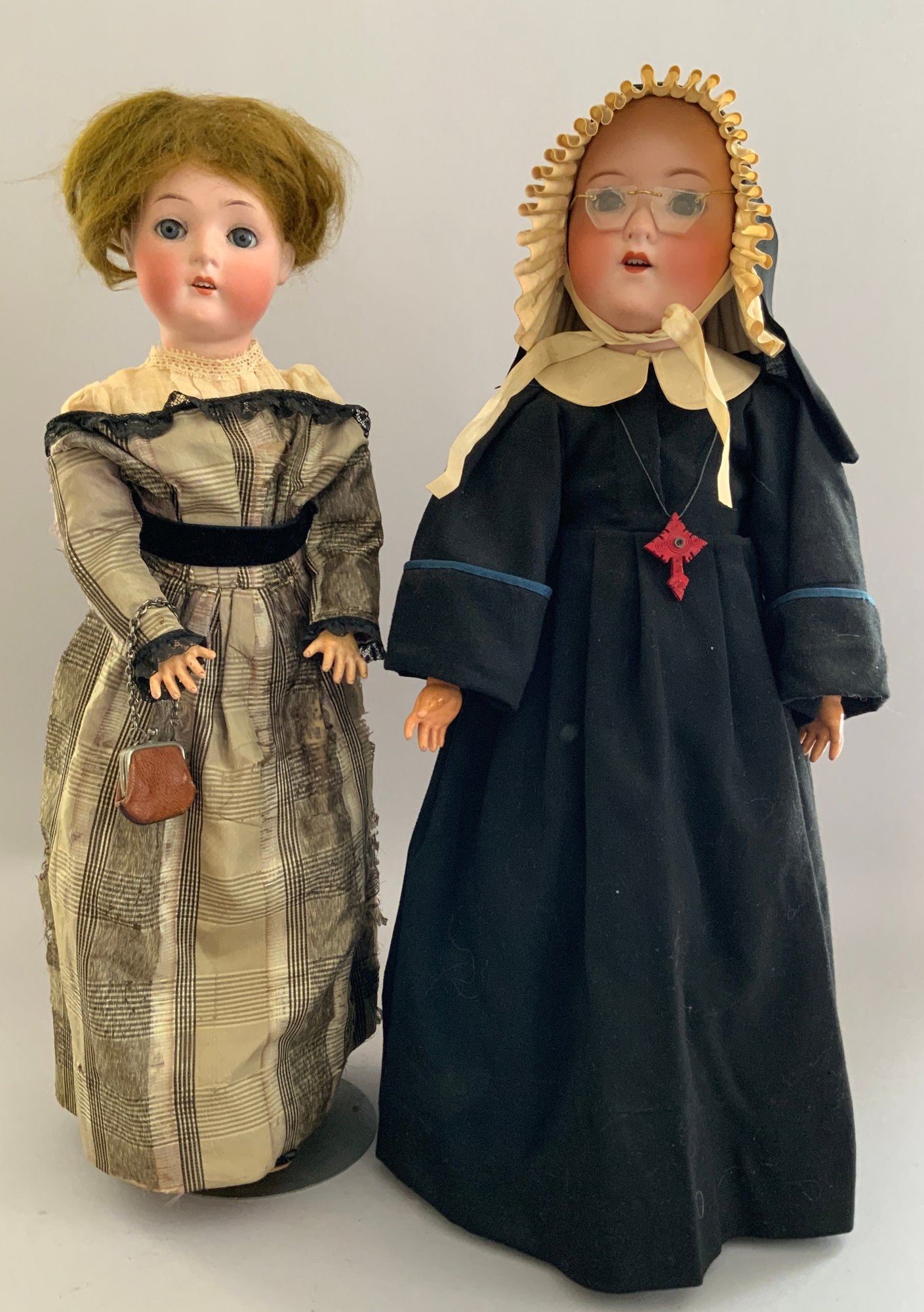 2 – German bisque head dolls, 1 – 23” Heubach Koppelsdorf AWW, blue glass sleep eyes, OM with teeth, brown mohair wig (pulls), BJCB, black stripe silk dress (melting), & 1 – Heinrich Handwerck M W, brown glass sleep eyes, OM with teeth, no wig, BJCB, black Nun’s habit with bonnet