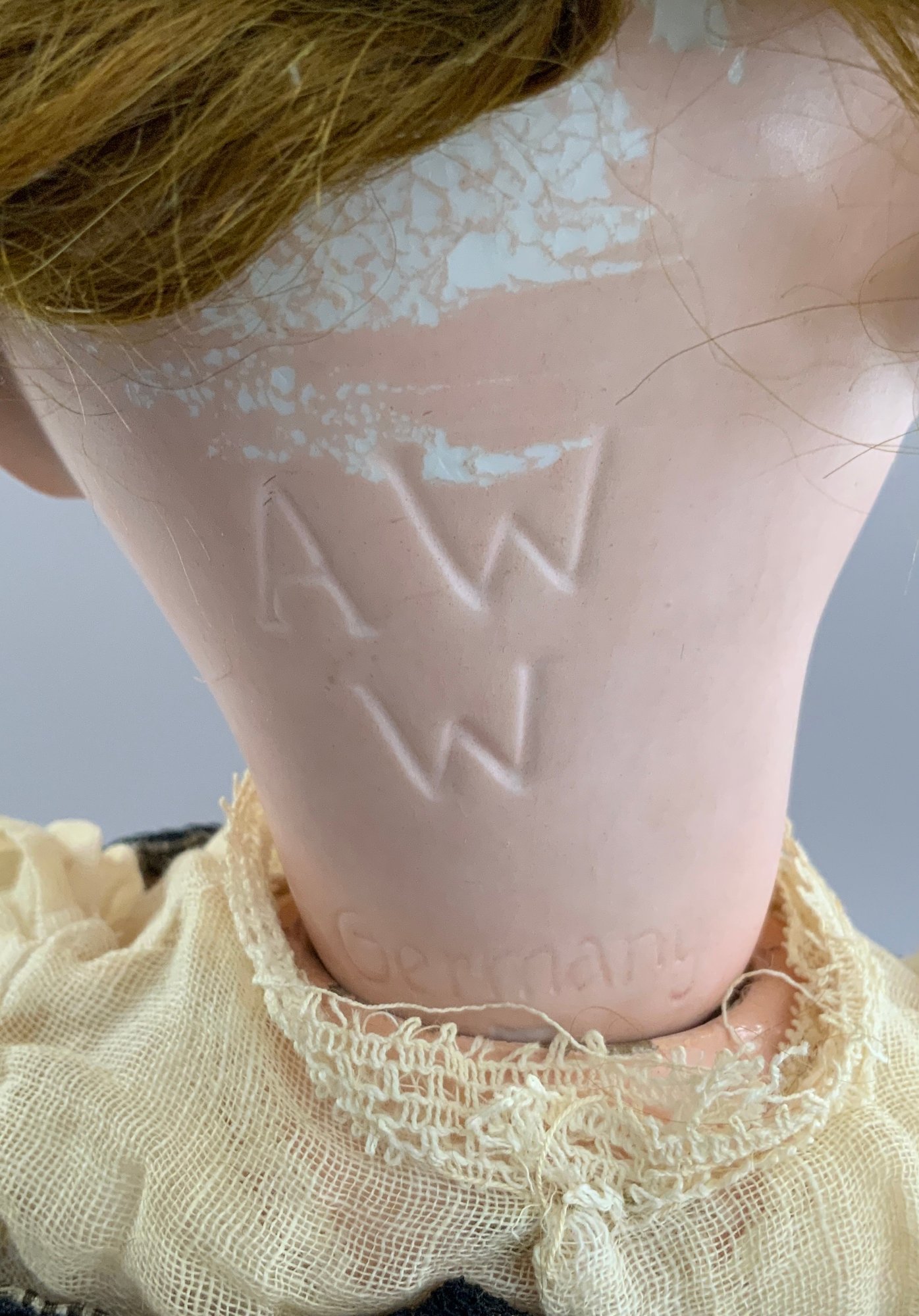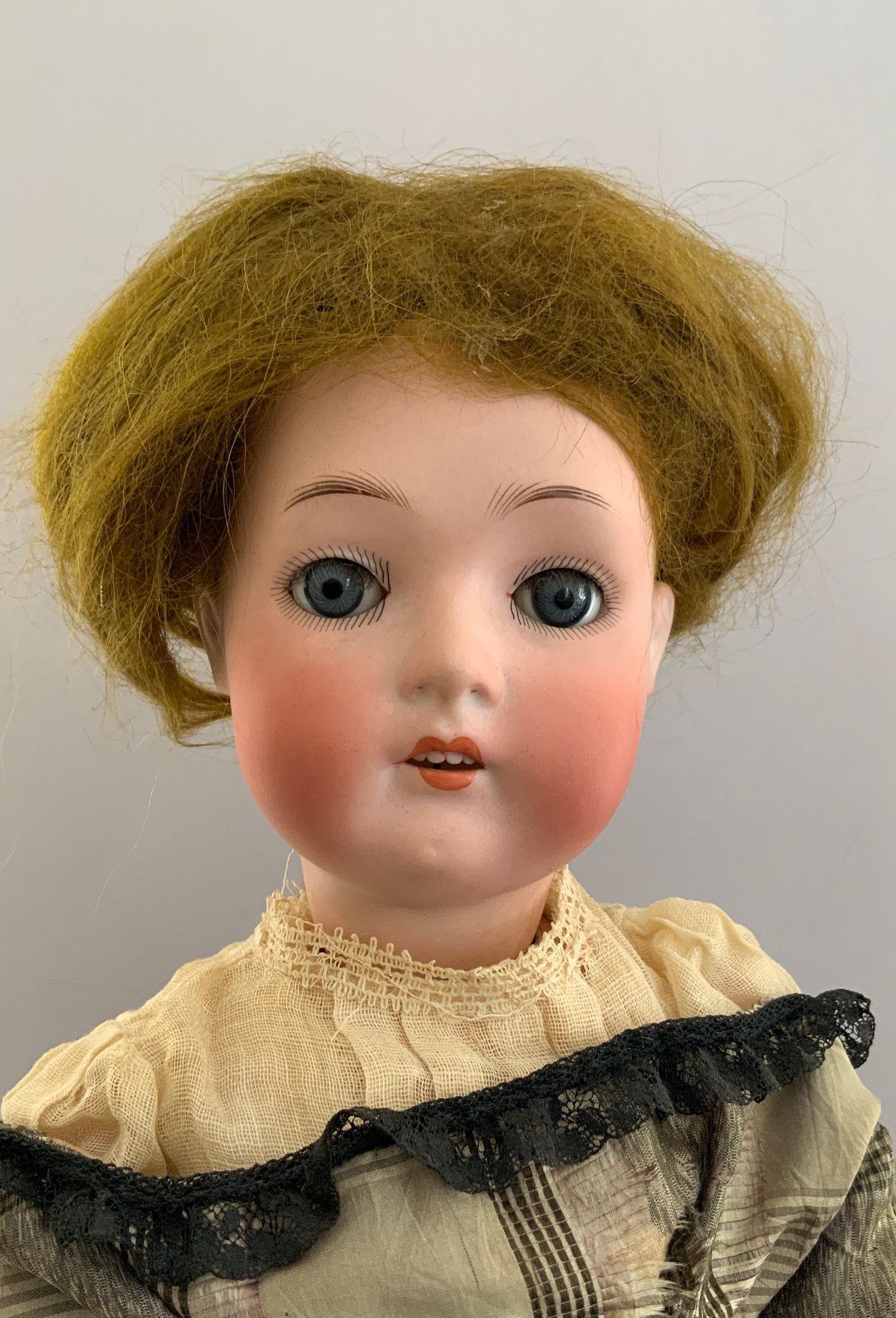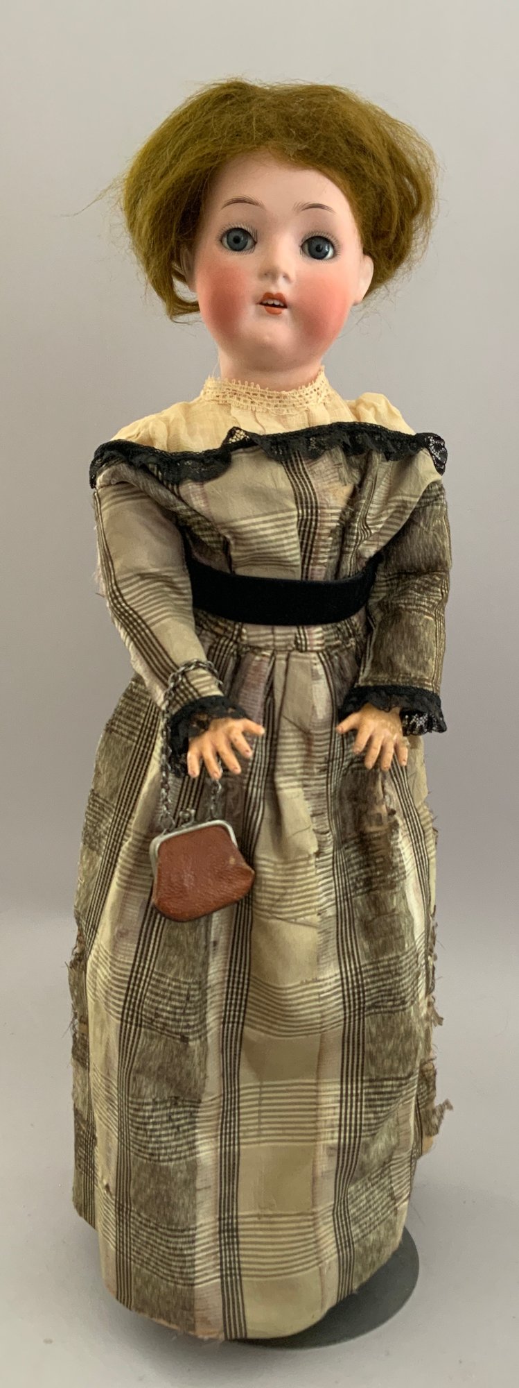 2 – German bisque head dolls, 1 – 23” Heubach Koppelsdorf AWW, blue glass sleep eyes, OM with teeth, brown mohair wig (pulls), BJCB, black stripe silk dress (melting), & 1 – Heinrich Handwerck M W, brown glass sleep eyes, OM with teeth, no wig, BJCB, black Nun’s habit with bonnet