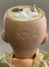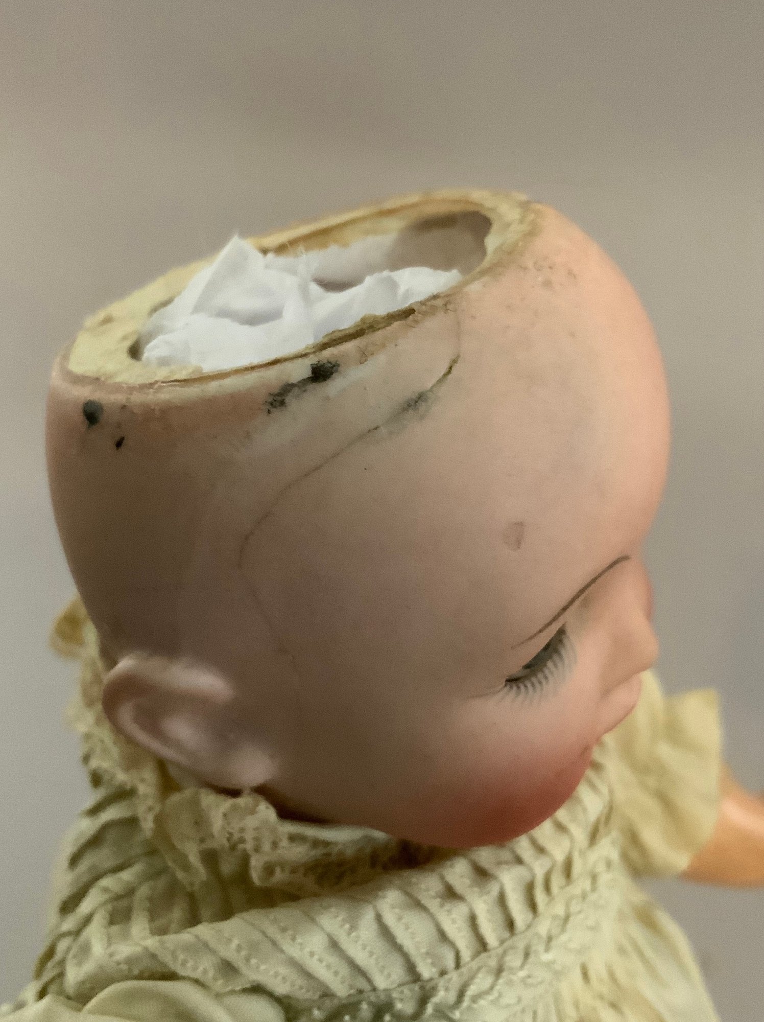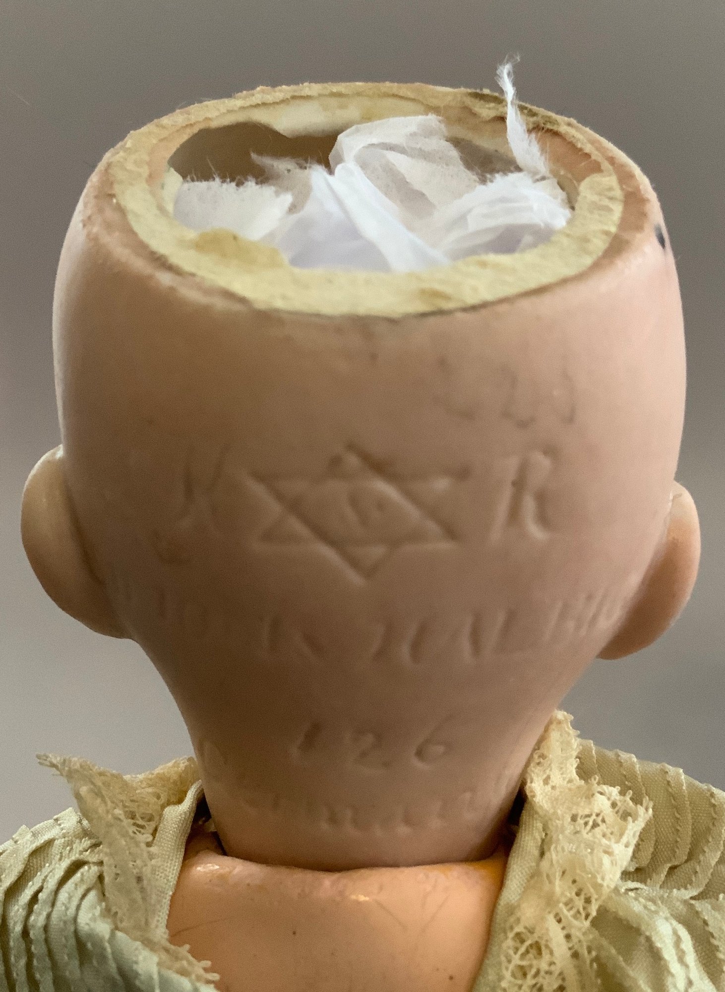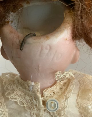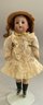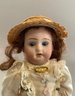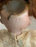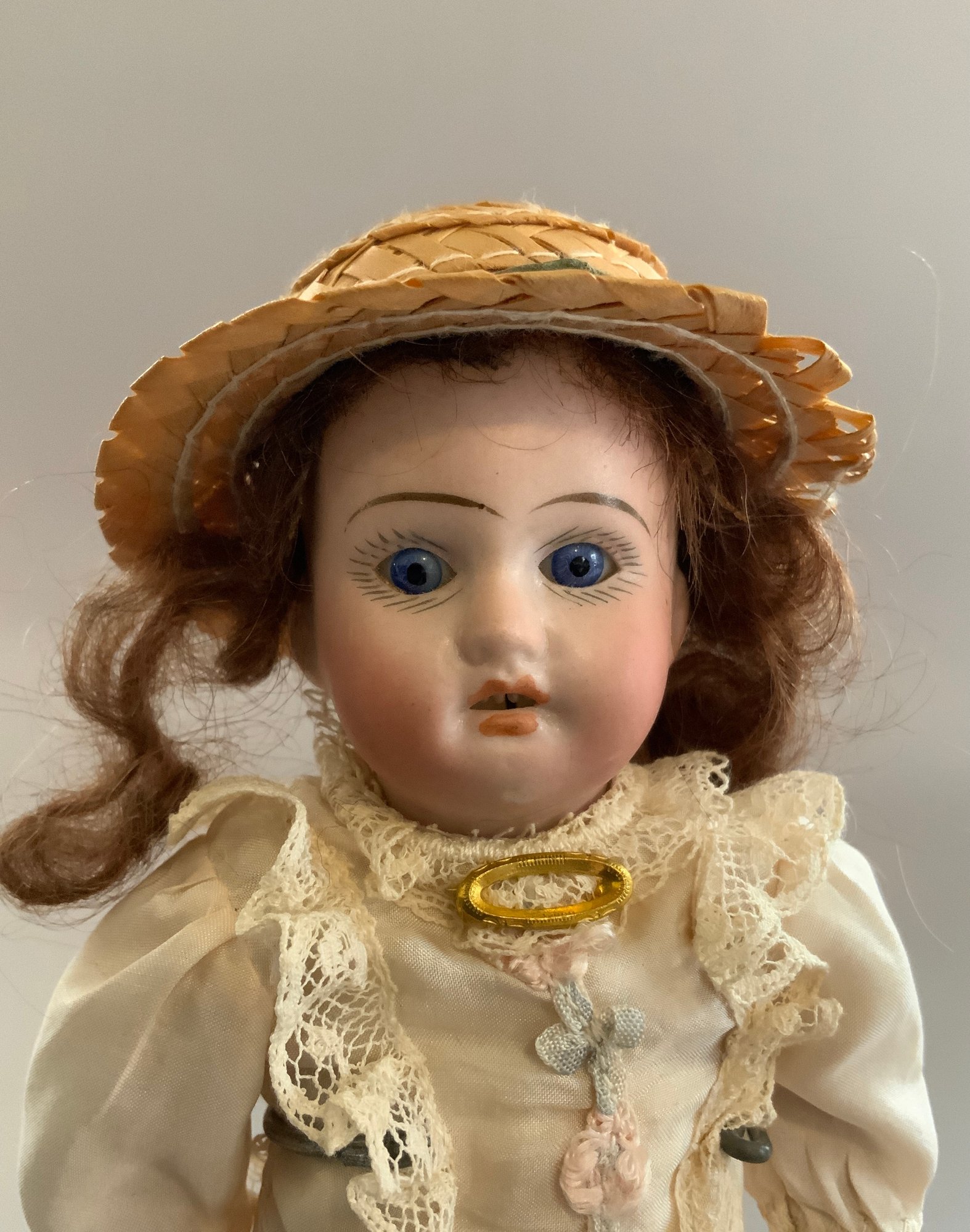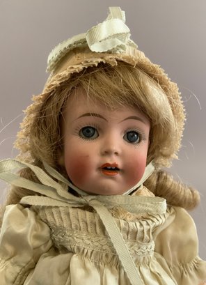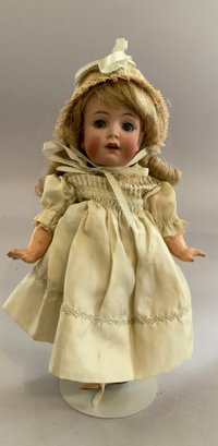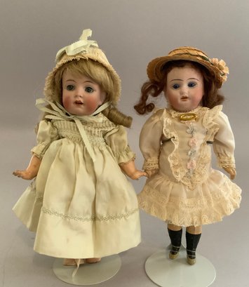 2 – German bisque head dolls, 1 – 8 ½” K*R 126 toddler, blue glass sleep eyes, OM with teeth, blonde mohair wig, compo body, lt green dress (long hairline rim down right cheek), & 1 – 8” I 12/0, blue glass eyes, OM with teeth, brown mohair wig, compo body, painted socks & shoes, lt pink dress