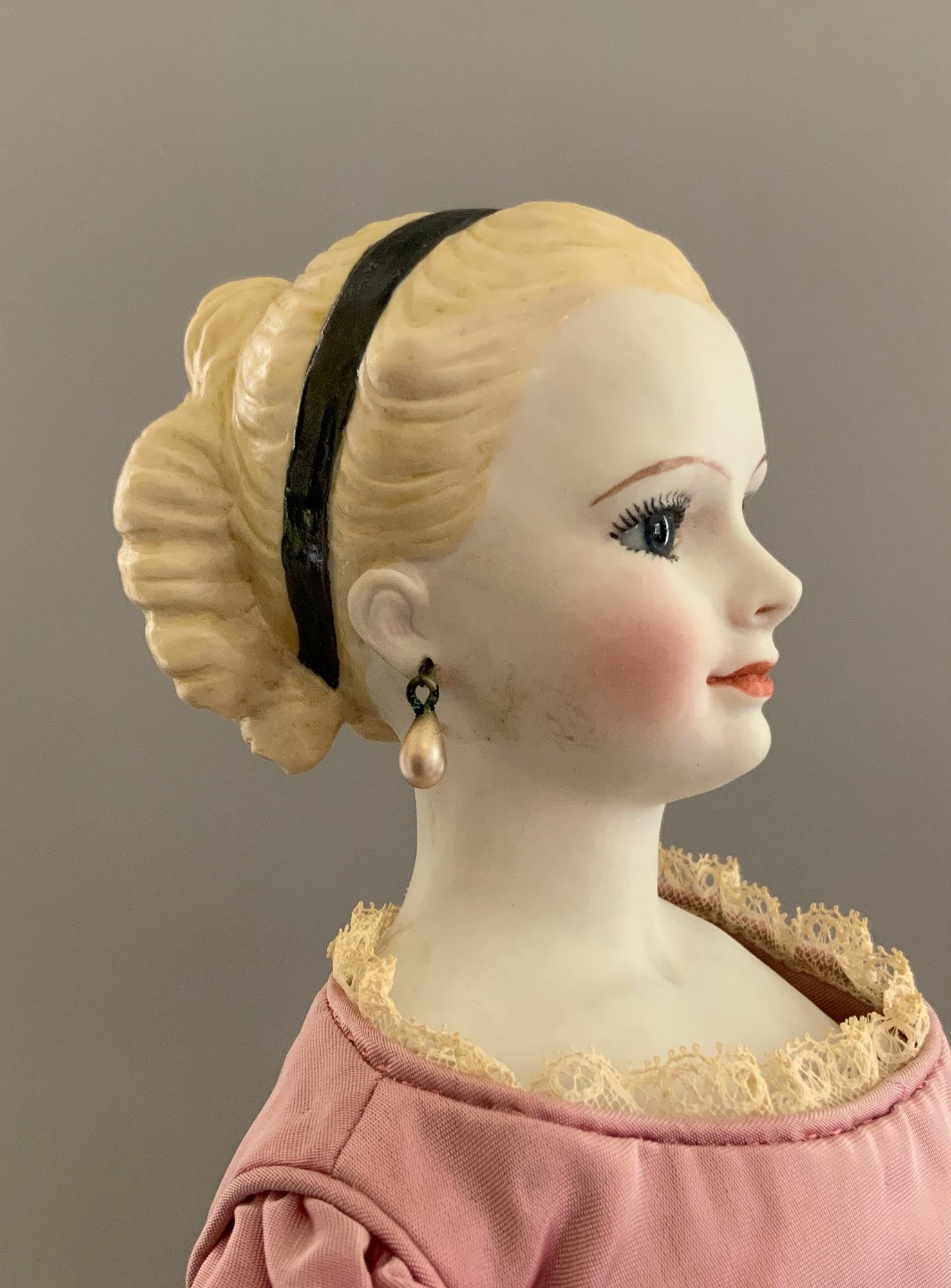 2 – Martha Thompson artist dolls Little Woman Series, sculpted & painted features, 1 – 17” “Meg”, brown glass eyes, CM, PE, pink hair ribbon with snood, green & brown outfit, & 1 – 18” “Amy”, blue glass eyes, PE, CM, flower in hair band, pink outfit