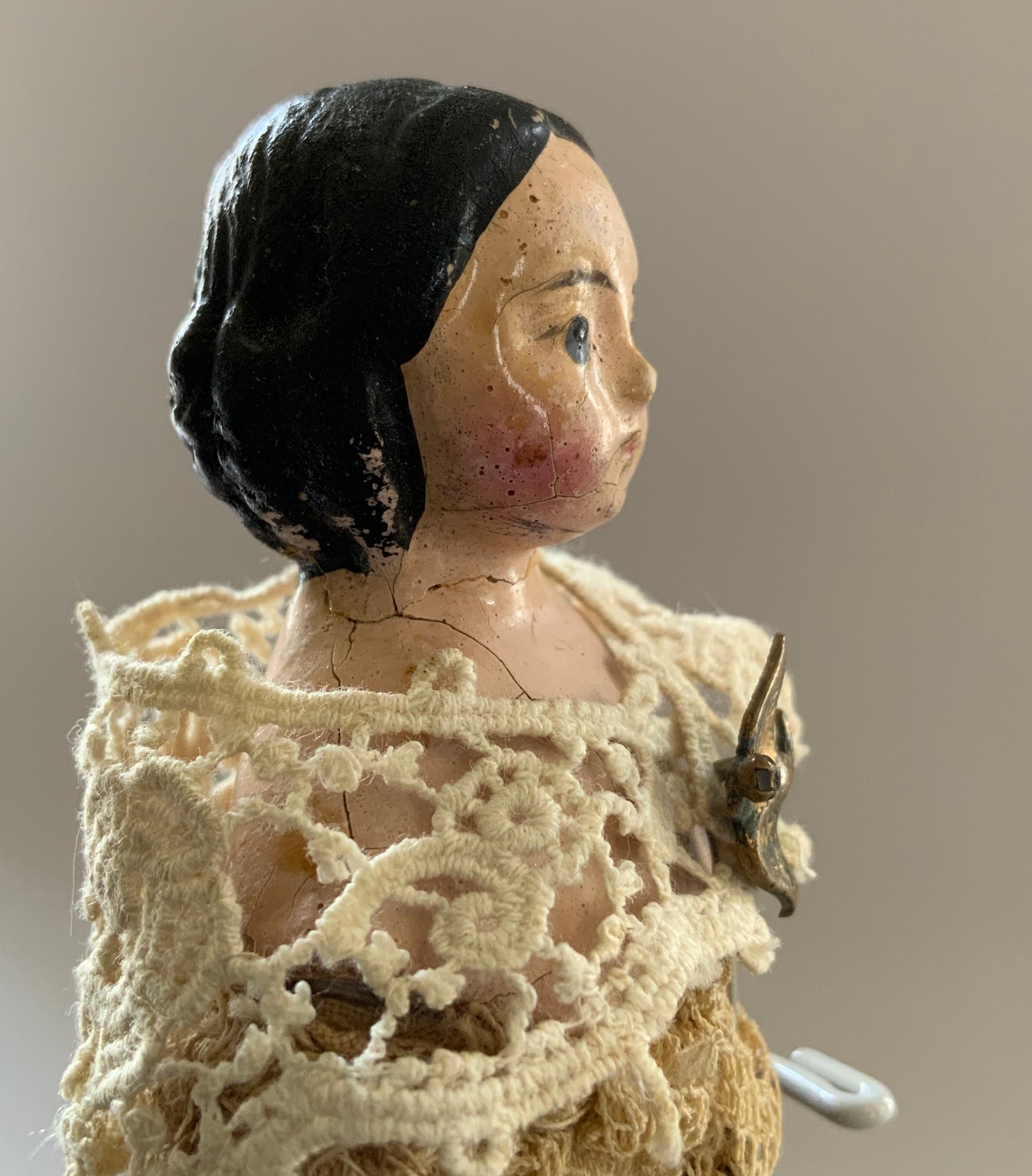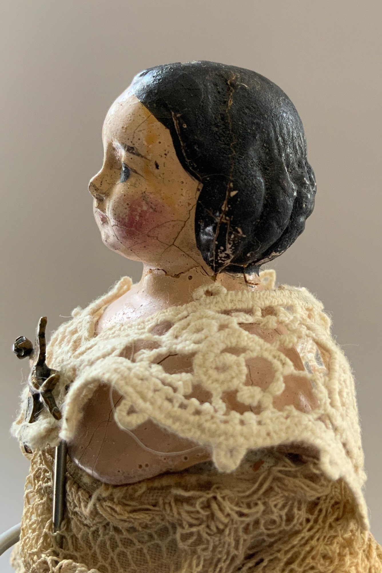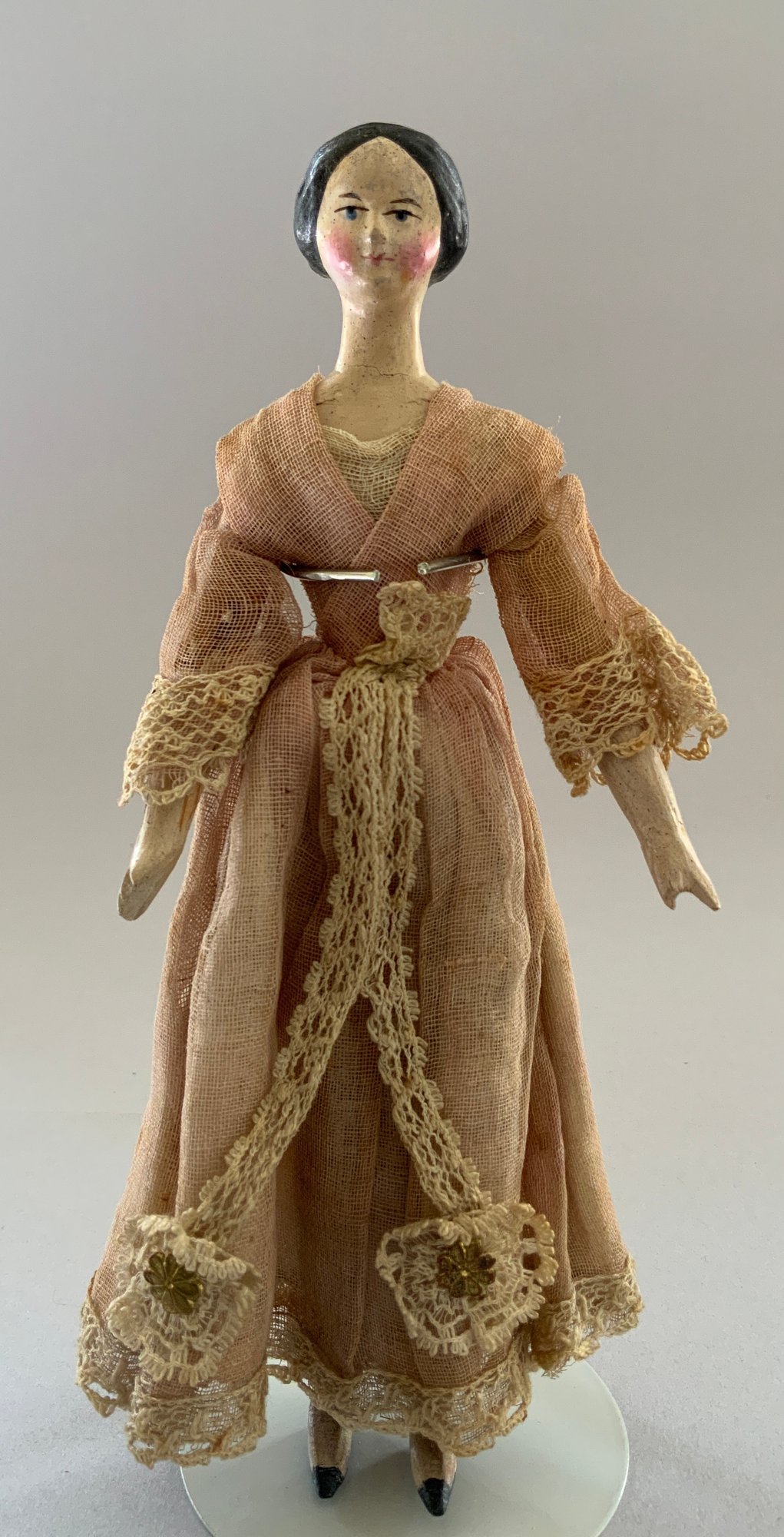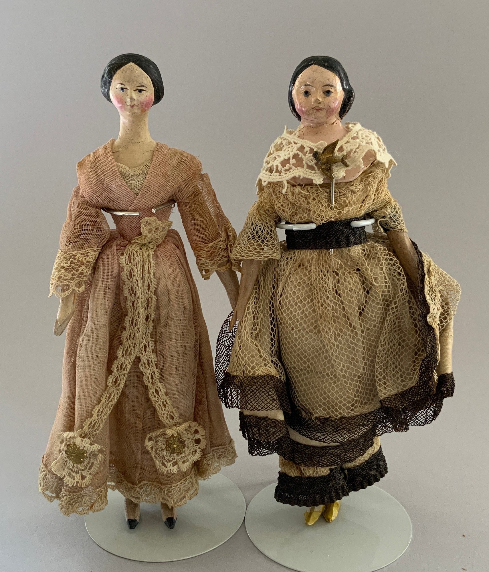 2 - Paper mache shoulder head Milliners models, painted features, wood limbs, 1 – 8” long neck with bun, early faded pink lace dress, & 1 – 8” with curls, early white/black lace dress, ( crazing & cracks to shoulder plates)