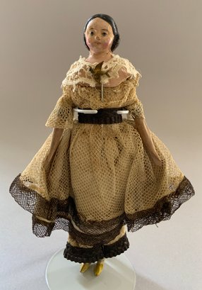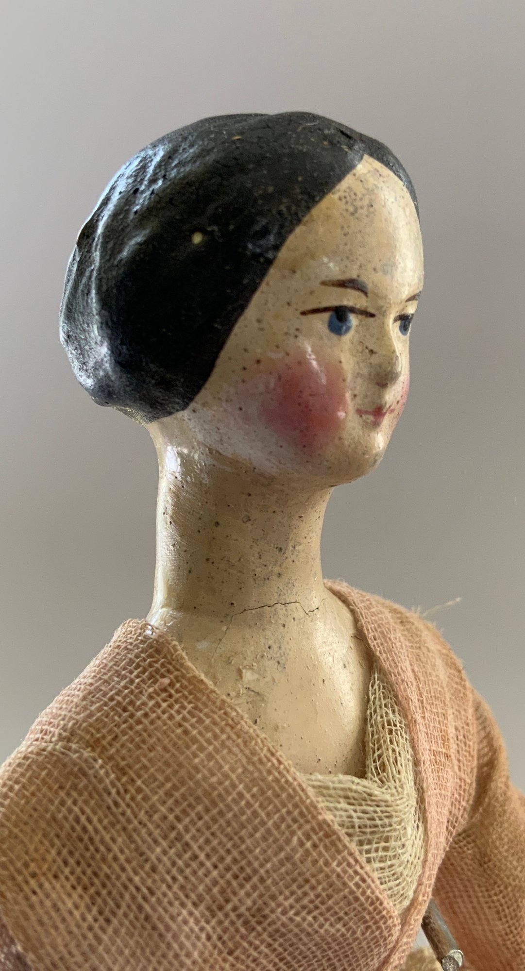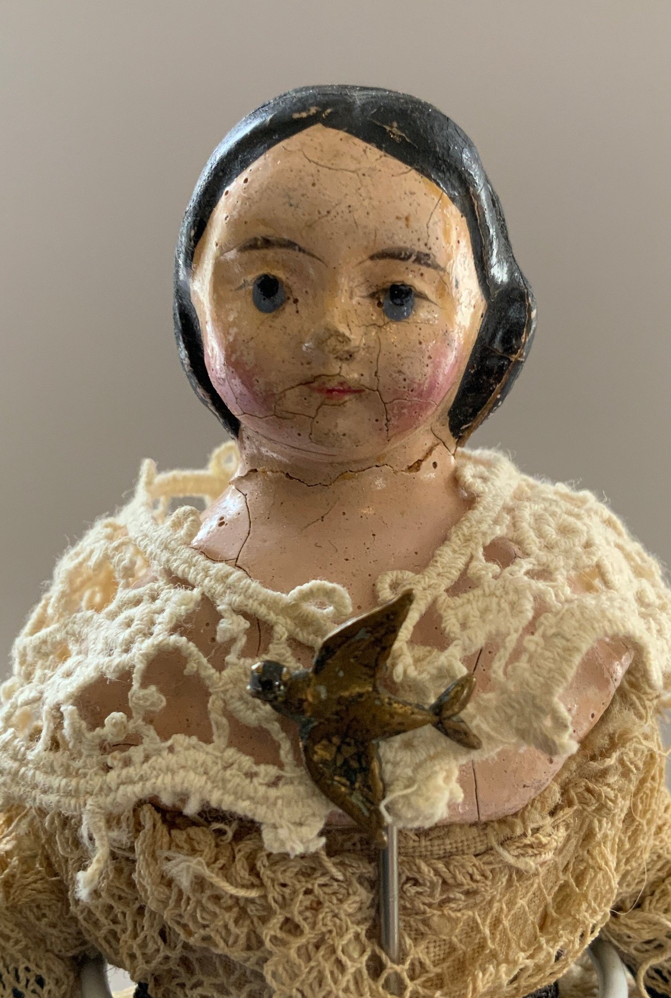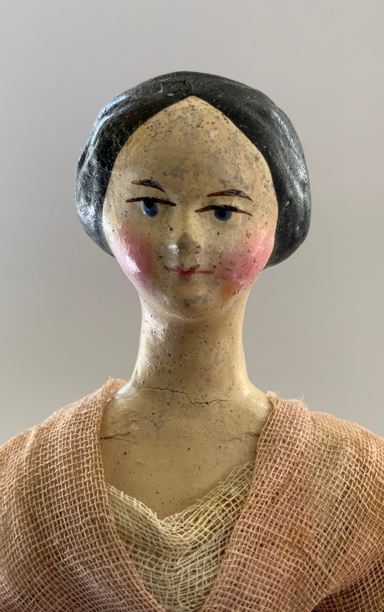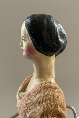 2 - Paper mache shoulder head Milliners models, painted features, wood limbs, 1 – 8” long neck with bun, early faded pink lace dress, & 1 – 8” with curls, early white/black lace dress, ( crazing & cracks to shoulder plates)