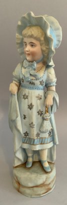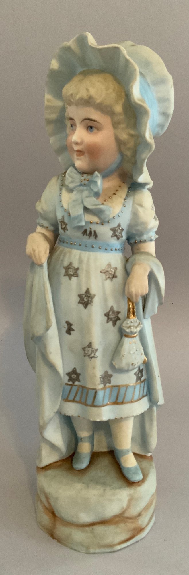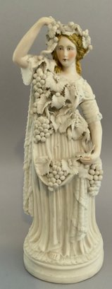2 – Porcelain figures, 1 – 14” Lady with grapes all in white except for head with painted features, & 1 – 14 ½” young girl in blue (needs cleaning)