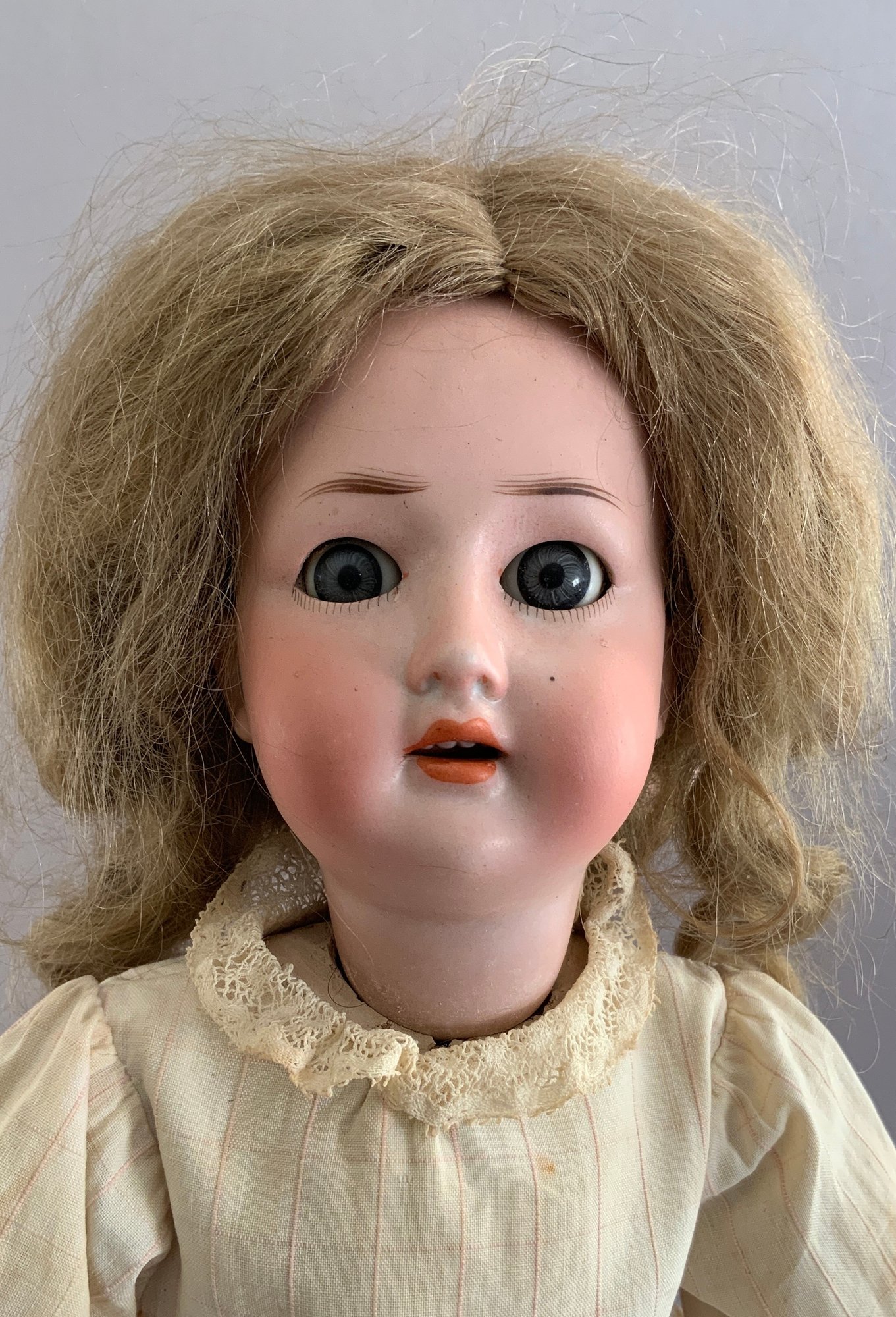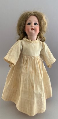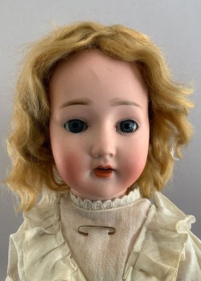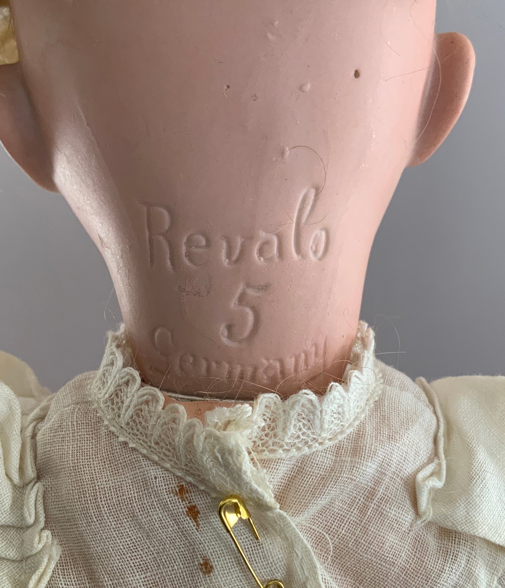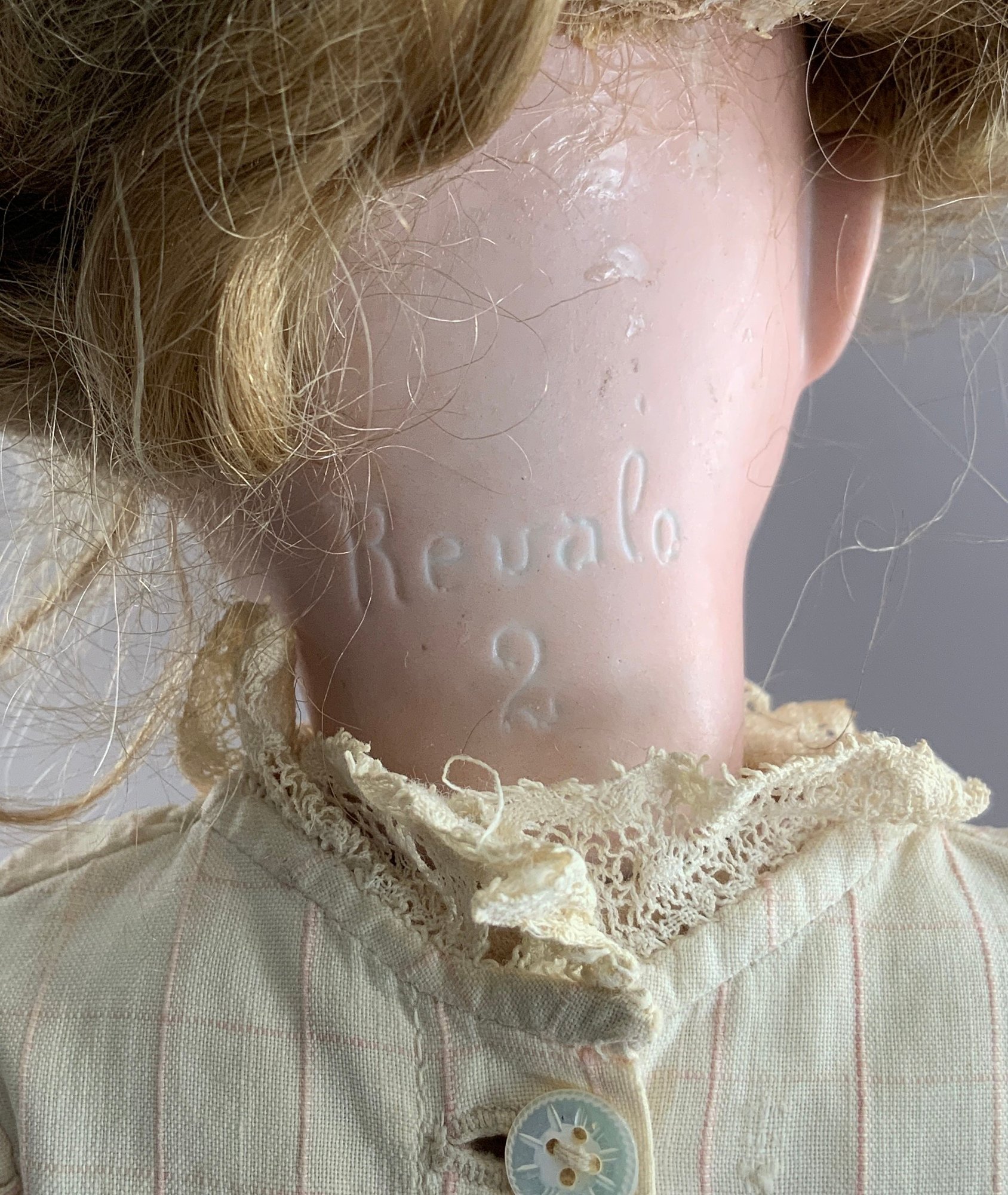 2 - Revalo Bisque head dolls, 1- 15” incised Revalo 2, jointed compo body (as-is), o/m teeth, blue eyes, blonde mohair wig, and 1 - 18” incised Revalo 5, blue glass sleep eyes, OM with teeth, blonde mohair wig, jointed compo body, white dress (left ear firing flaw)