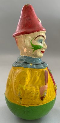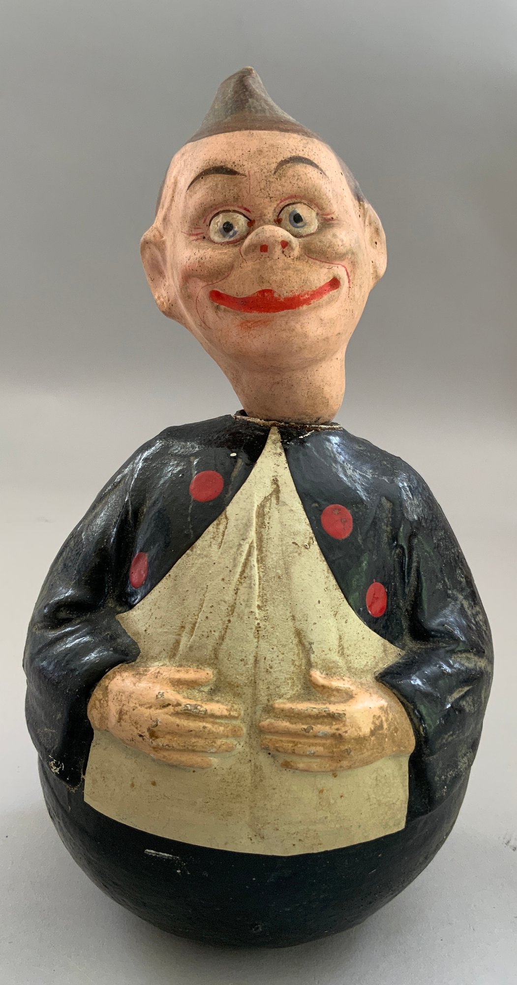 2 – Schoenhut paper mache Rolly Dolly toys, 9 ½” tall, painted, weighted bases, (chips, rubs, crazing, 1 head is loose, small paint touchups)