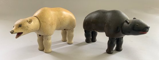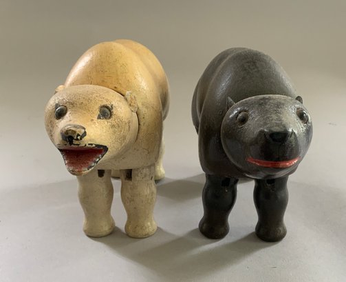 2 – Schoenhut wood bears, 1 – 8” Polar Bear, painted features, open mouth with painted teeth, leather ears, stub tail, (rubs & wear, loose front legs, & 1 – Black Bear, painted features, glass eyes, leather ears, stub tail, (rubs & wear, belly sticker)