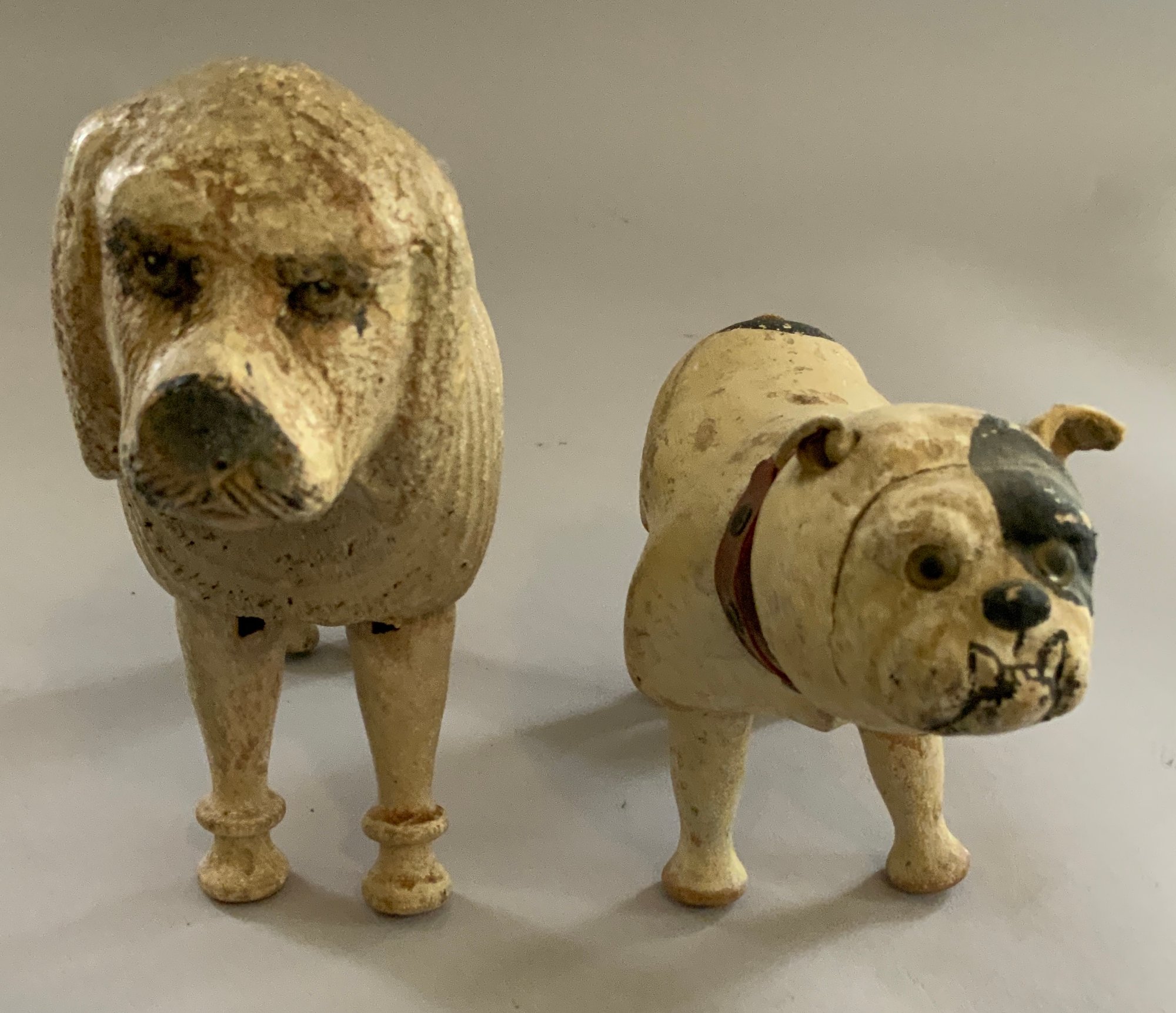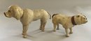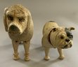2 – Schoenhut wood dogs, 1 – 6 ½” Bull Dog, painted features, glass eyes, leather ears, short leather tail, red collar, (rubs, wear, cracks), & 1 – 8” Poodle, glass eyes, carved & painted features, rope tail, (rubs & wear)