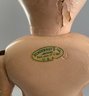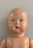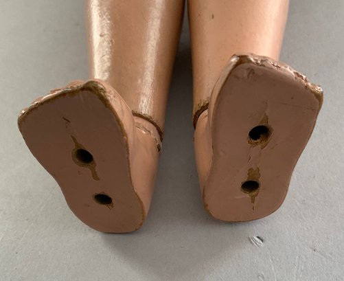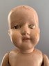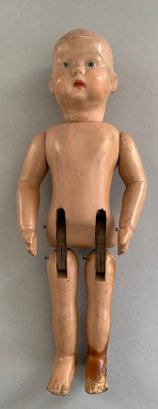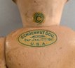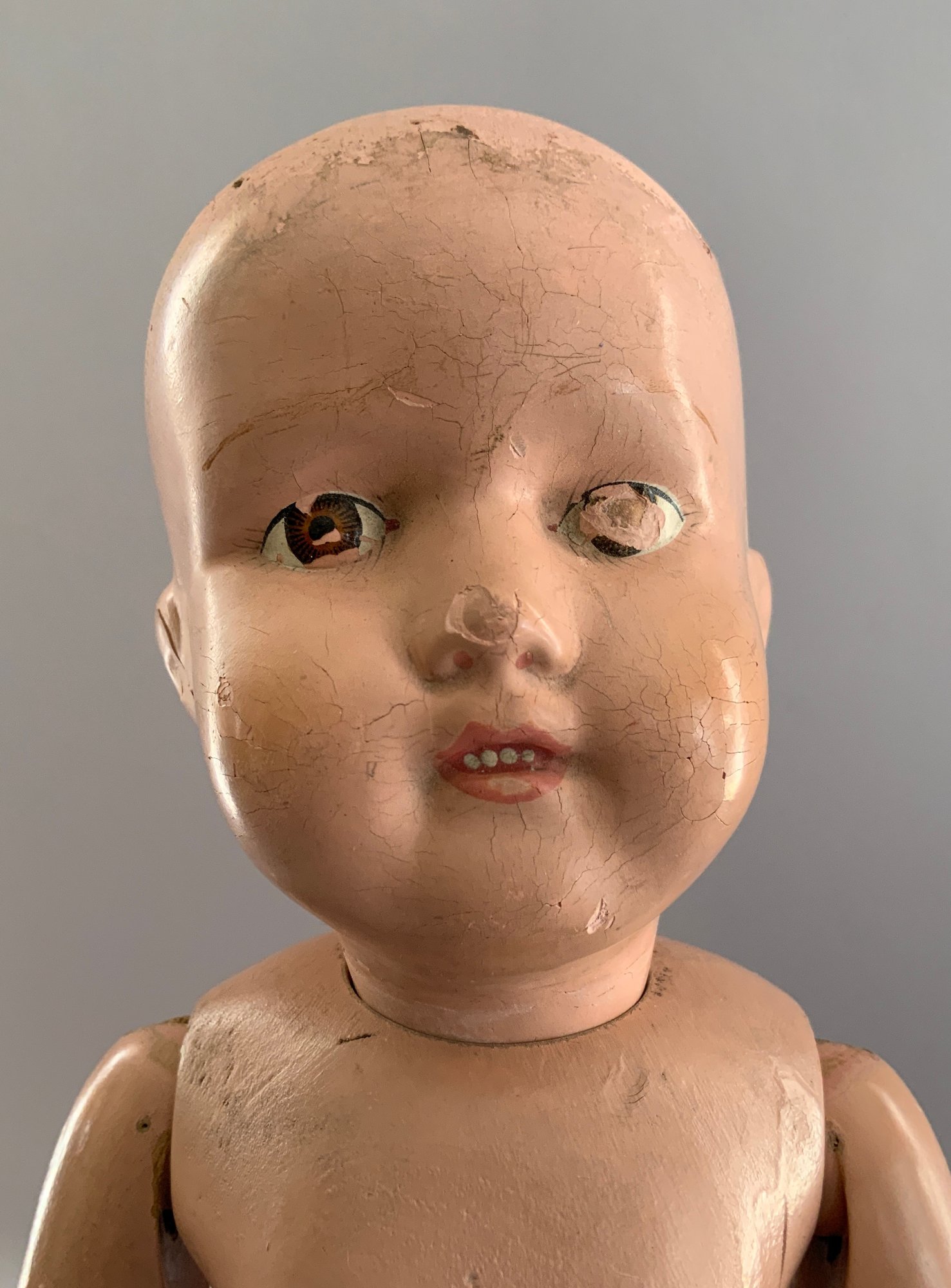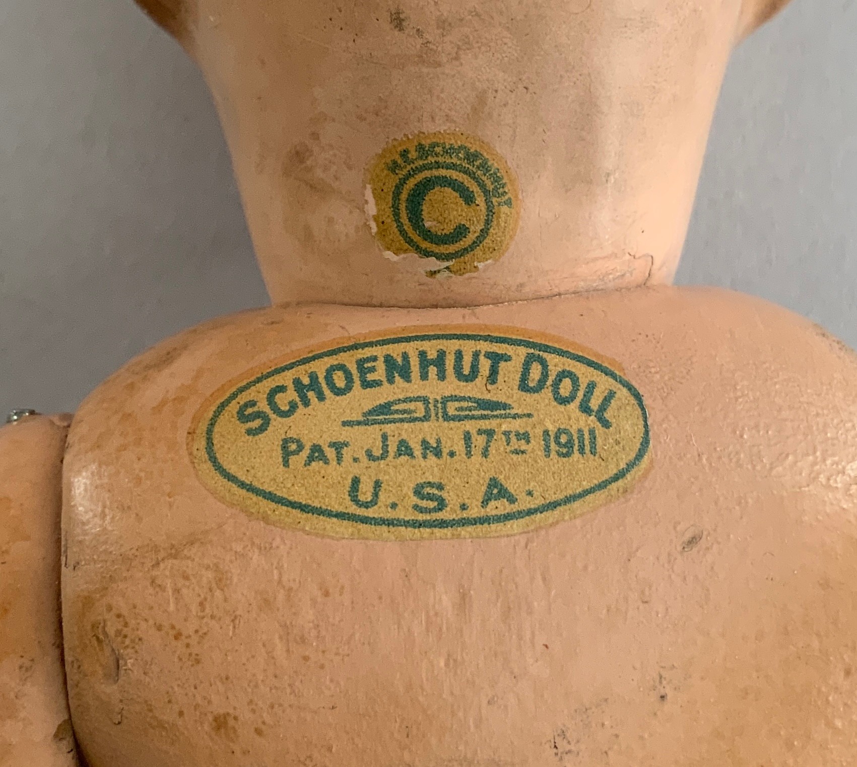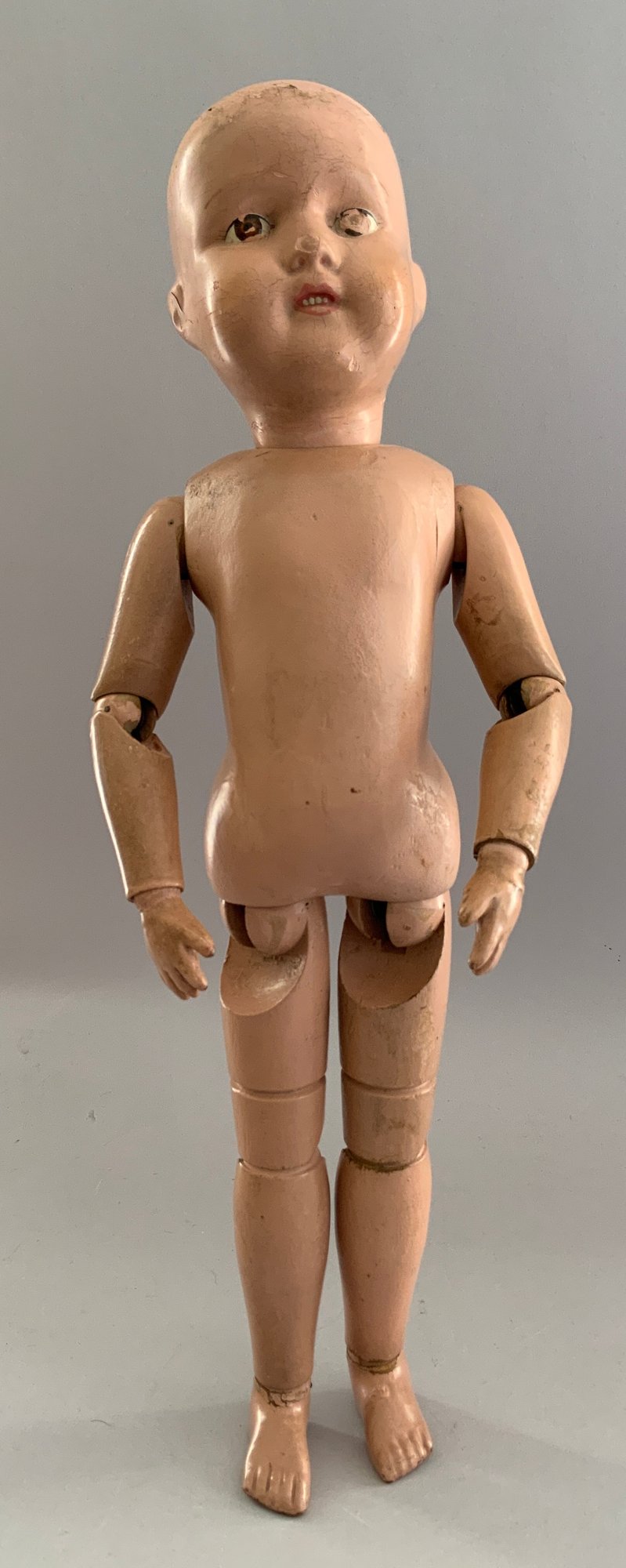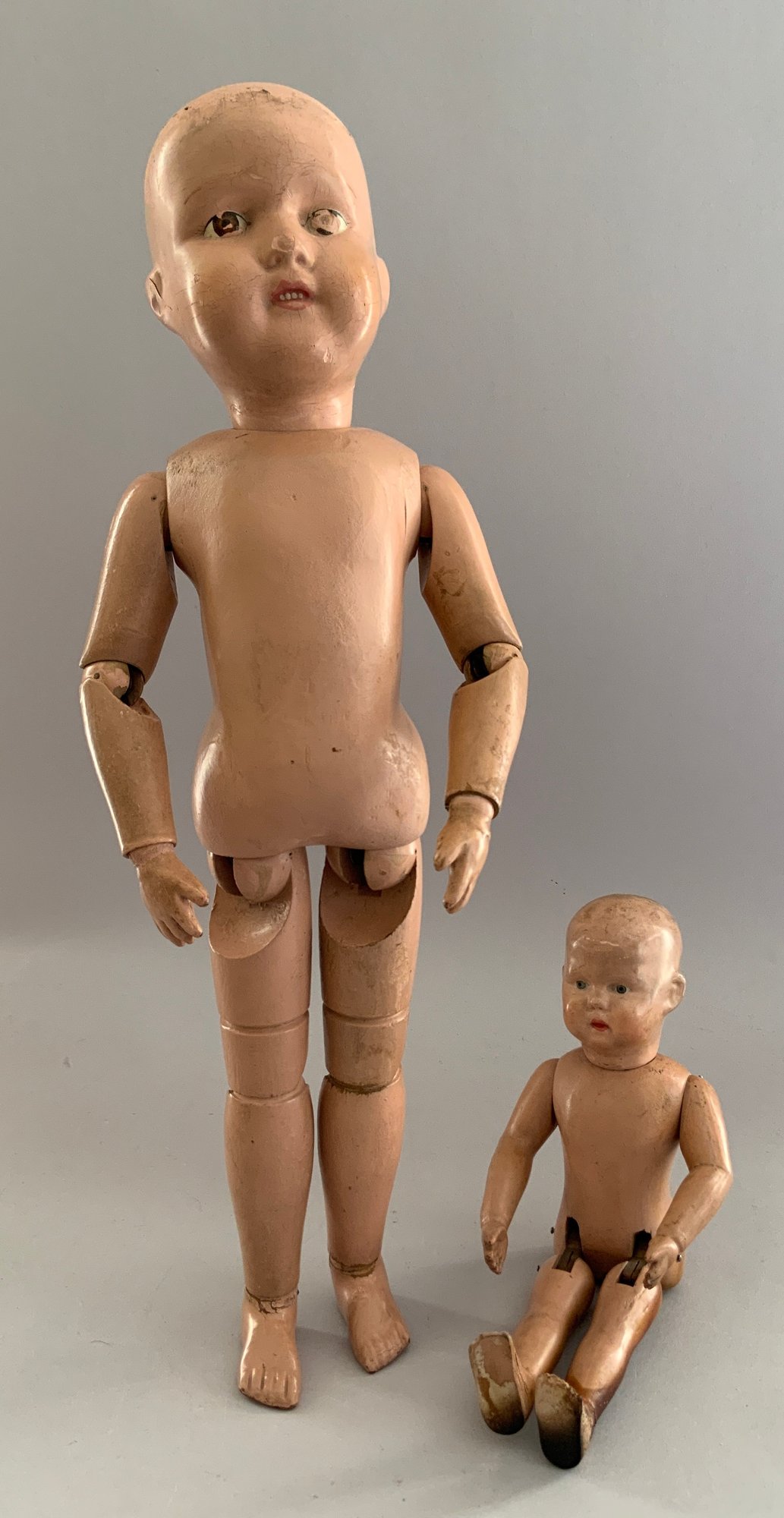 2 – Schoenhuts as found, 1- 19” naked boy, painted features, green oval label & 1 – 10 ½” toddler, straight arms, painted features, round & oval label (pat. 1911) , joint work & stains