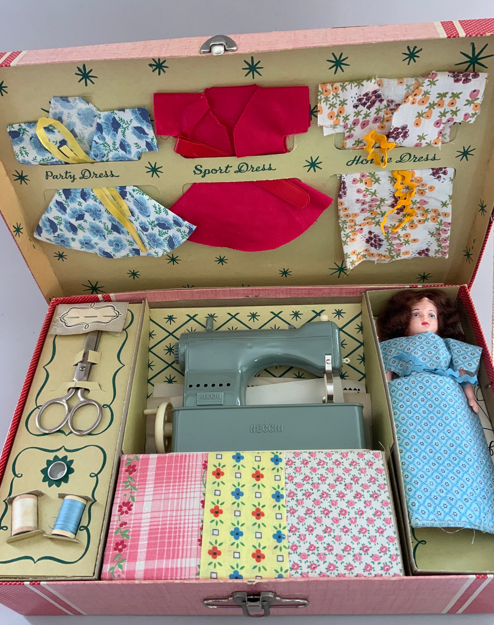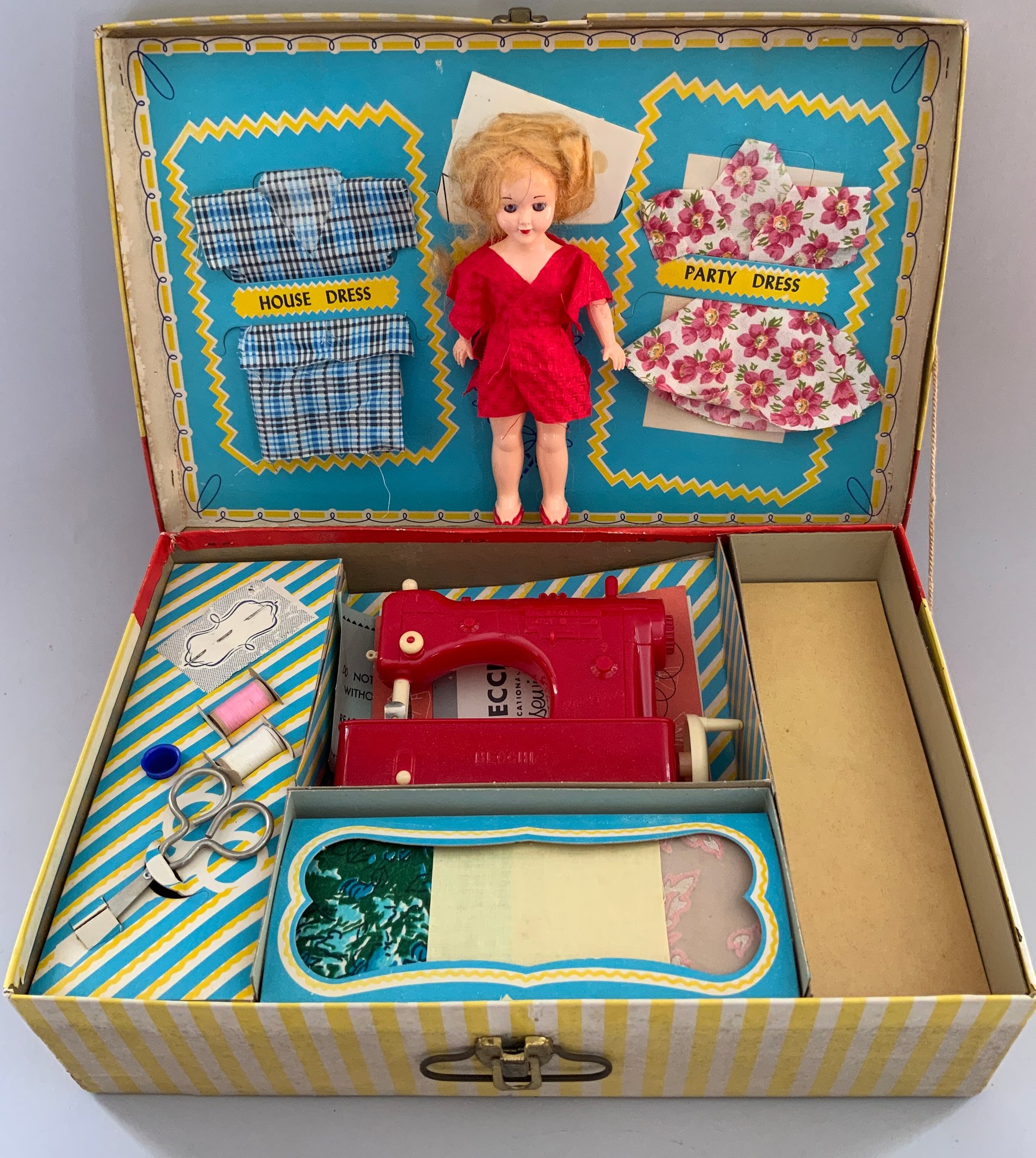 2 – Sewing Kits, Little Miss Seamstress Sewing Case # 1542, Hassenfeld Bros 1950, & Little Miss Seamstress Set # 1542, Hassenfeld Bros, original boxes