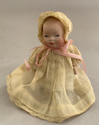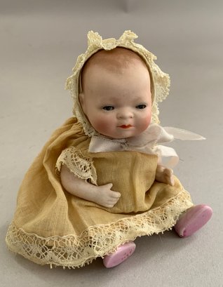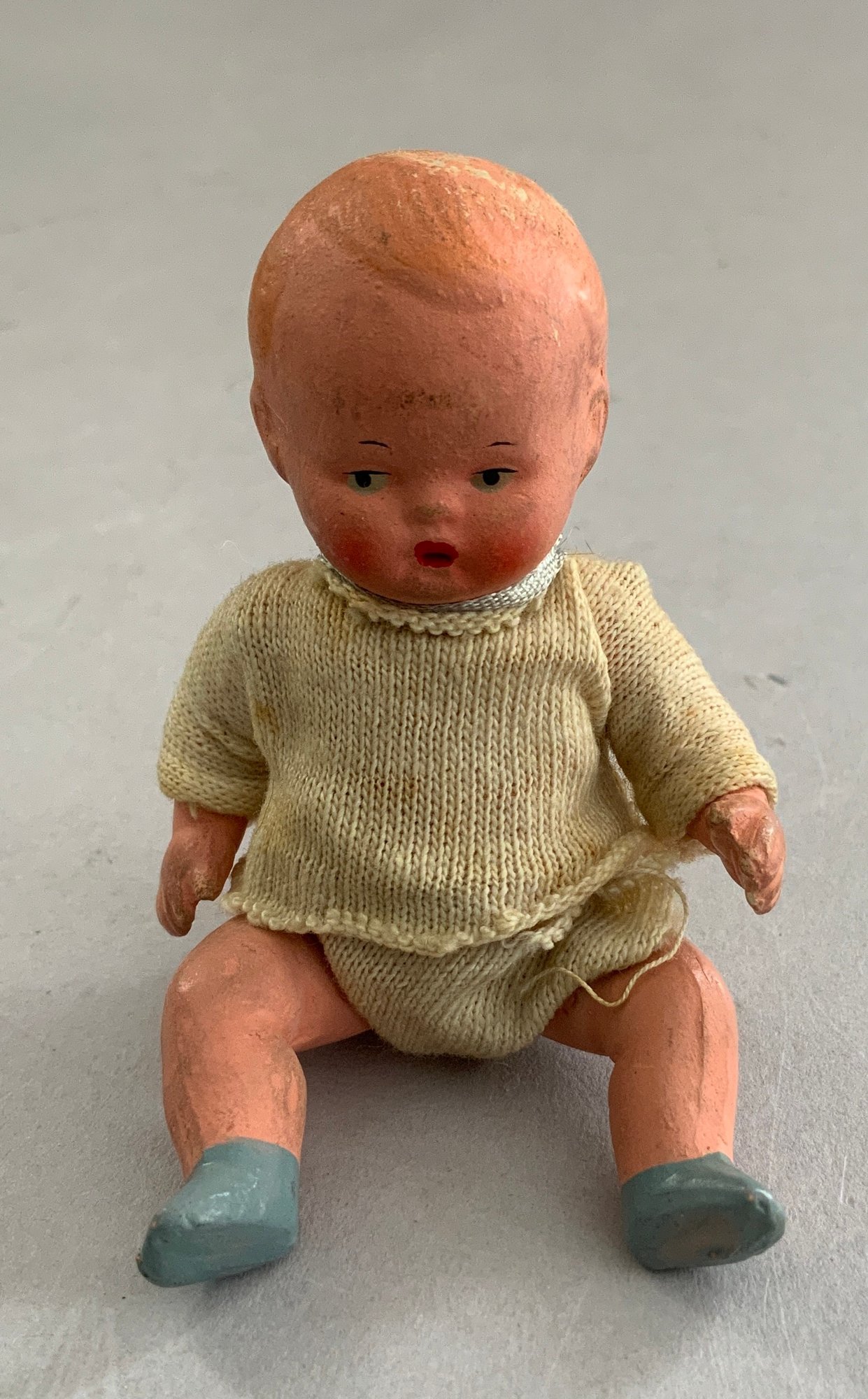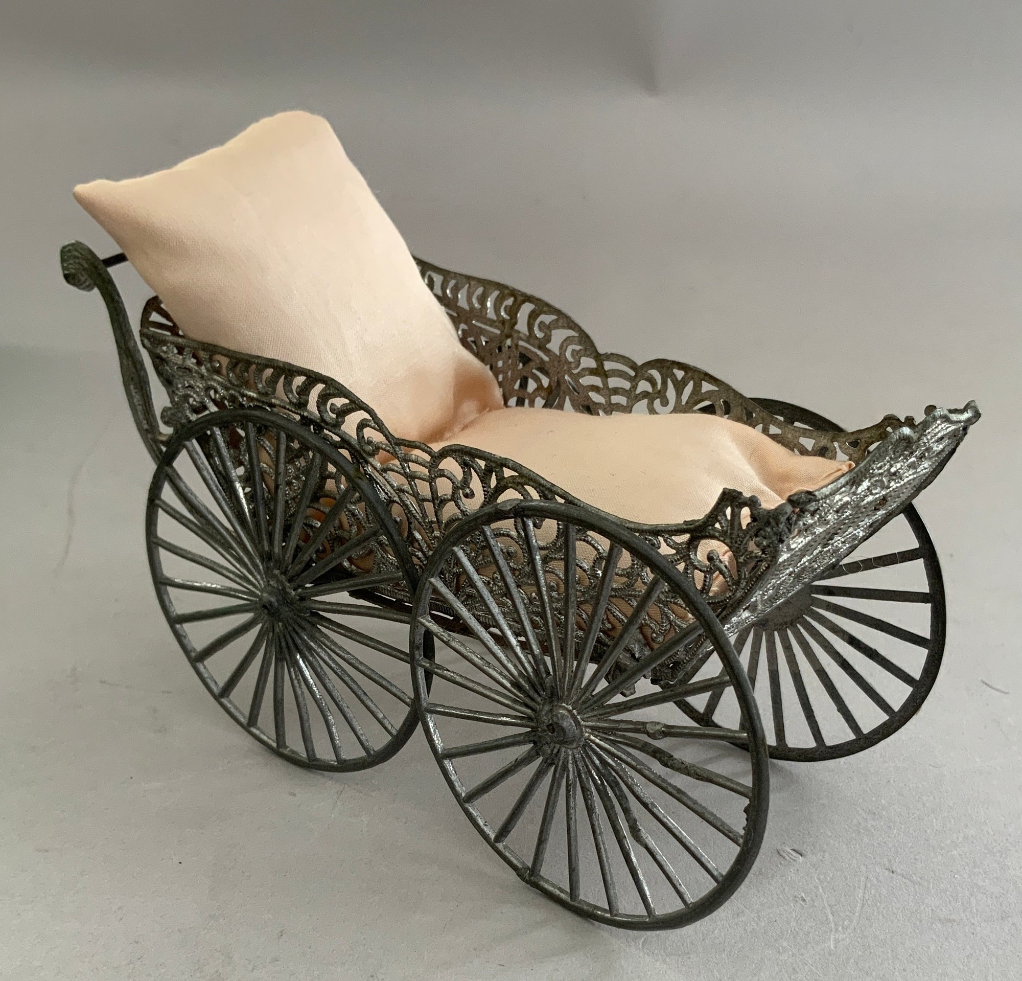2 – Small all bisque baby dolls, 1 – 4” Grace S Putnam Bye-lo painted features & 1 – 5” Bye-lo, blue glass sleep eyes, swivel neck & 1 – 5 ½” long metal baby carriage