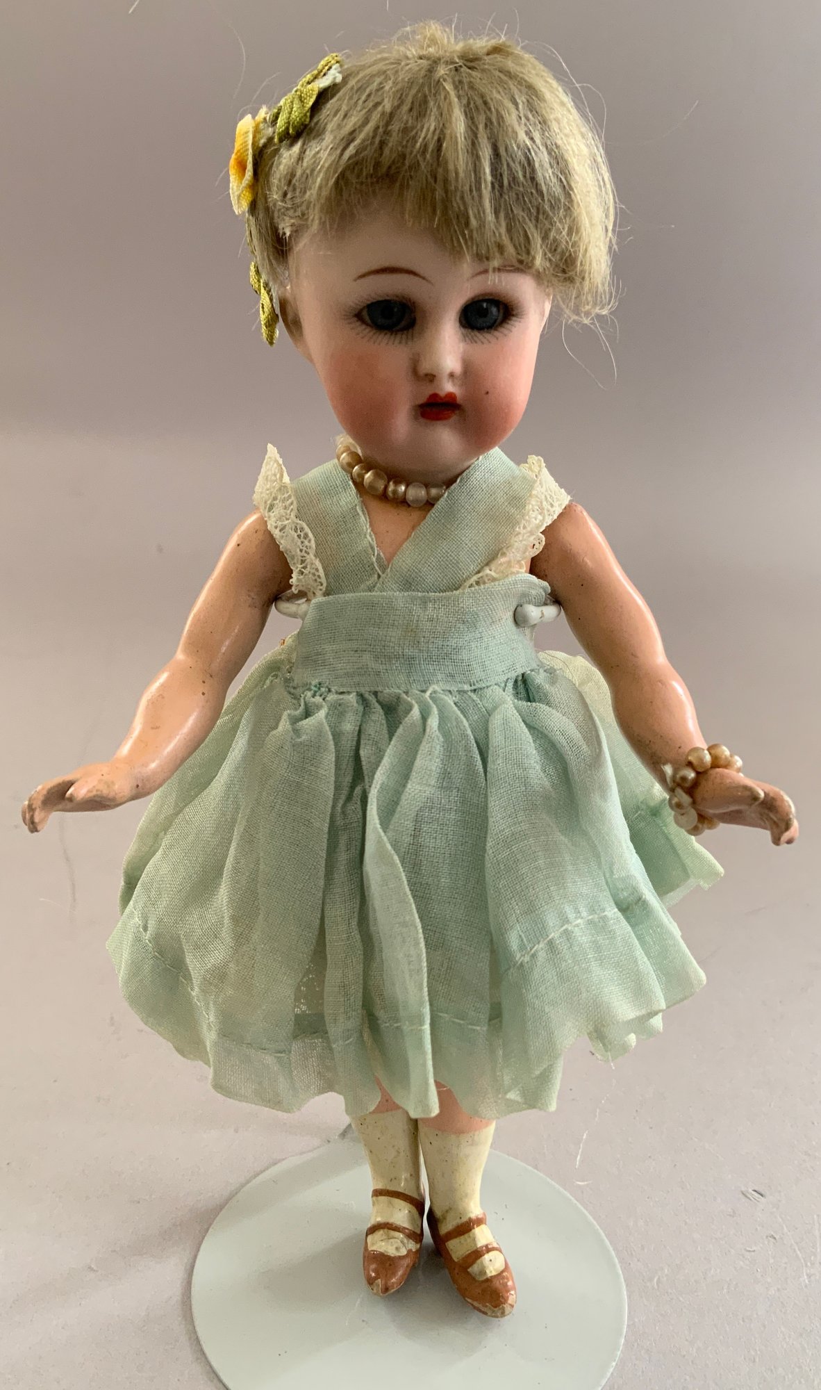 22 – Small bisque head dolls, 1 – 7” K*R Simon Halbig, blue glass sleep eyes, OM with teeth, blonde mohair wig, compo body, blue shear dress, & 1 – 8” SFBJ 60 Paris, blue glass sleep eyes, CM, brown mohair wig, compo body (cracks)