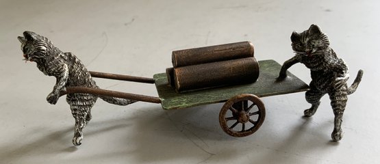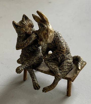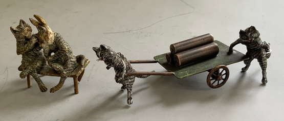 2 Small Vienna bronze cold painted figures, 1 - 1 3/4" cat & rabbit sitting on a bench, bottom marked Geschutzt & 1 - 4" two cats and a 2 wheel cart with logs, bottom marked Geschutzt, light wear