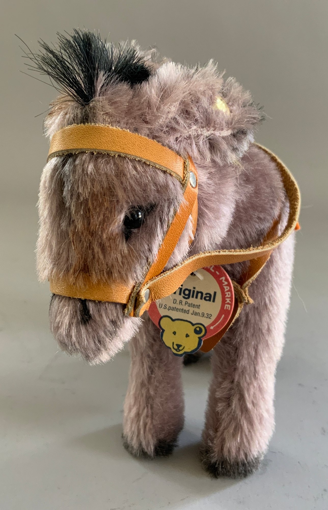 2 – Steiff animals, 1 – 8 ½” long Donkey with saddle, head moves, all tags, very good condition & 1 – 13 ½” long Raudi Dachshund dog with tags, very good condition