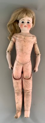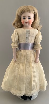 20” Bisque dome top shoulder head, blue glass eyes, CM, blonde HH wig, kid body with bisque arms, (nose & right ear spec), white dress (light stains)