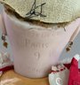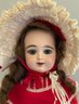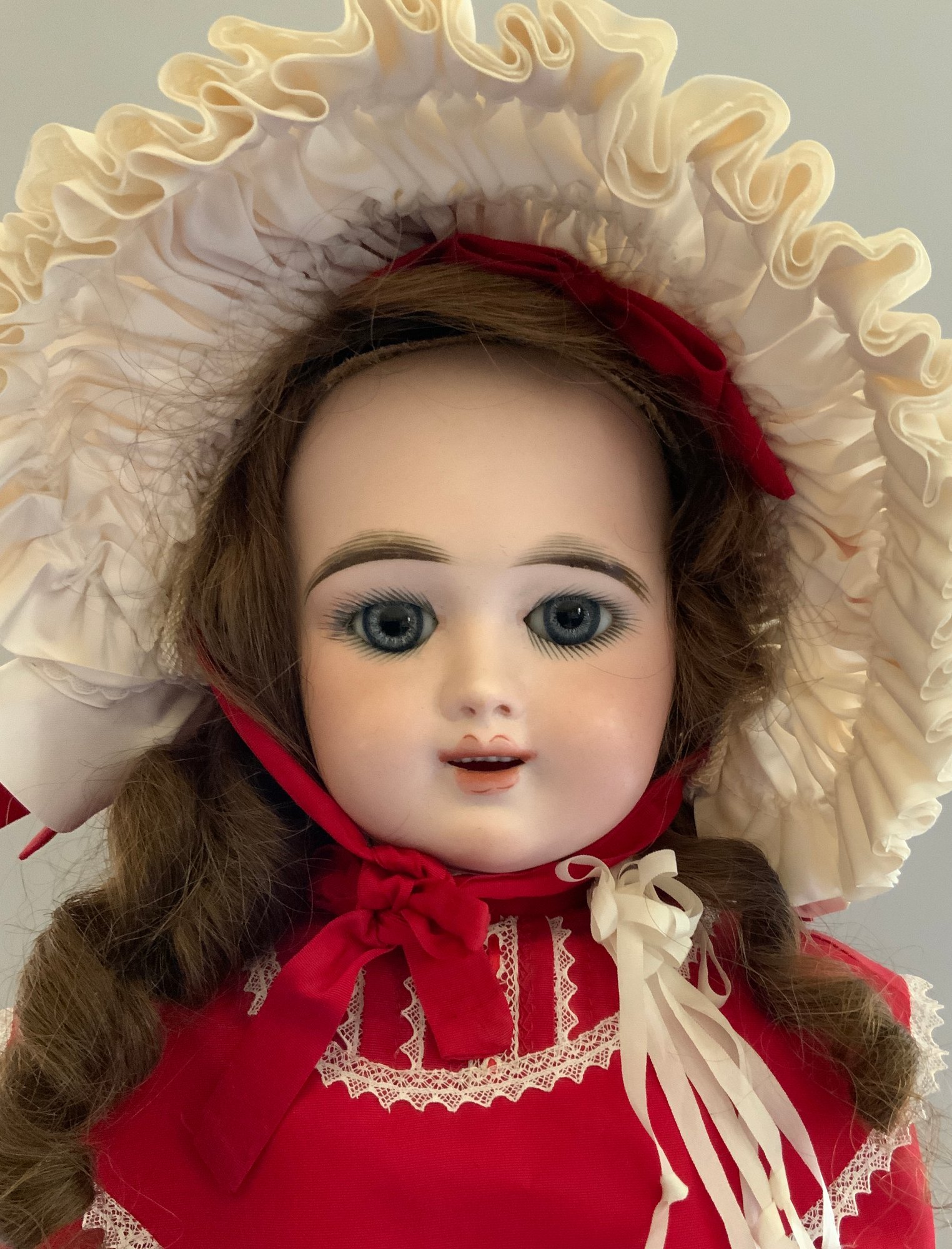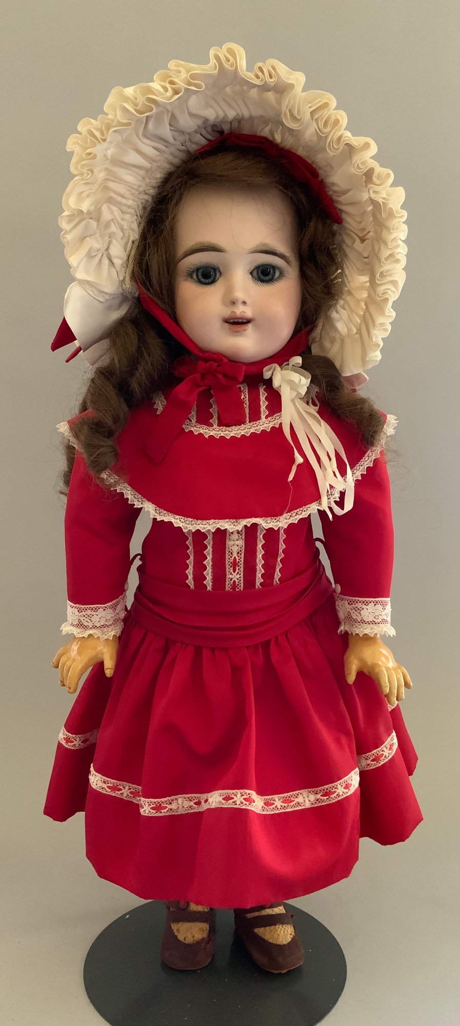 20” Eden Bebe Paris 9 Depose, blue glass paperweight eyes, OM with teeth, PE, brown mohair wig, compo body, red silk dress, gray shoes
