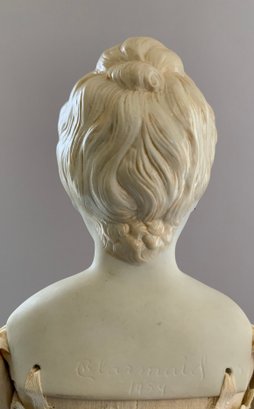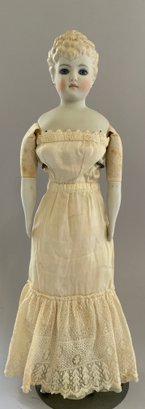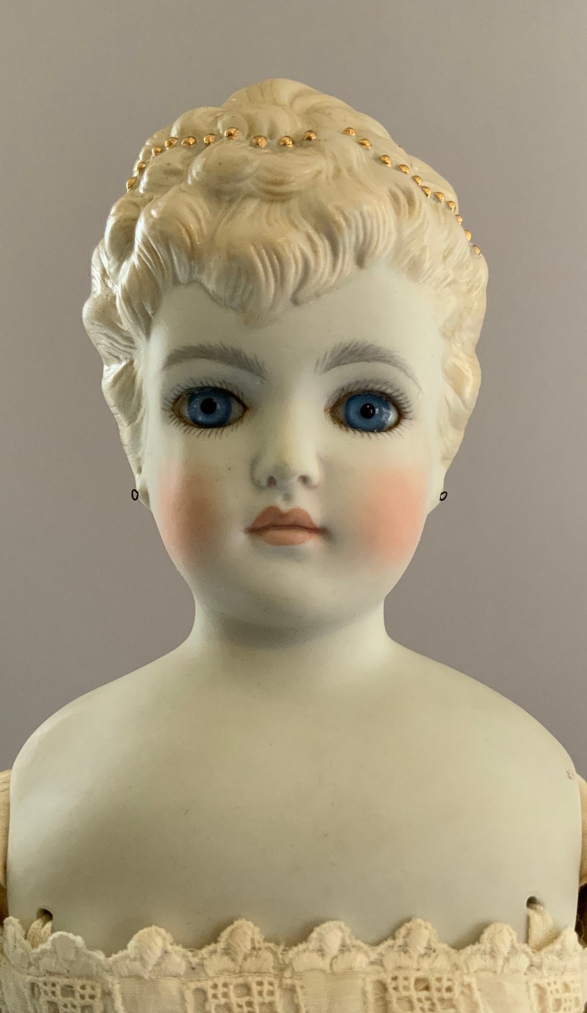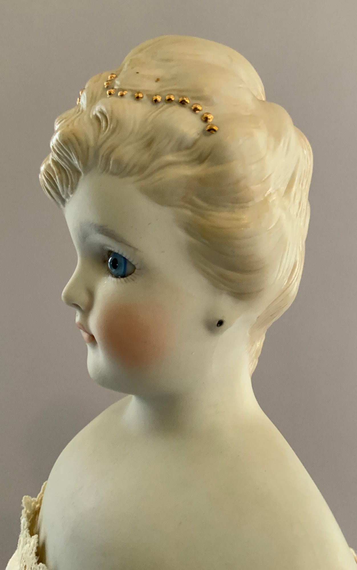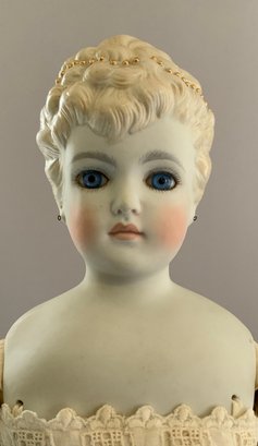 20” Emma Clear shoulder head parian artist doll 1959, blue glass eyes, sculpted blonde hair with gold beads, PE, cloth body with parian limbs (staining), white undies