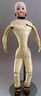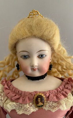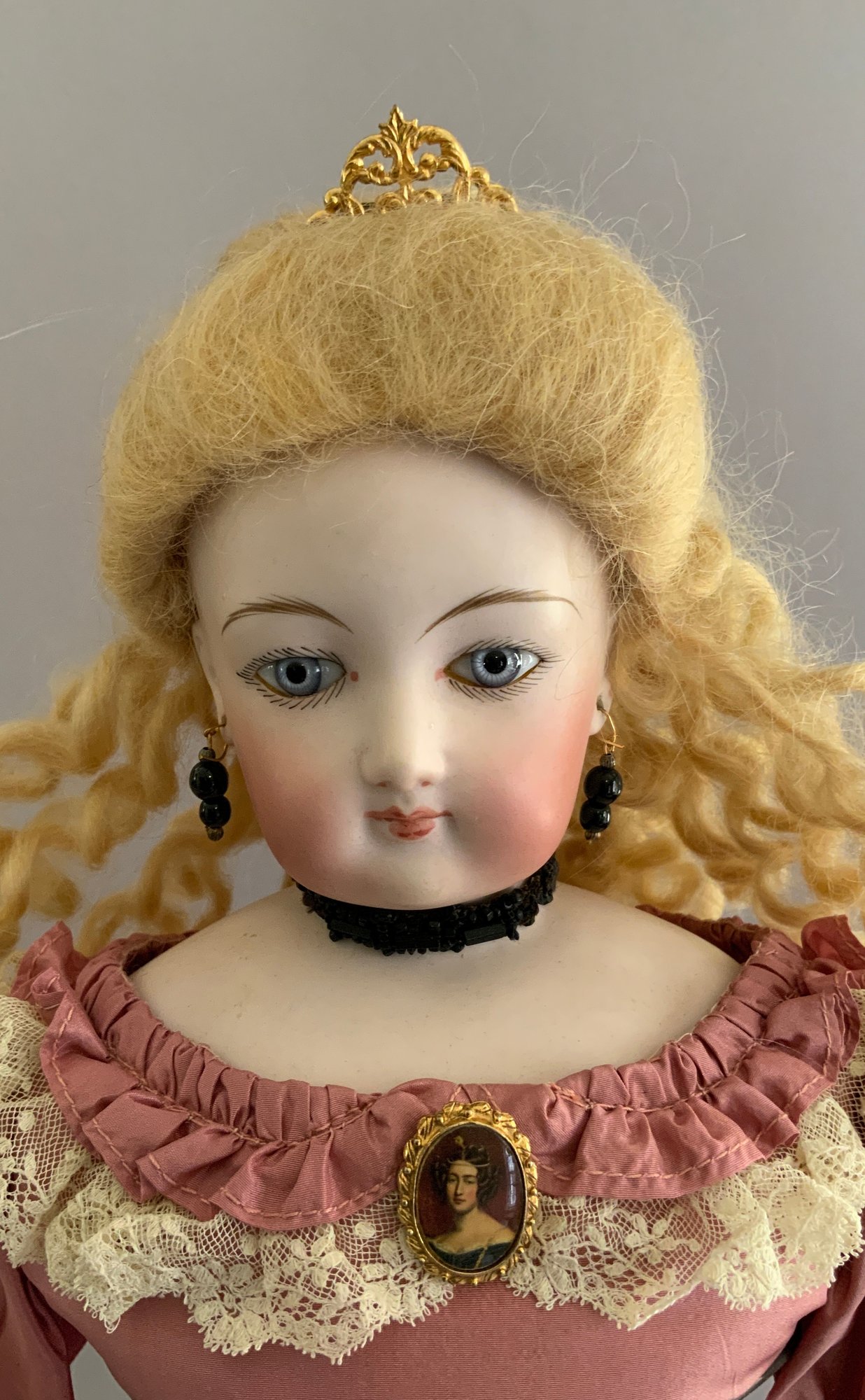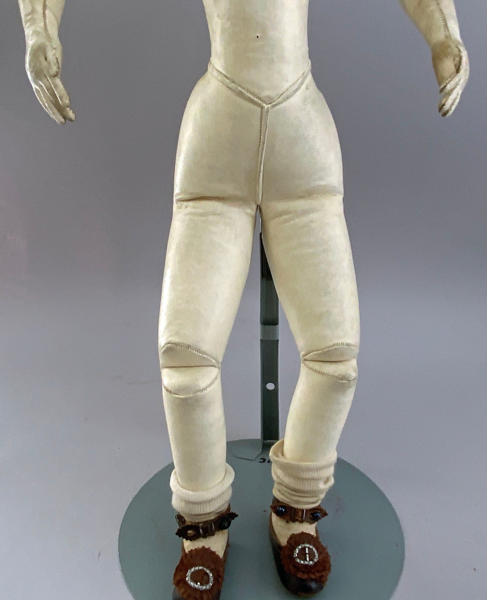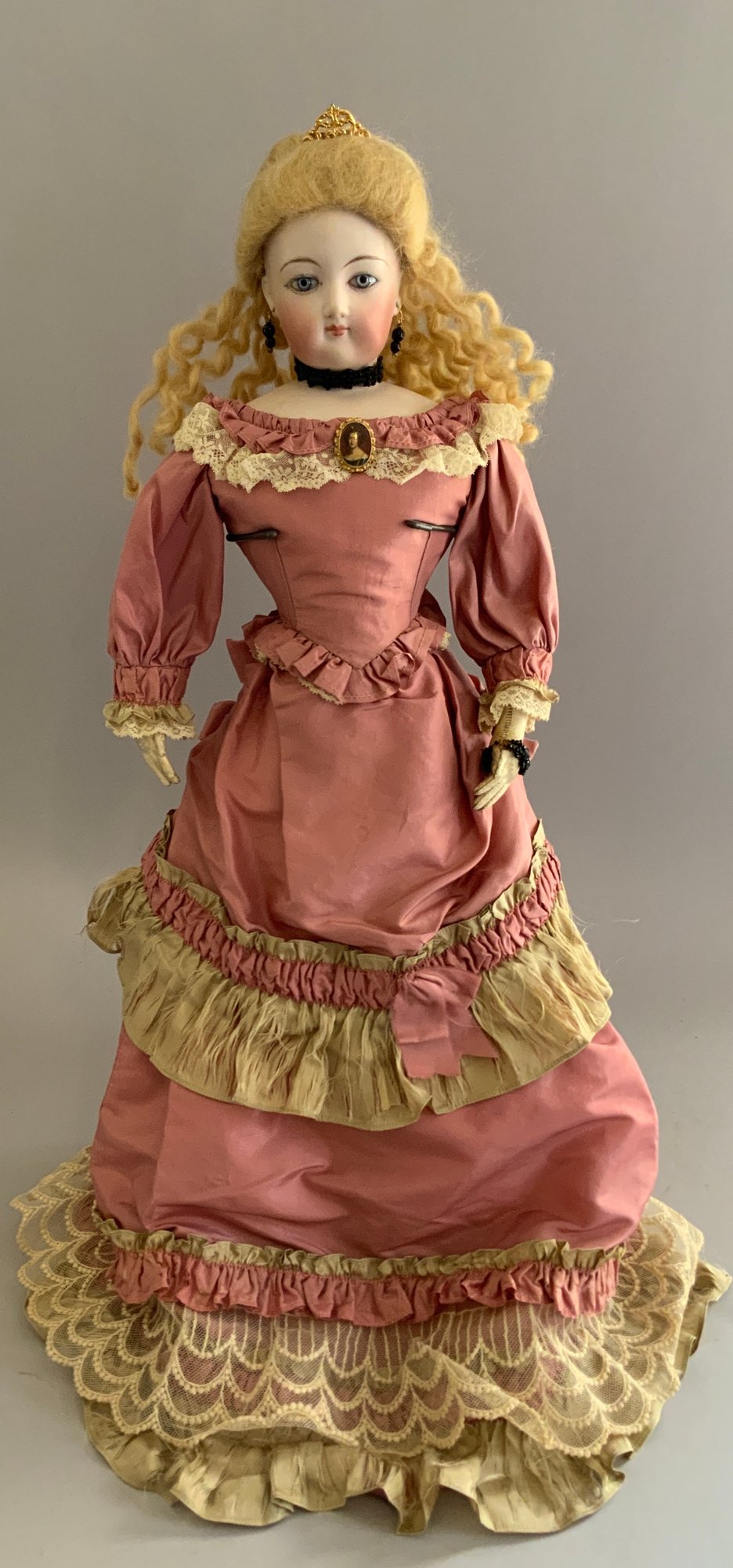 20” French Fashion 5, swivel neck, blue glass eyes, CM, PE, blonde mohair wig, kid body, silk rose/tan walking suit (melting), brown leather shoes
