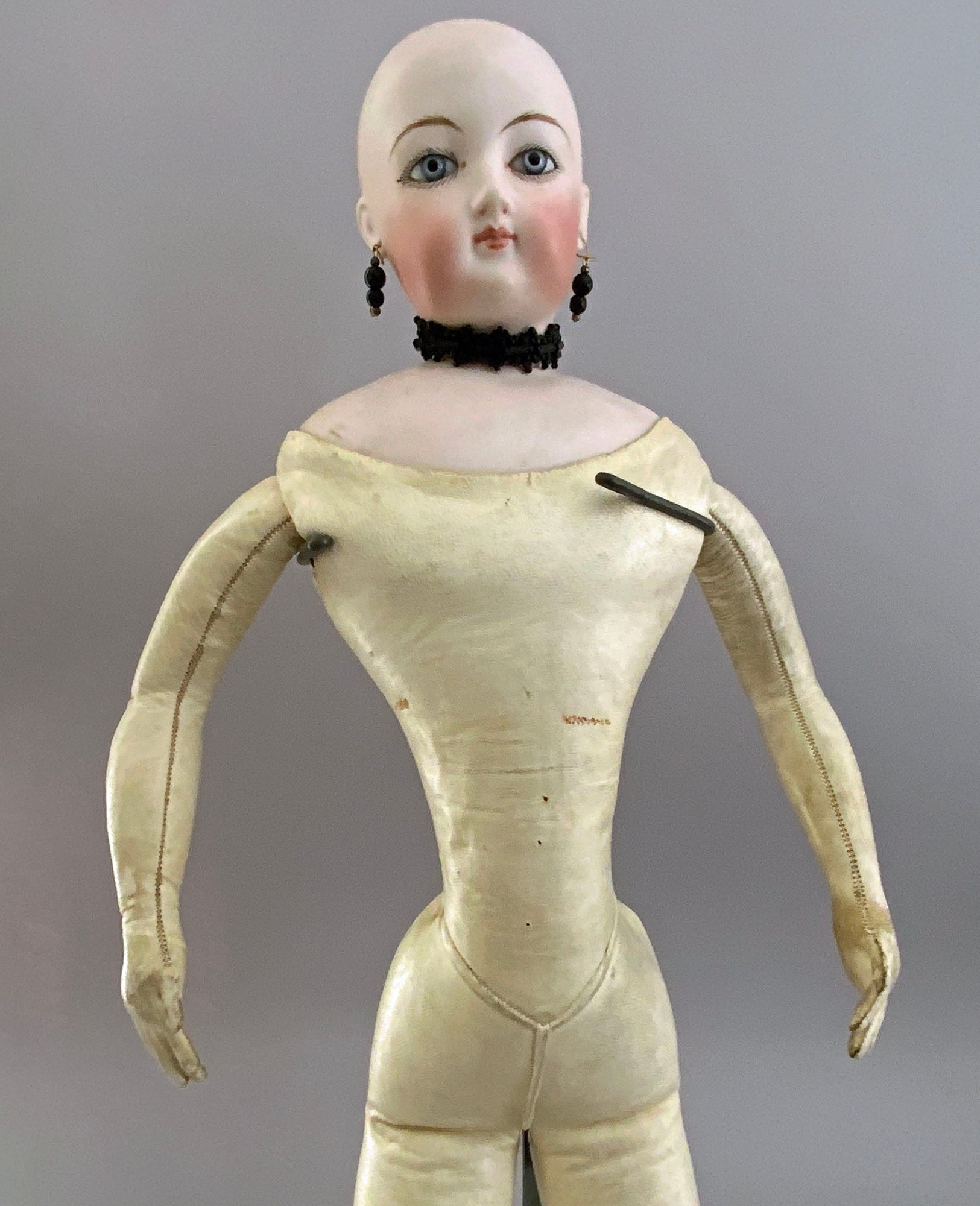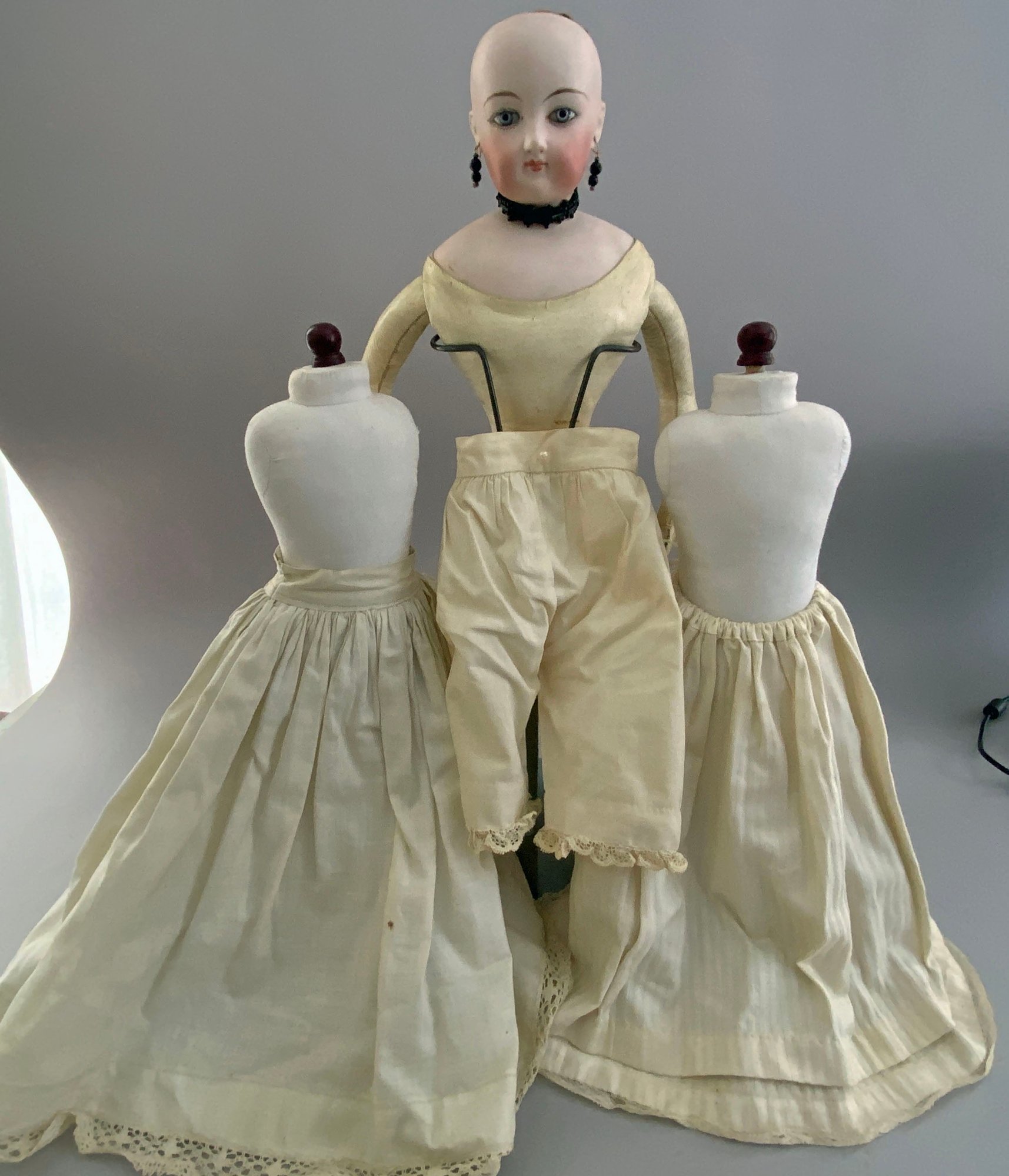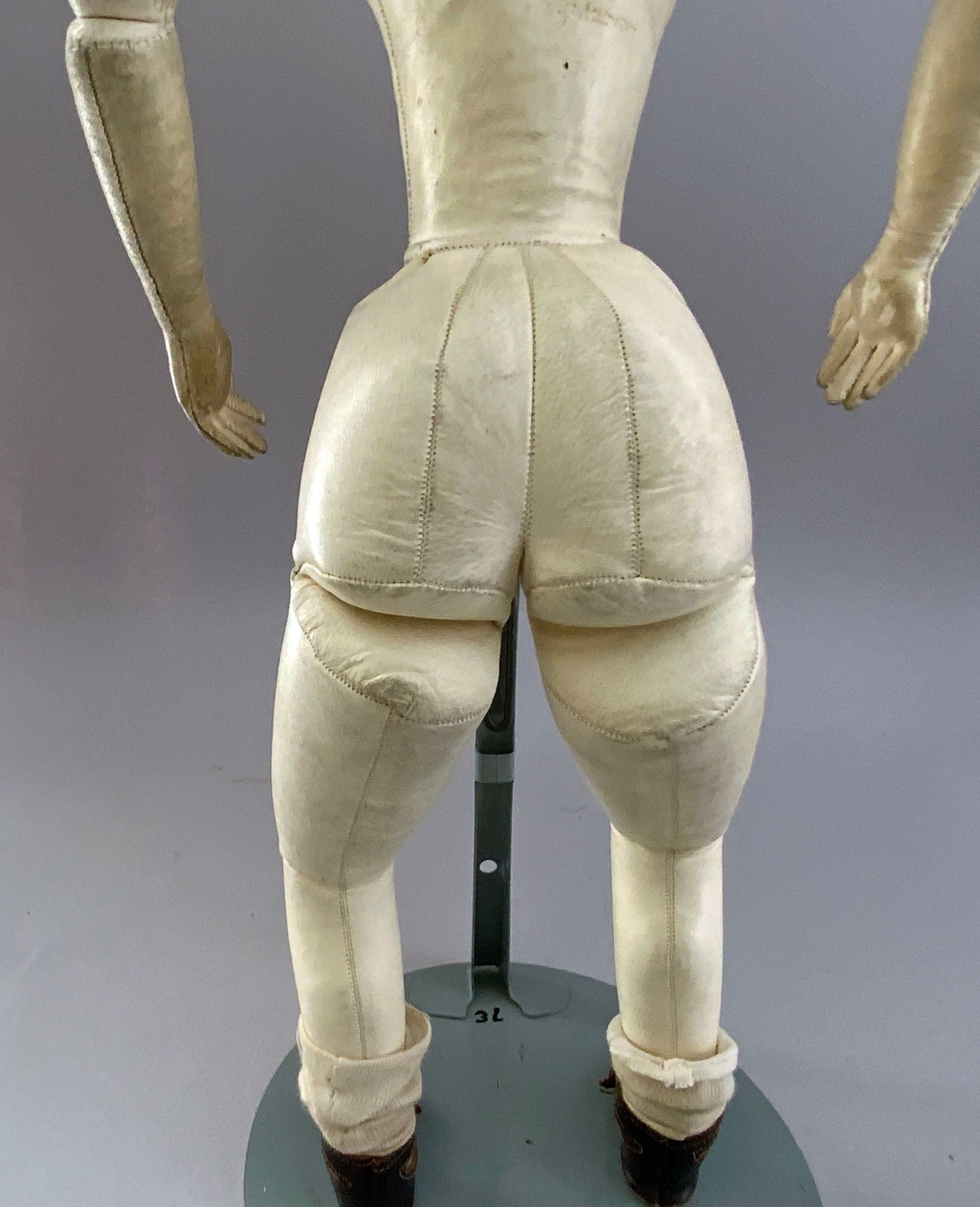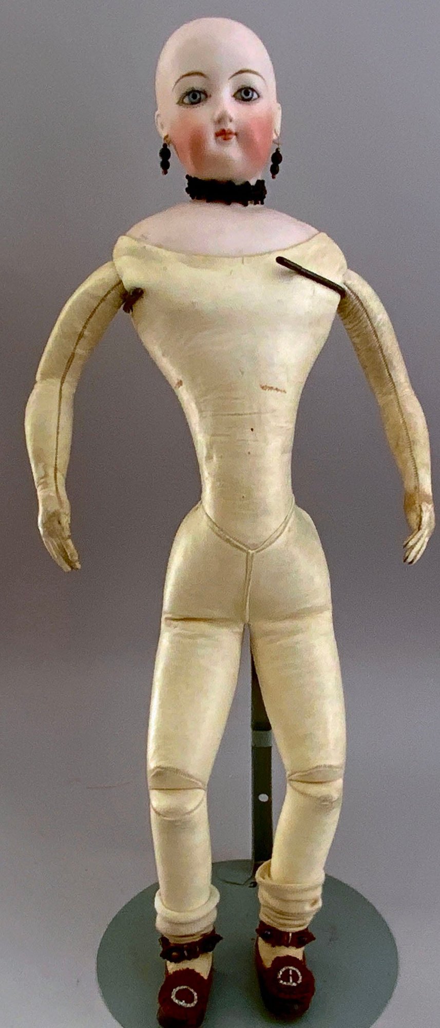20” French Fashion 5, swivel neck, blue glass eyes, CM, PE, blonde mohair wig, kid body, silk rose/tan walking suit (melting), brown leather shoes