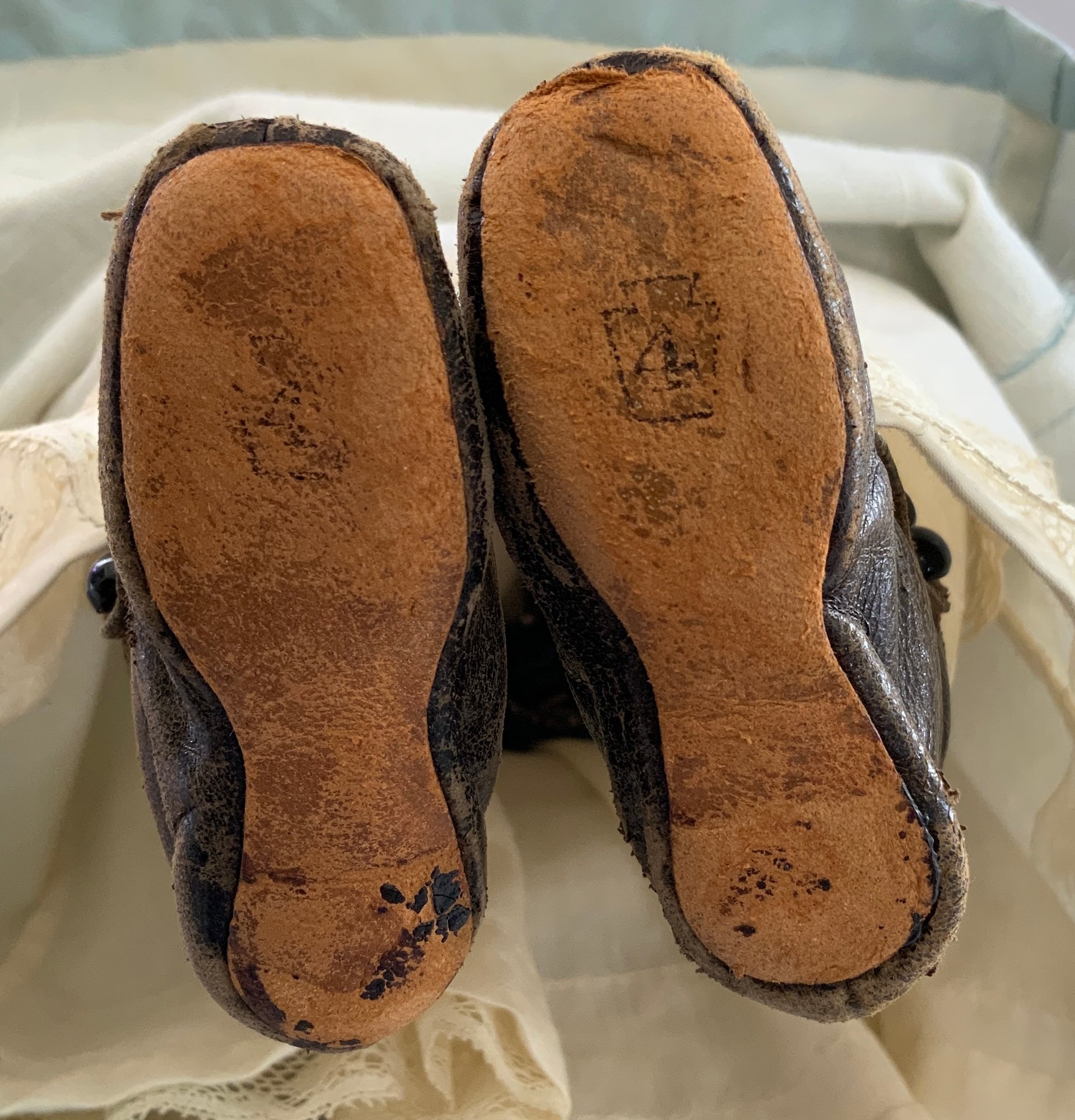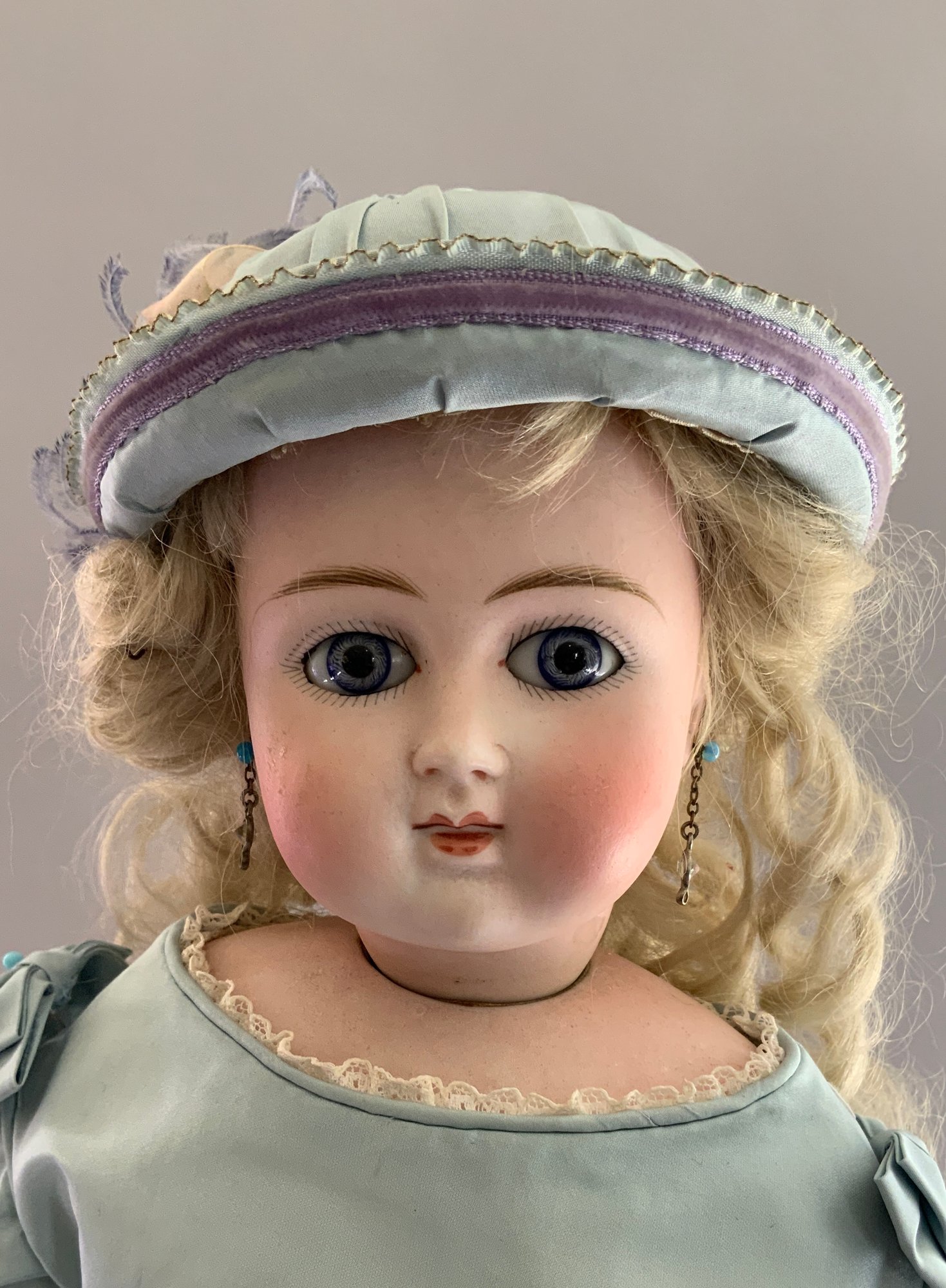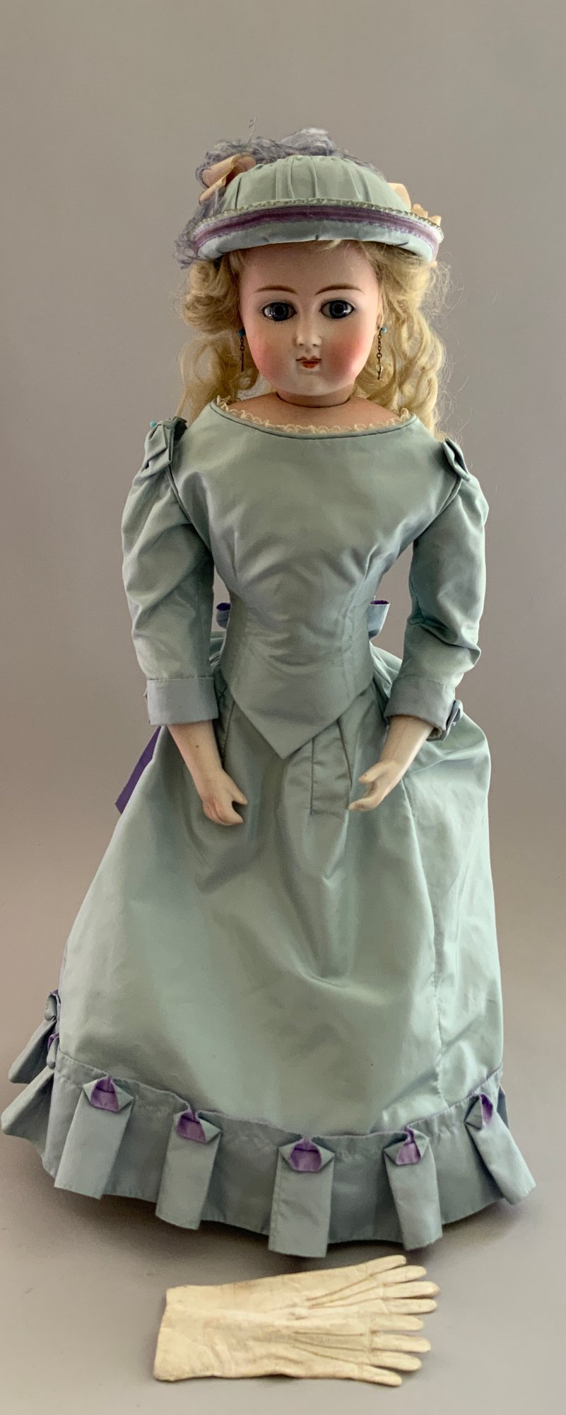 20” French Fashion swivel neck, blue glass paperweight eyes, no mark, CM, PE, kid body with bisque arms, blue silk dress with lavender trim, brown leather boots