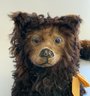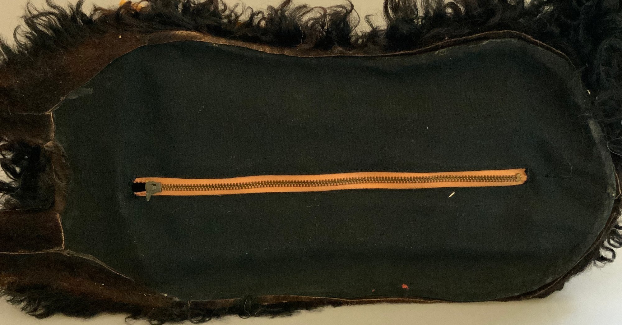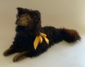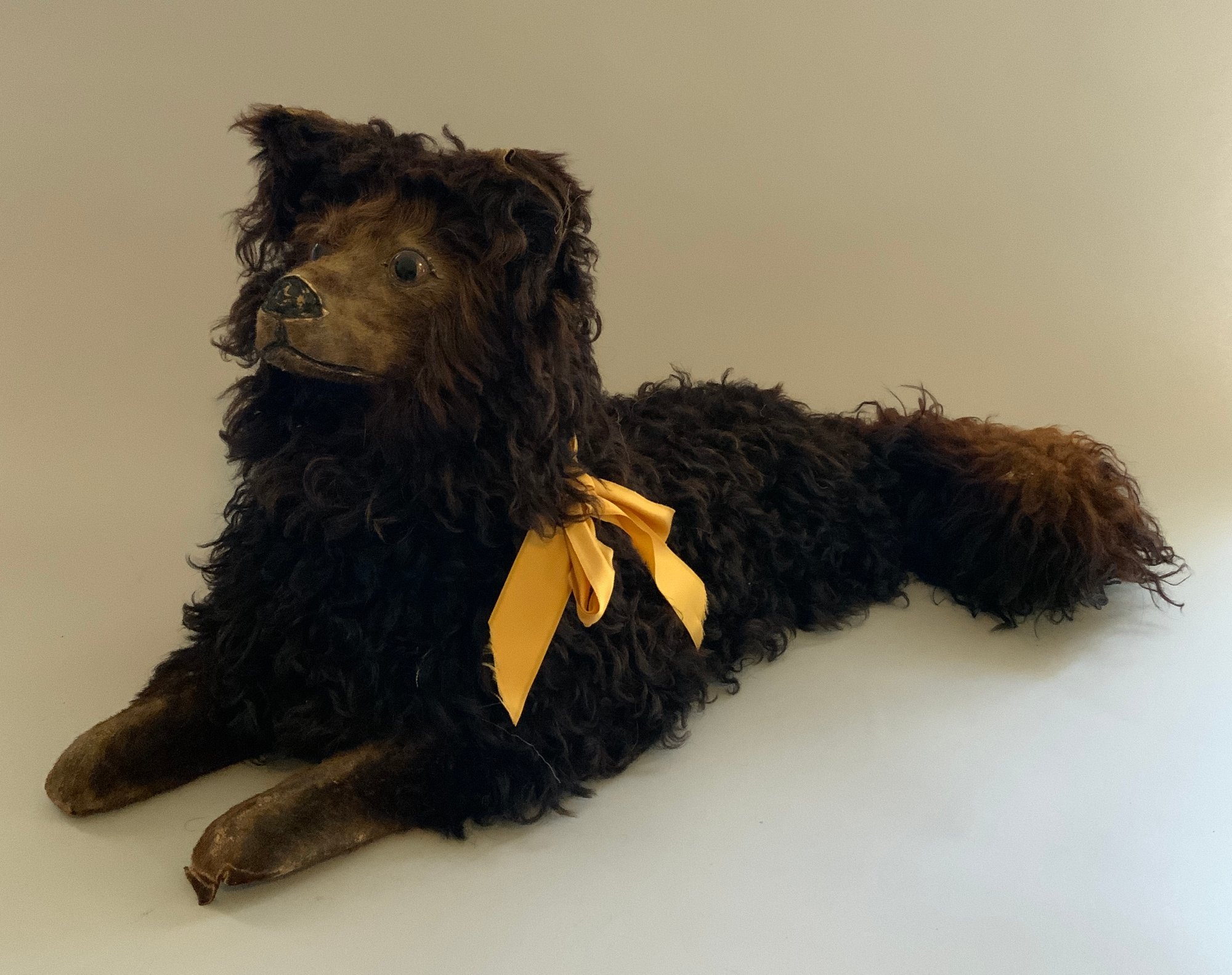 20” French pajama dog, dark brown mohair & paper mache, glass eyes, some wear spots. with zipper pouch