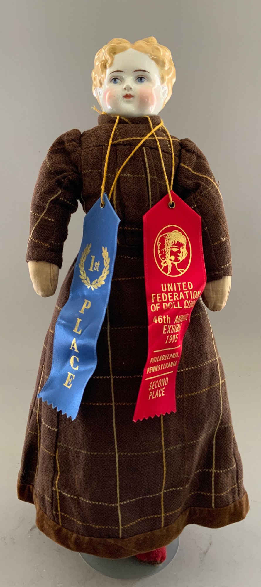 21” China shoulder head, center part sculpted blonde hair, painted features, cloth body with stump hands & feet, early brown wool dress, 1st & 2nd place ribbons