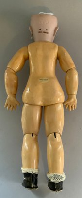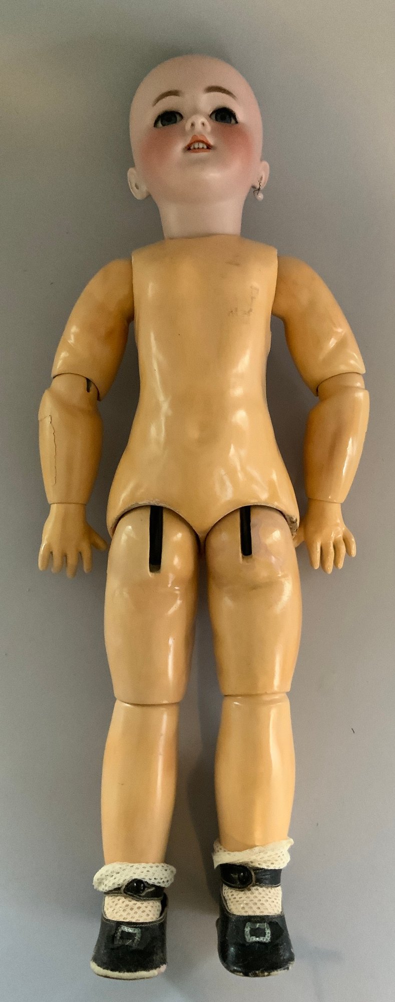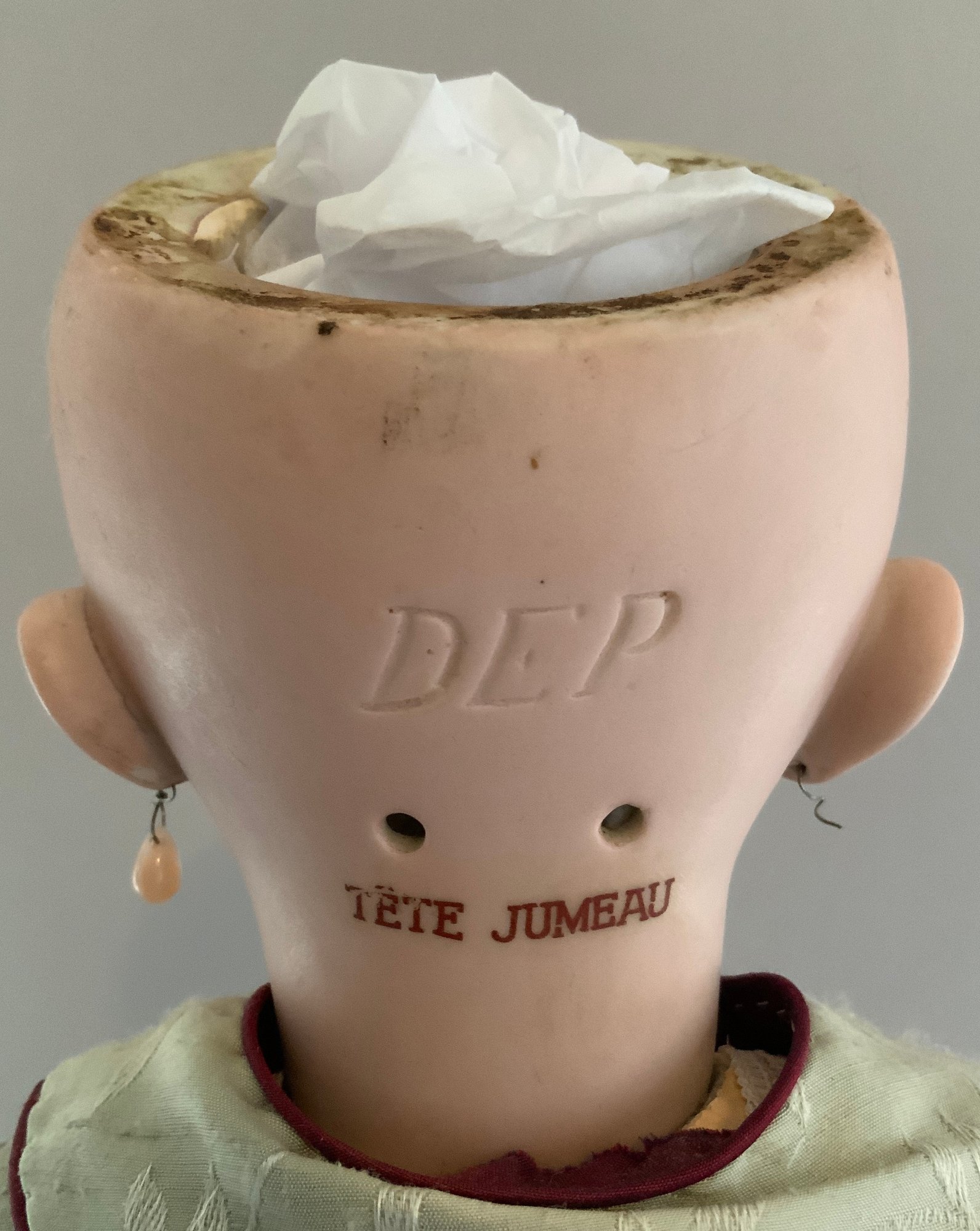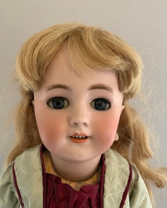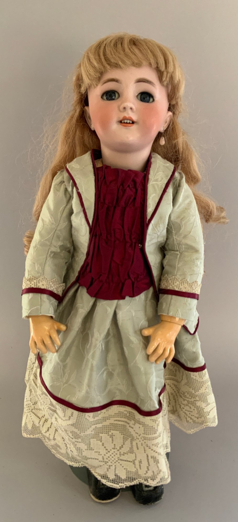 21” DEP Tete Jumeau 9 red mark, blue glass sleep eyes, OM with teeth, PE, compo oval Jumeau paper label (some cracking), silk pale blue dress