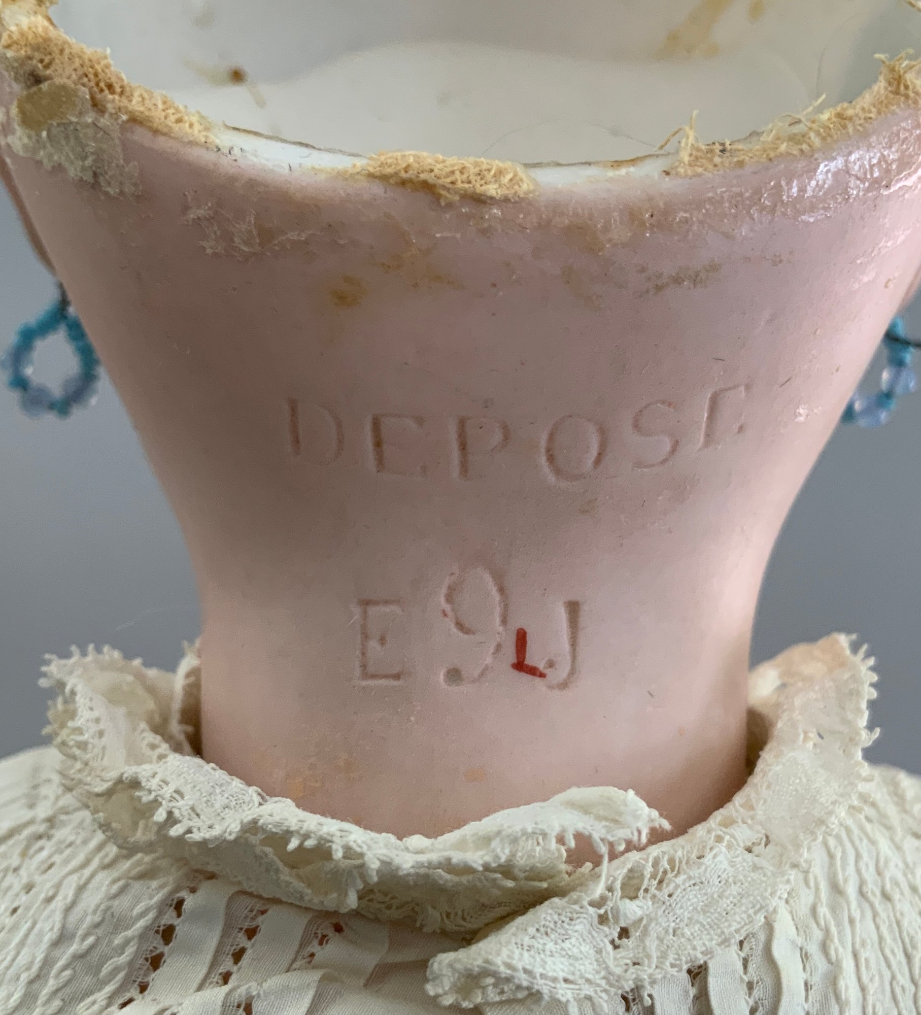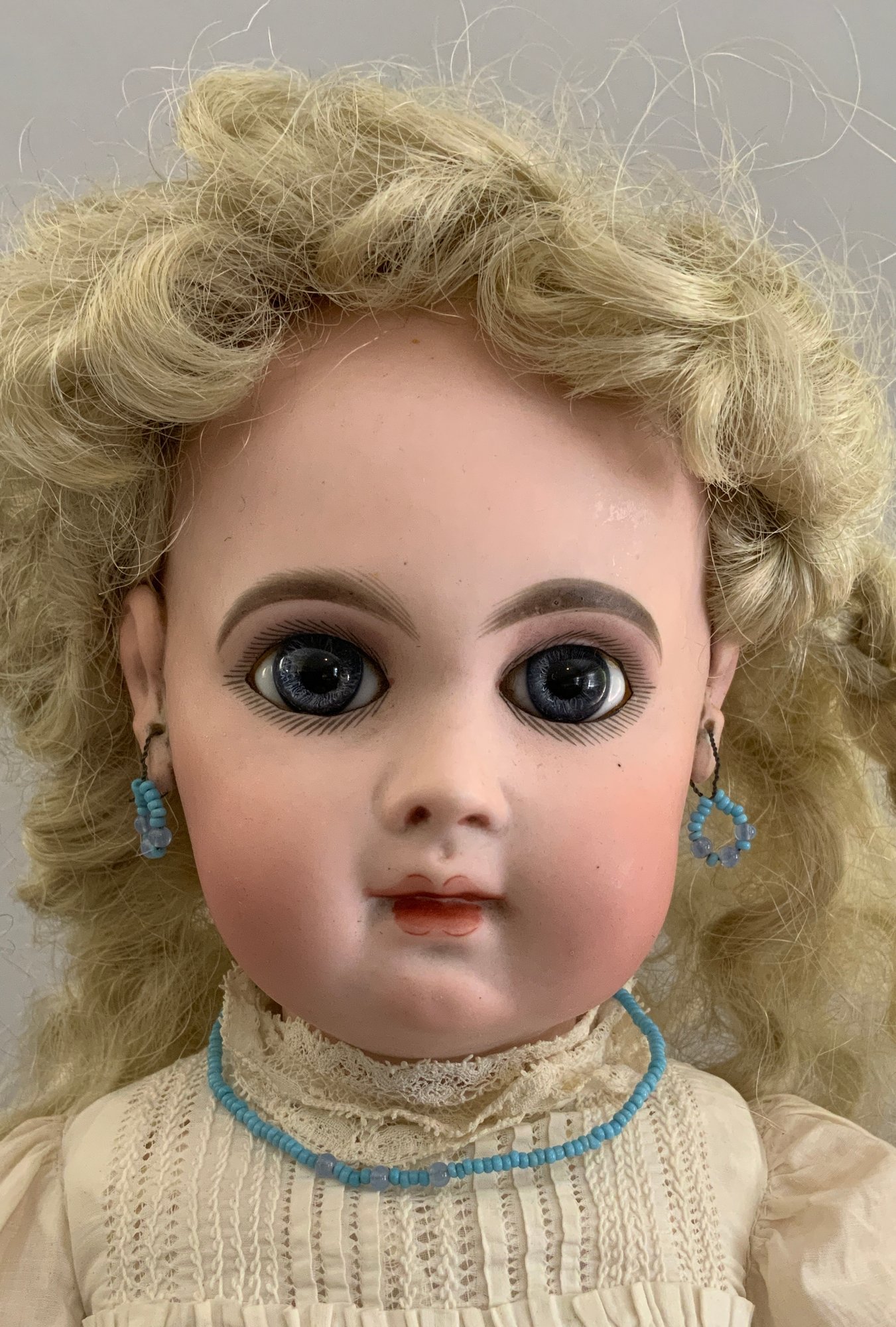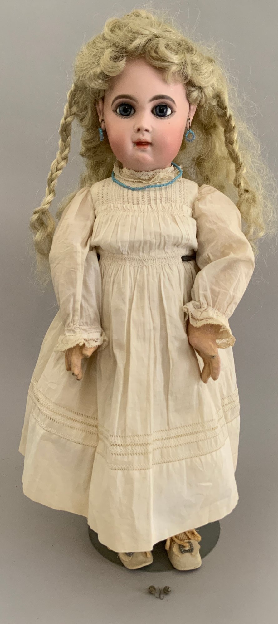 21” Depose E9J Jumeau, blue glass eyes, CM, PE (left ear nick), blonde mohair wig, blue stamp Jumeau crier body, white antique dress (hairline over right eye)