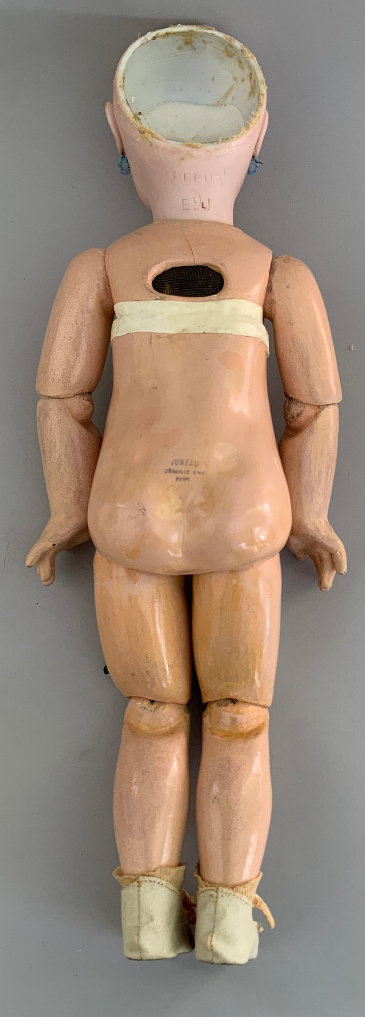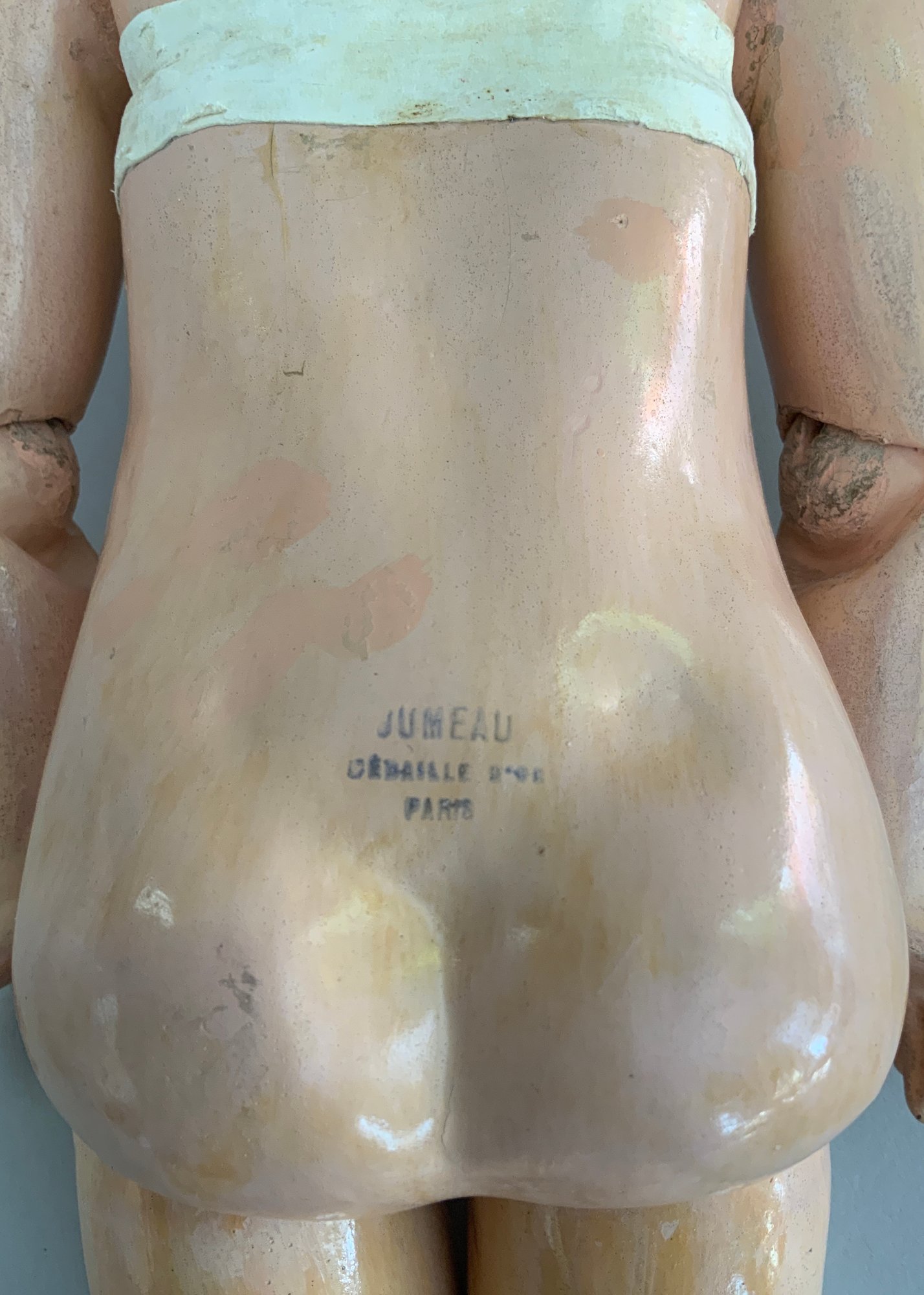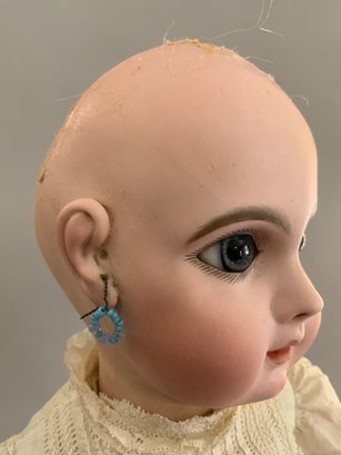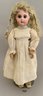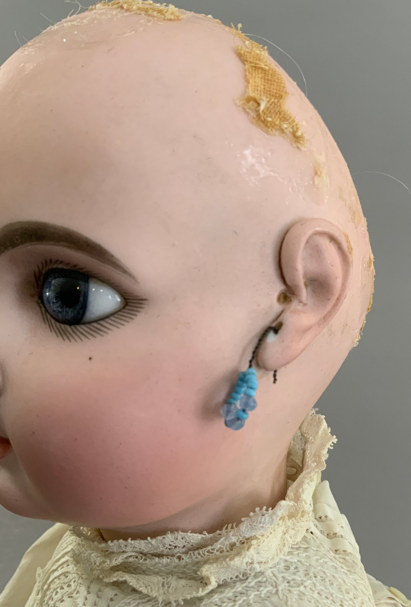21” Depose E9J Jumeau, blue glass eyes, CM, PE (left ear nick), blonde mohair wig, blue stamp Jumeau crier body, white antique dress (hairline over right eye)