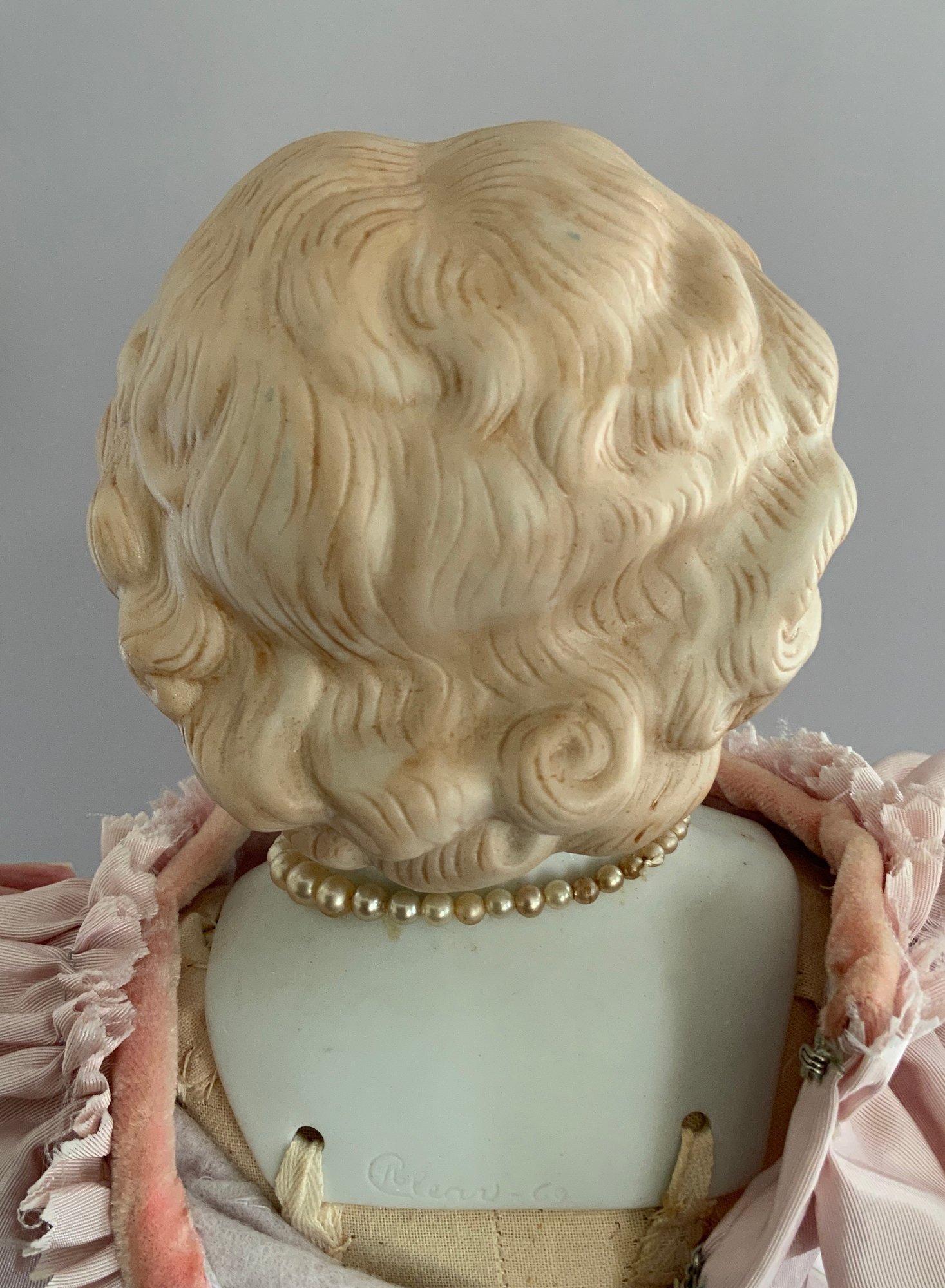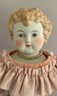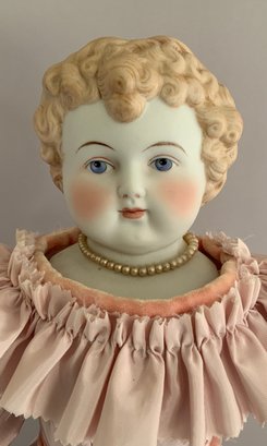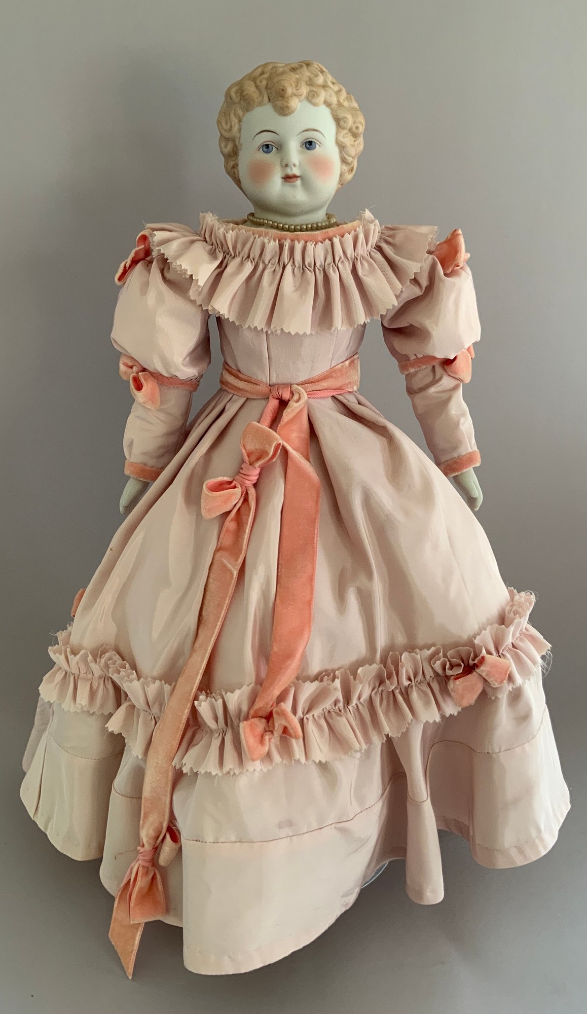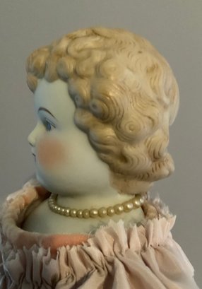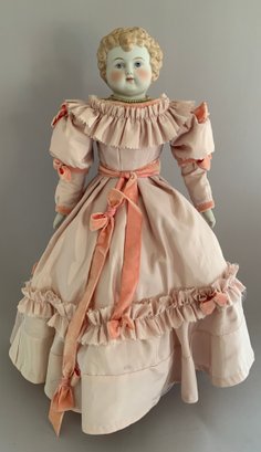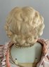 21” Emma Clear shoulder head artist doll 1969, painted features. Blonde sculpted hair, cloth body with parian limbs, blue shoes with gold trim, pink dress