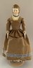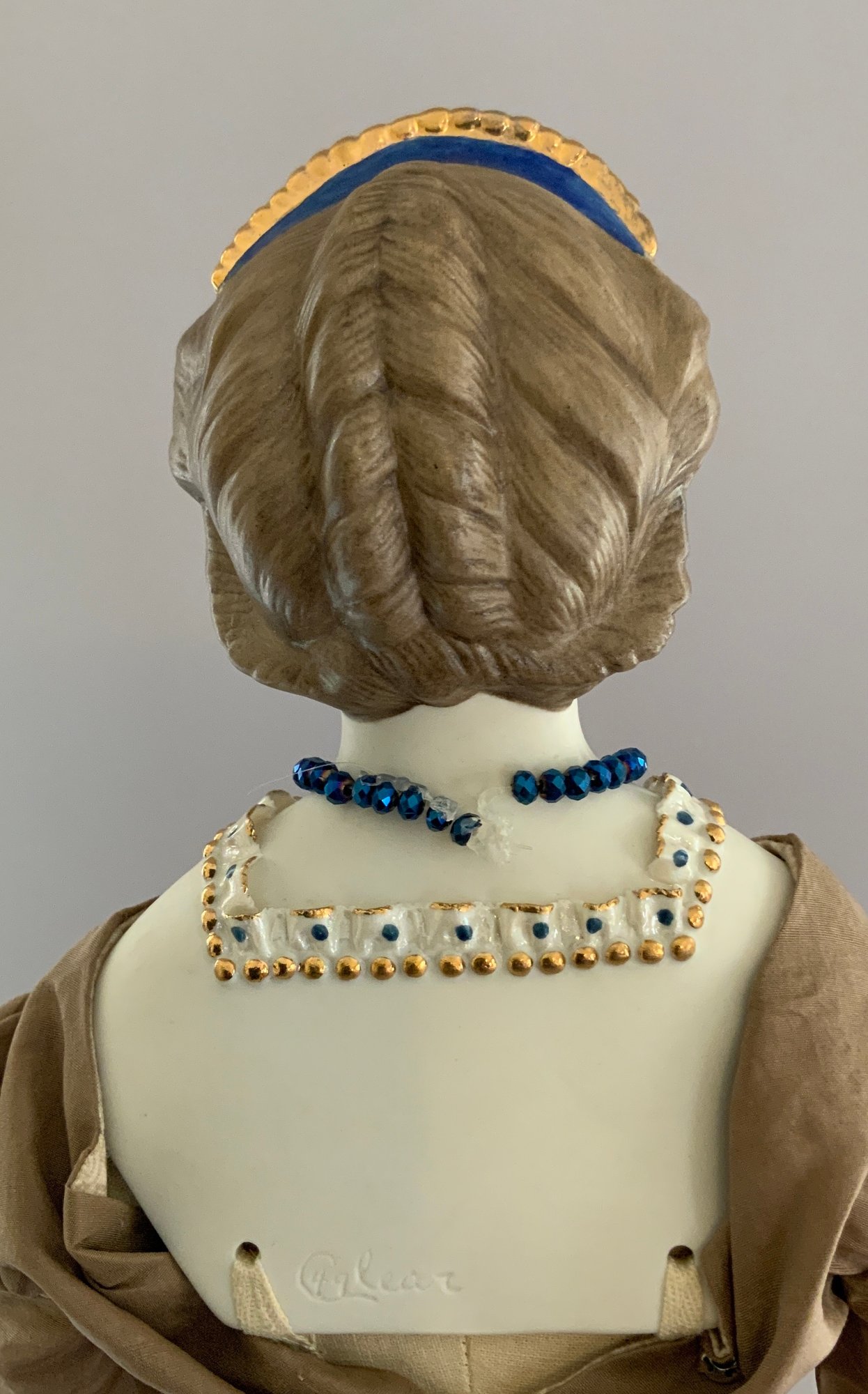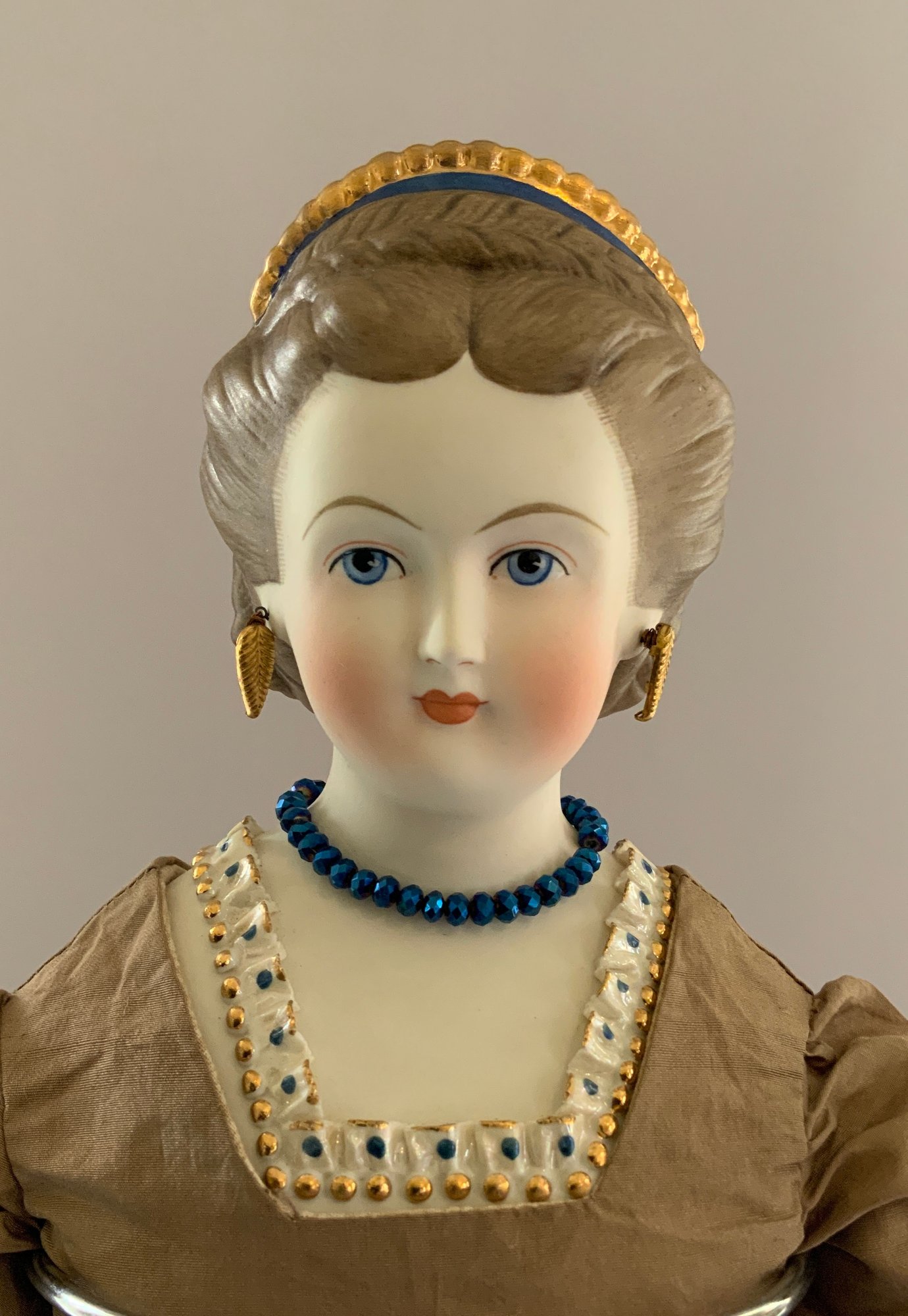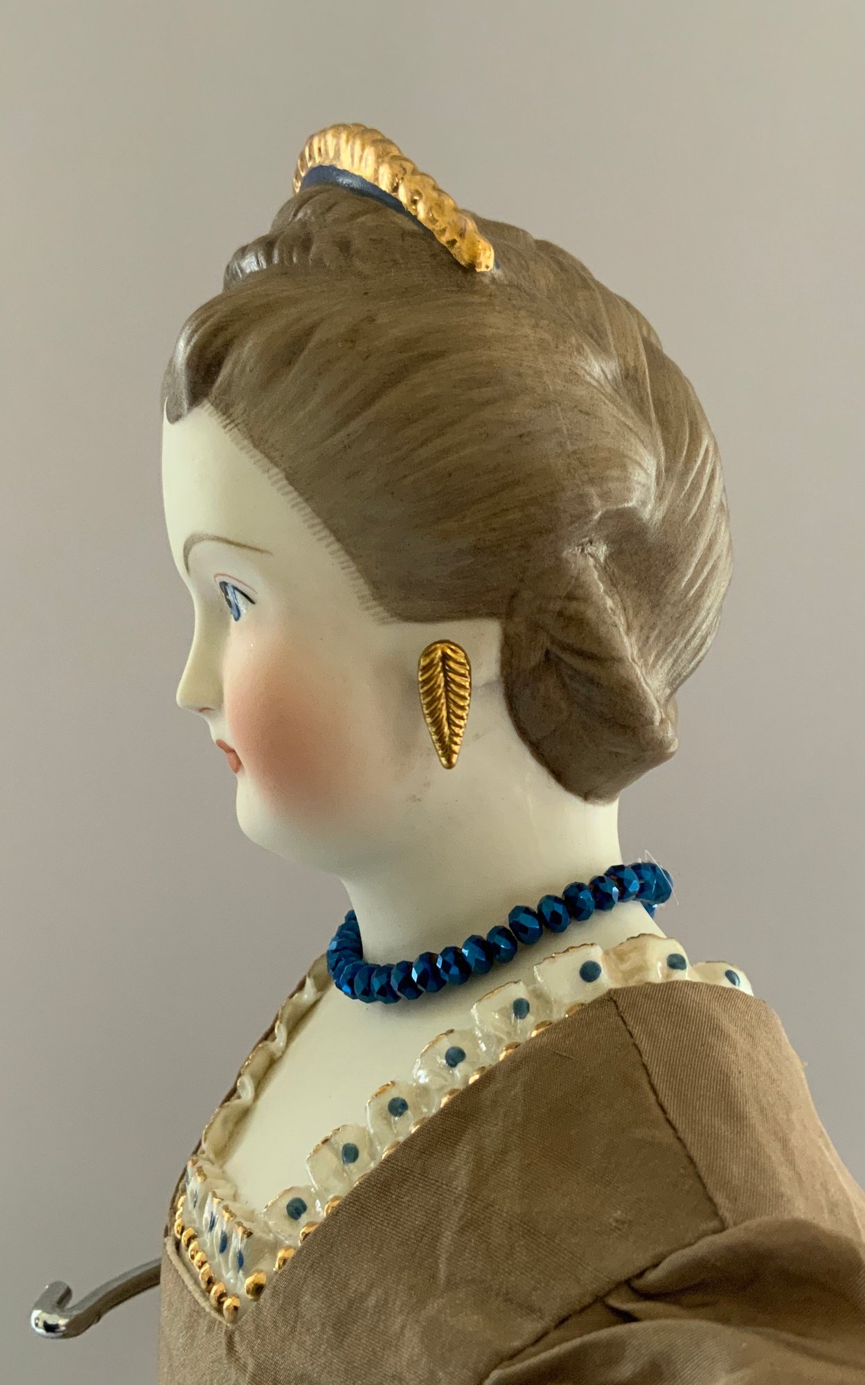 21” Emma Clear shoulder head parian artist doll, painted features, PE, sculpted blonde hair with blue/gold band, fancy bodice, cloth body with parian limbs, blue/gold boots, brown dress