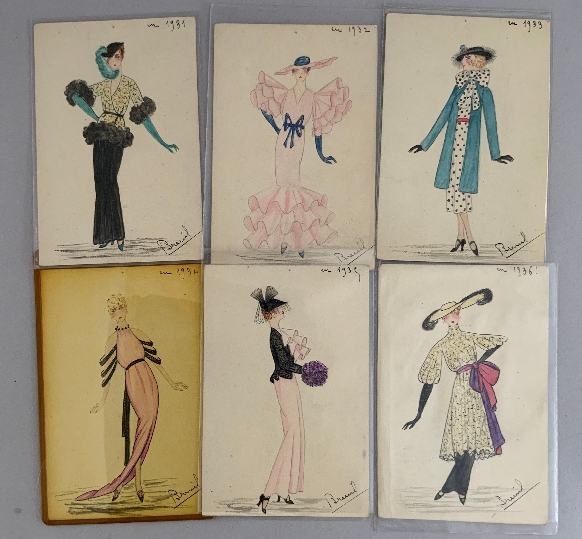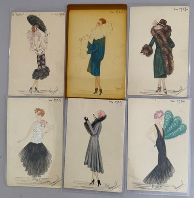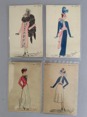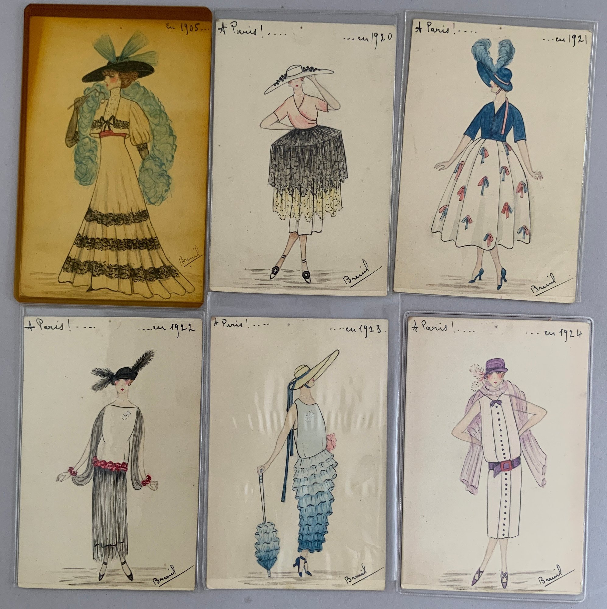 21 – Hand colored French Fashion postcards No39 Lavis B Canson, depicting French Fashions from 1905 & 1920 – 1940, signed lower right Breind?