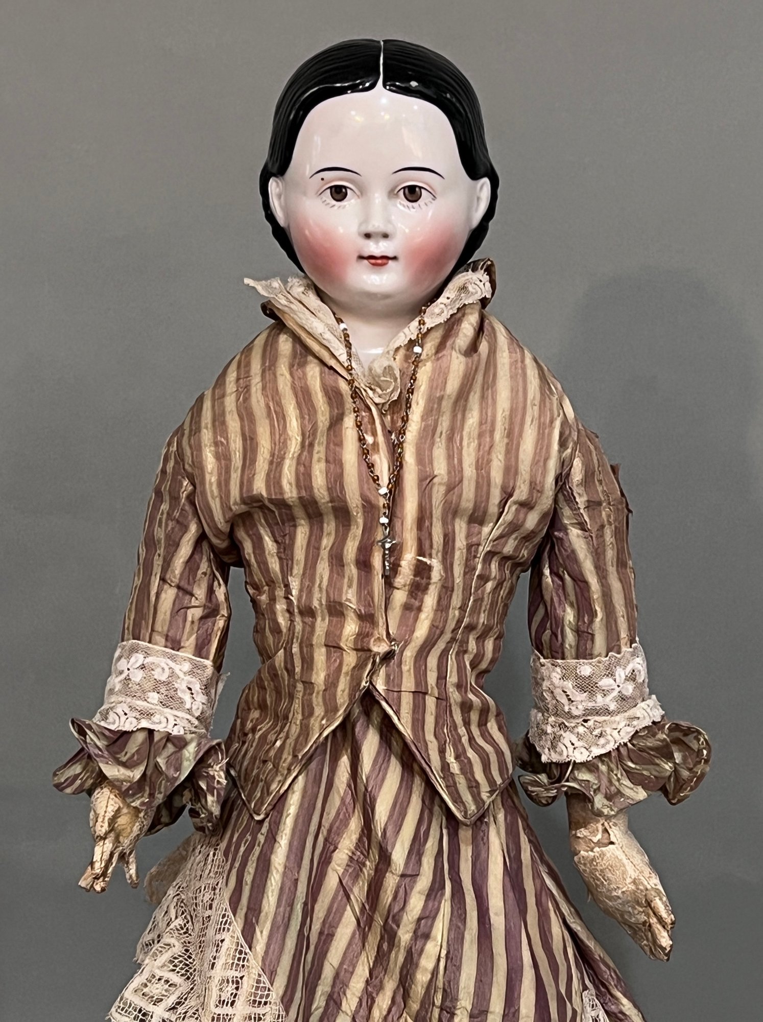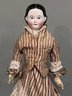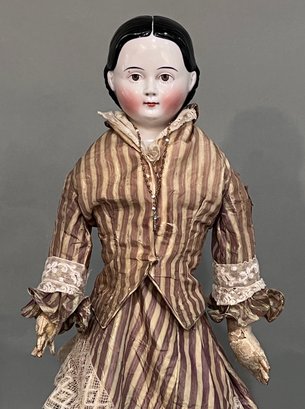 21" KLOSTER VEILSDORF "GREINER-TYPE" CHINA HEAD DOLL - RARE CHINA HEAD DOLL W/ BROWN EYES & PAINTED LOWER LASHES, SMALL BROWN DOT ABOVE RIGHT EYE, MOLDED HAIR WITH EXPOSED EARS (MINOR SCUFFING TO BACK OF HAIR), CLOTH BODY W/ LEATHER ARMS (TEARS IN THE LEATHER ON BOTH ARMS/HANDS), STRIPED 2-PIECE COSTUME