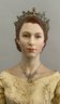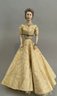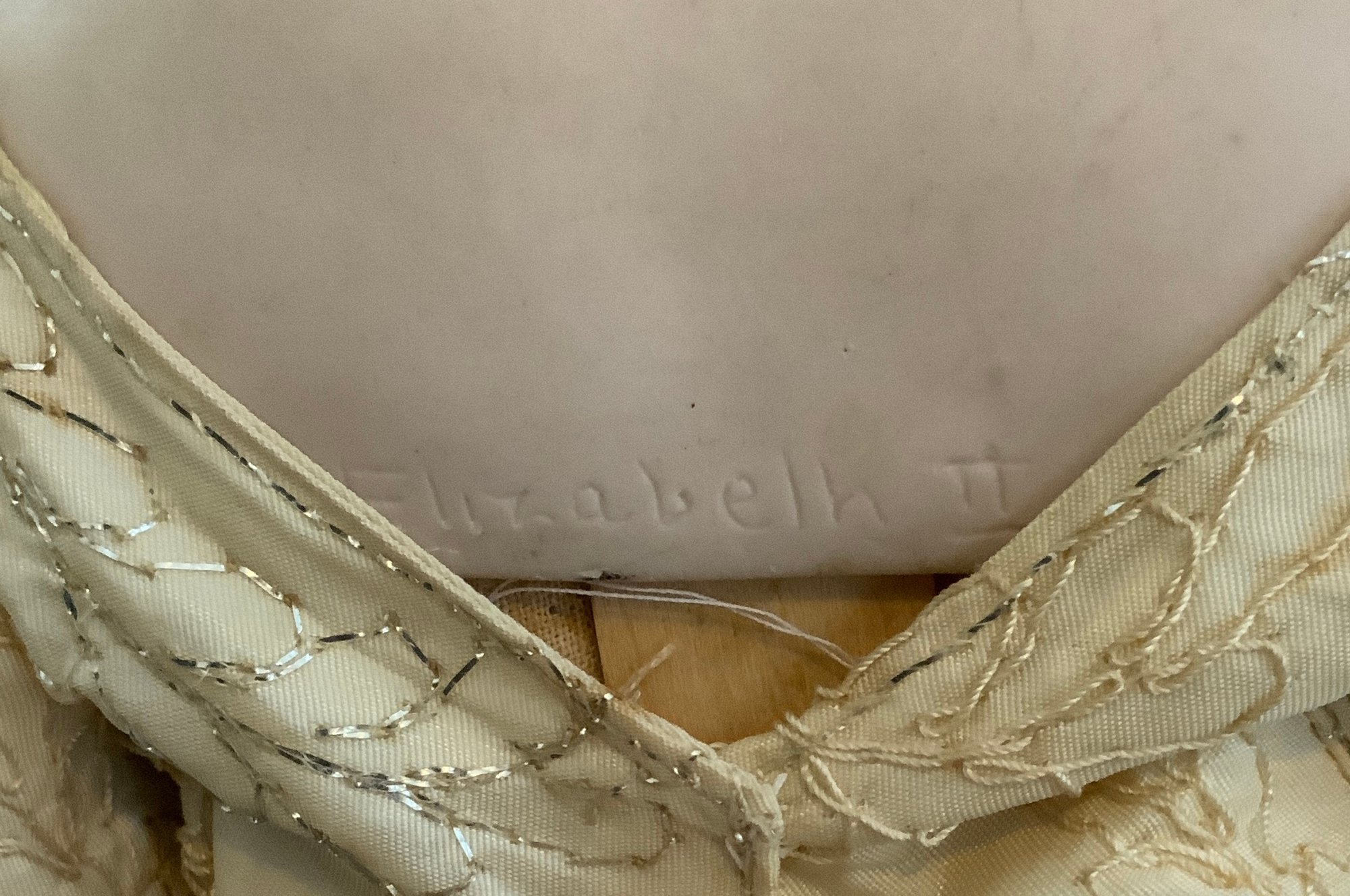 21” Martha Thompson artist doll Elizabeth ll MDT 53, painted features, sculpted hair with crown molded necklace, off white gown with silver thread embroidery, cloth body with bisque arms (shelf dust)