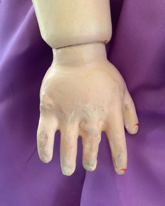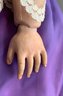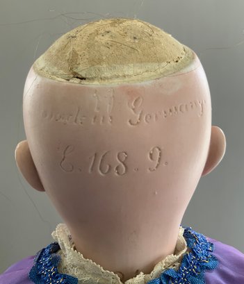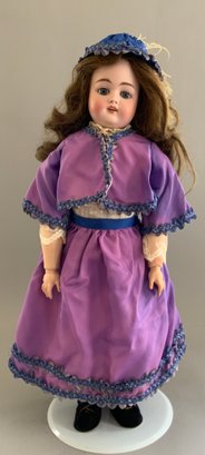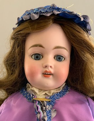 22” Bisque E 168.9, blue glass sleep eyes, OM with teeth, brown mohair wig, BJCB (right forearm is rough, right finger repair), purple outfit, (right cheek rub)