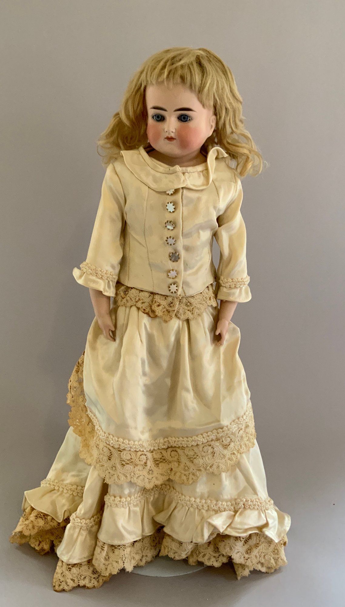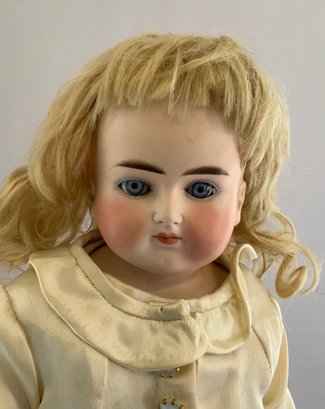 22” Bisque turned shoulder head Wagner & Zetzhe, blue glass sleep eyes, CM, blonde mohair wig, kid body with bisque arms, fancy white silk outfit