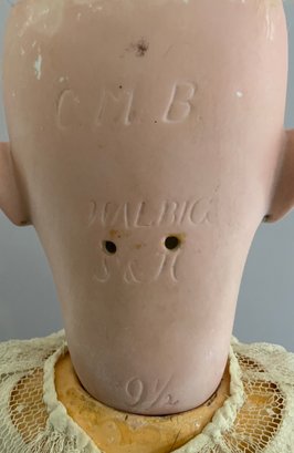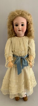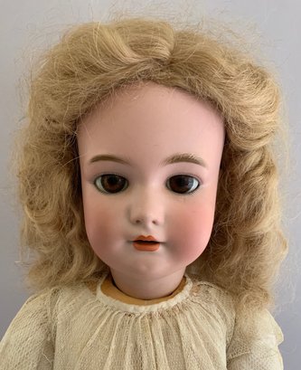 22 ½” CMB Halbig S&H 9 ½, brown glass sleep eyes, OM with teeth, PE, blonde mohair wig, BJCB, white outfit