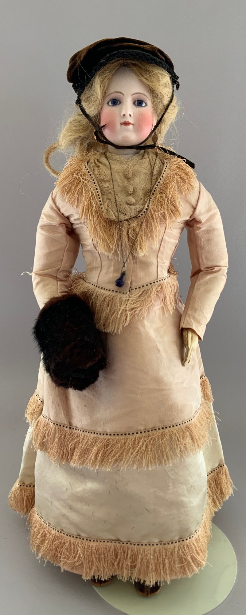 22” French Fashion swivel neck, blue glass eyes, CM, PE, blonde mohair wig, kid body, peach silk dress (staining, fading), brown leather boots, wig glue around rim