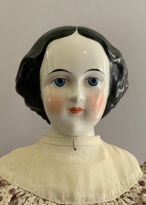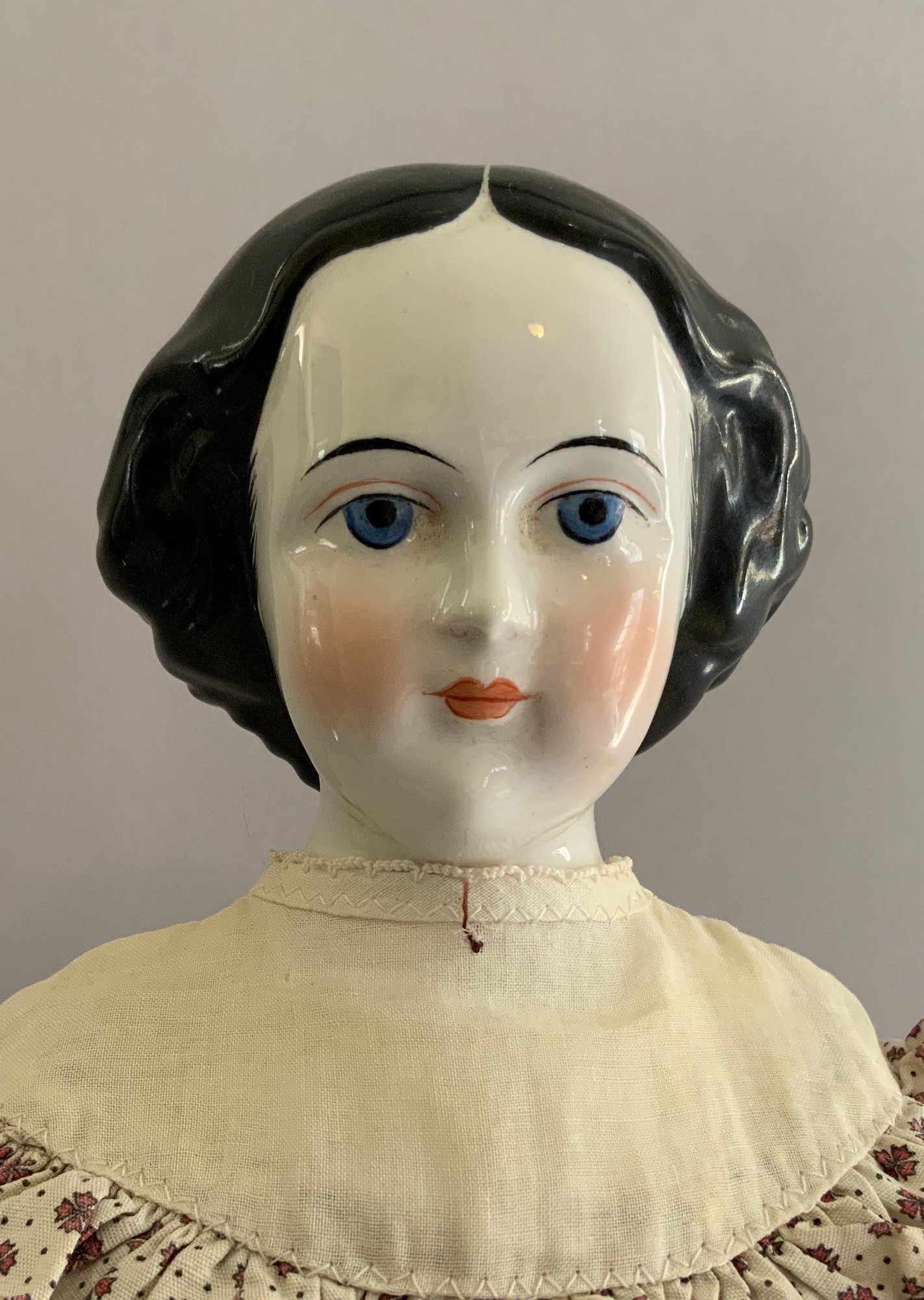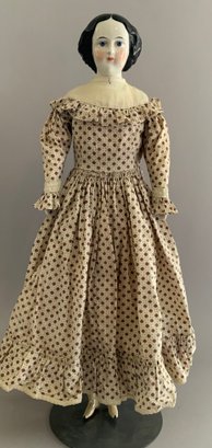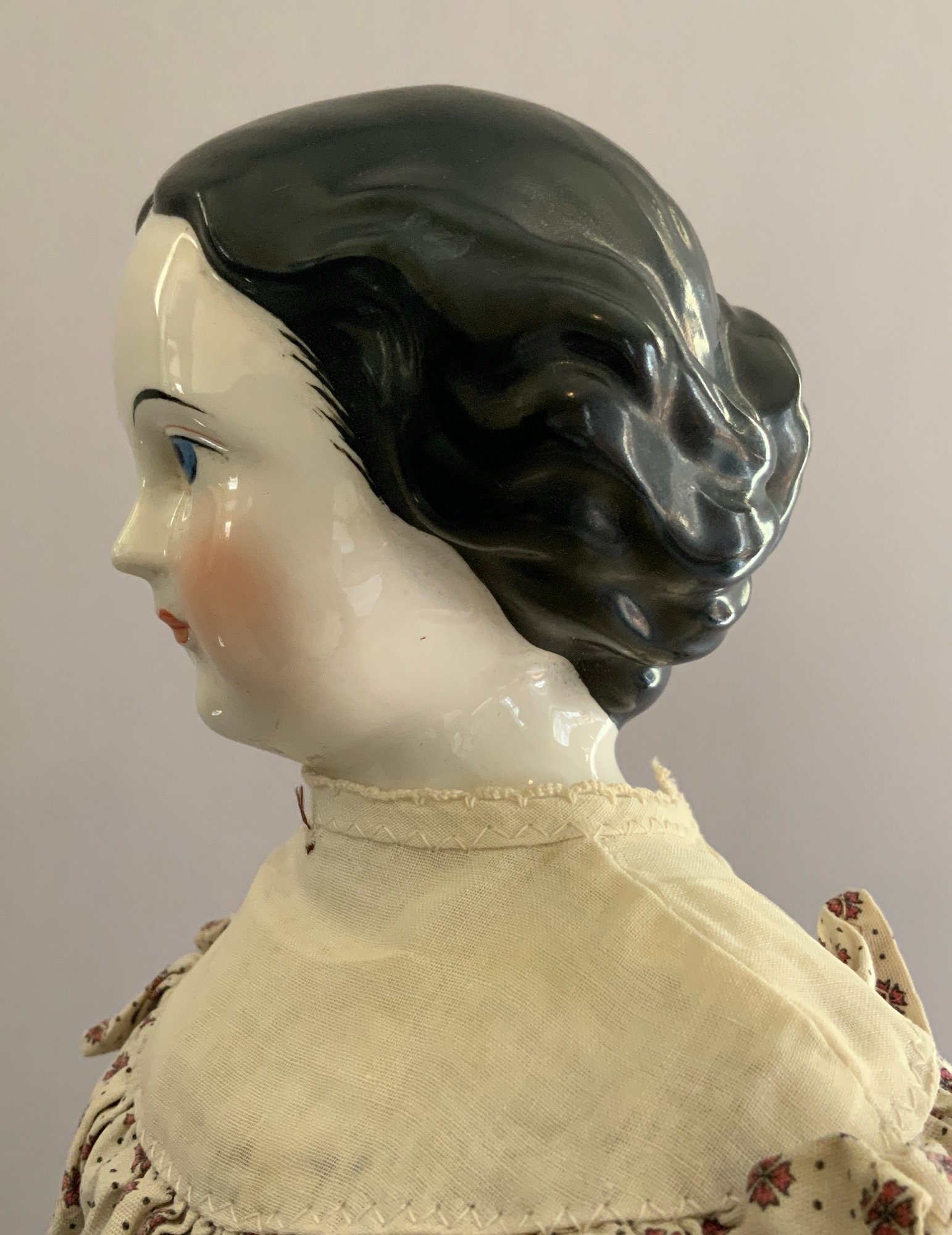 23” Black hair china, center part with bun, painted features, cloth body with china arms, red print dress, painted light yellow boots